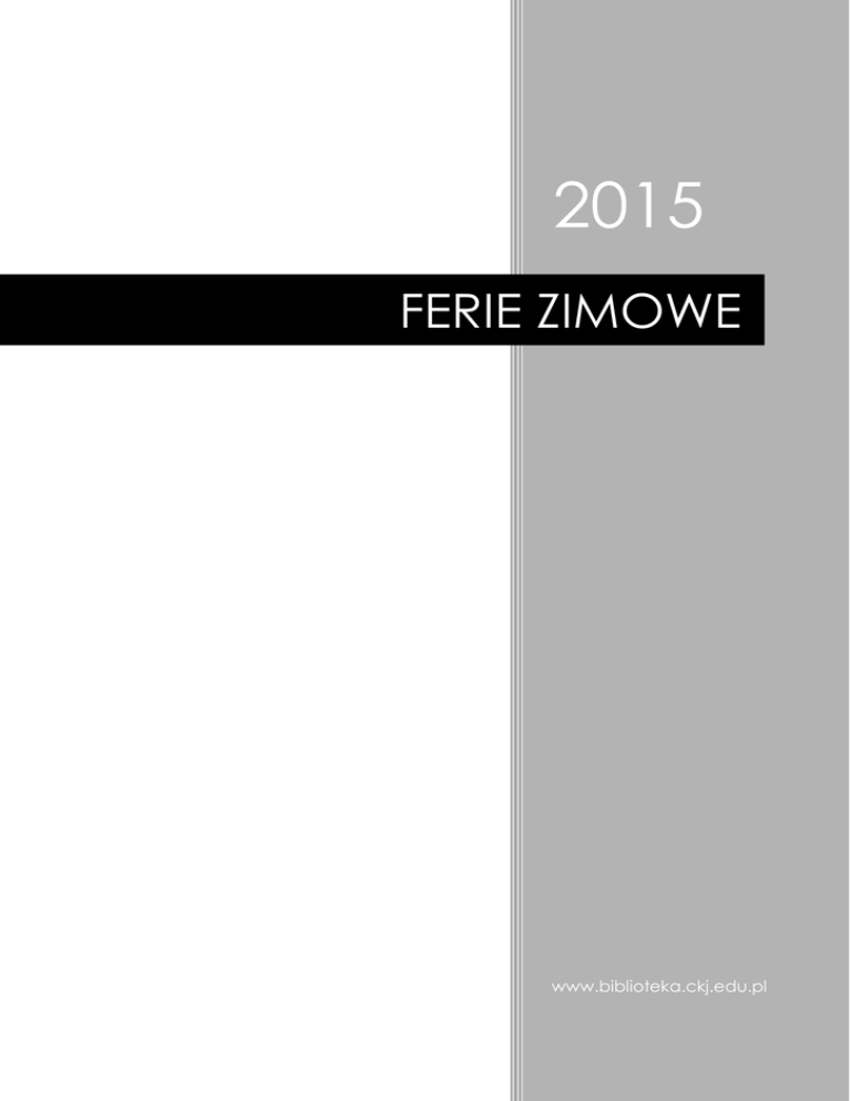 2015 FERIE ZIMOWE www.biblioteka.ckj.edu.pl BIBLIOTEKA MIEJSKO – POWIATOWA W KWIDZYNIE NAZWA: Zajęcia i warsztaty MIESIĄC: luty ROK: 2015 PN: 02.02 WT:03.02 ŚR: 04.02 CZ: 05.02 PT:06.02 BIBLIOTEKA GŁÓWNA 11:00 – 14:00 UL. PIŁSUDSKIEGO 21 82-500 KWIDZYN TEL. 55 279-33-50 Warsztaty plastyczne z Katarzyną Drelich SZTUKA KOMIKSU Warsztaty z recyklingu z Kamilą Malinowską BUTELKOWE ZOO Warsztaty plastyczne z Katarzyną Drelich SZTUKA KARYKATURY WIELKI TURNIEJ BAJKOWY Z NAGRODAMI BIBLIOTECZNY MARATON FILMOWY FILIA NR 1 11:00 – 13:00 UL. SŁOWACKIEGO 18 82-500 KWIDZYN TEL. 55 645-28-99 Jak wykonać? Drzewo genealogiczne „Pamiętajmy” Irena Landau Jak wykonać? Organizer na biurko „Plastusiowy pamiętnik” Maria Kownacka Jak wykonać?. … Zawieszkę na drzwi „Emocje” Tadeusz Ross Jak wykonać? Magiczną kulę „Kryształowa kula. Baśnie znane i lubiane” Jak wykonać? Walentynkową niespodziankę „Romans palce lizać” Grzegorz Kasdepkę FILIA NR 2 11:00 – 13:00 UL. GRUNWALDZKA 54 82-500 KWIDZYN TEL. 55 279-63-34 Podróż do Dinolandii – czyli to i owo o dinozaurach FILIA NR 3 Królowa śniegu – spotkanie z baśnią Andersena 11:00 – 13:00 UL. HALLERA 4 Ferie z Kornelem Makuszyńskim – warsztaty „Panna z mokrą głową” Wyginaj śmiało ciało – zajęcia ruchowe z wykorzystaniem Twistera 82-500 KWIDZYN TEL. 795-480-766 „Zabawa w teatr” – J.Brzechwa „Psie smutki” PN: 09.02 WT:10.02 ŚR: 11.02 CZ: 12.02 PT:13.02 BIBLIOTEKA GŁÓWNA 11:00 – 14:00 UL. PIŁSUDSKIEGO 21 82-500 KWIDZYN TEL. 55 279-33-50 Warsztaty techniczne z Kamilą Malinowską SZYDEŁKOWANIE MIĘDZYNARODOWY DZIEŃ KOTA zajęcia plastyczne i konkursy OD KUKIEŁKI DO SPEKTAKLU MOJE PRZEDSTAWIENIE Warsztaty rzeźby z Piotrem Jakubowskim PŁASKORZEŹBY BAL KARNAWAŁOWY NA ZAKOŃCZENIE FERII ZIMOWYCH I ROZDANIE NAGRÓD FILIA NR 1 11:00 – 13:00 UL. SŁOWACKIEGO 18 82-500 KWIDZYN TEL. 55 645-28-99 FILIA NR 2 11:00 – 13:00 UL. GRUNWALDZKA 54 82-500 KWIDZYN TEL. 55 279-63-34 82-500 KWIDZYN TEL. 795-480-766 O kotach i psach – zajęcia literackie nie tylko dla miłośników zwierząt FILIA NR 3 Dziewczynka z zapałami – spotkanie z baśnią Andersena 11:00 – 13:00 Ferie z bohaterami „Opowieści z Narni” – warsztaty plastyczne UL. HALLERA 4 Rewizja w bibliotece – gra na terenie biblioteki „Mali detektywi” 1 BIBLIOTEKA MIEJSKO – POWIATOWA W KWIDZYNIE NAZWA: Turnieje PlayStation MIESIĄC: luty PN: 09.02 WT: ----- BIBLIOTEKA GŁÓWNA 14:00 – 17:00 Zawody dla najmłodszych Turniej Angry Birdds Wiek: 6-8 lat ŚR: 11.02 UL. PIŁSUDSKIEGO 21 BIBLIOTECZNY RAJD Turniej WRC3 Wiek: 8-14 lat ROK: 2015 CZ: ----- PT:06.02 82-500 KWIDZYN TEL. 55 279-33-50 PIŁKARSKIE ROZGRYWNKI PUCHAROWE Turniej Fifa 15 Wiek: 8-14 lat W turnieju mogą wziąć udział zawodnicy, którzy zgłoszą swój udział telefonicznie lub osobiście w czytelni dla dzieci Po 16 zawodników rywalizować będzie w wybranym przez siebie turnieju o atrakcyjne nagrody. Biblioteka Miejsko –Powiatowa w Kwidzynie oferuje możliwość korzystania z gier PlayStation Movie między innymi: 2 BIBLIOTEKA MIEJSKO – POWIATOWA W KWIDZYNIE NAZWA: Gry Planszowe MIESIĄC: luty ROK: 2015 Biblioteka Miejsko –Powiatowa w Kwidzynie oferuje wszystkim dzieciom możliwość korzystania z gier planszowych. Chcielibyśmy aby najmłodsi mieszkańcy Kwidzyna korzystali z gier planszowych w tym samym zakresie co z komputerów. Wzmocni to jakość relacji rówieśniczych, nauczy negocjacji, umiejętności wygrywania i przegrywania. Z ponad 40 gier planszowych można korzystać w godzinach pracy biblioteki od 10:00 do 18:00. Między innymi: 3 BIBLIOTEKA MIEJSKO – POWIATOWA W KWIDZYNIE NAZWA: Sala dla maluchów MIESIĄC: luty ROK: 2015 W godzinach pracy biblioteki [codziennie od 10:00 do 18:00 i w soboty od 10:00 do 16:00] w czytelni dla dzieci czynna jest sala „Przyjaźni Maluchom”. Z Sali „Przyjaźni Maluchom” można korzystać bezpłatnie. Sala przeznaczona jest dla rodziców i dzieci w wieku od 0 do 5 lat. Wyposażona została w przewijak dla dzieci, basen z kulkami, zabawki interaktywne, bujak, miejsce dla mam karmiących, regały z książkami dostosowanymi do wieku od 0 do 5 lat. Uwaga: W związku z koniecznością remontu w czytelni dla dorosłych i wypożyczalni dla dorosłych [ul.Piłsudskiego 1] nastąpią zmiany w czasie udostępniania zbiorów w tych dwóch działach. Dział: wypożyczalnia dla dorosłych będzie nieczynny od 2 do 8 lutego, Dział: czytelnia dla dorosłych będzie nieczynny od 9 do 15 lutego. Czytelnicy, którzy zechcą zwrócić książki w tym terminie mogą skorzystać z usługi „zwrot w dowolnym miejscu”. Zapraszamy też do korzystania z pozostałych agend biblioteki. Ponadto informujemy, iż z dniem 16 lutego br. czytelnia dla dorosłych zostanie przekształcona w wypożyczalnię naukową. Wszystkie zbiory zgromadzone w wypożyczalni naukowej będzie można wypożyczać do domu na ogólnych zasadach. Z wypożyczalni naukowej korzystać będą mogli wszyscy czytelnicy Biblioteki Miejsko – Powiatowej w Kwidzynie. 4