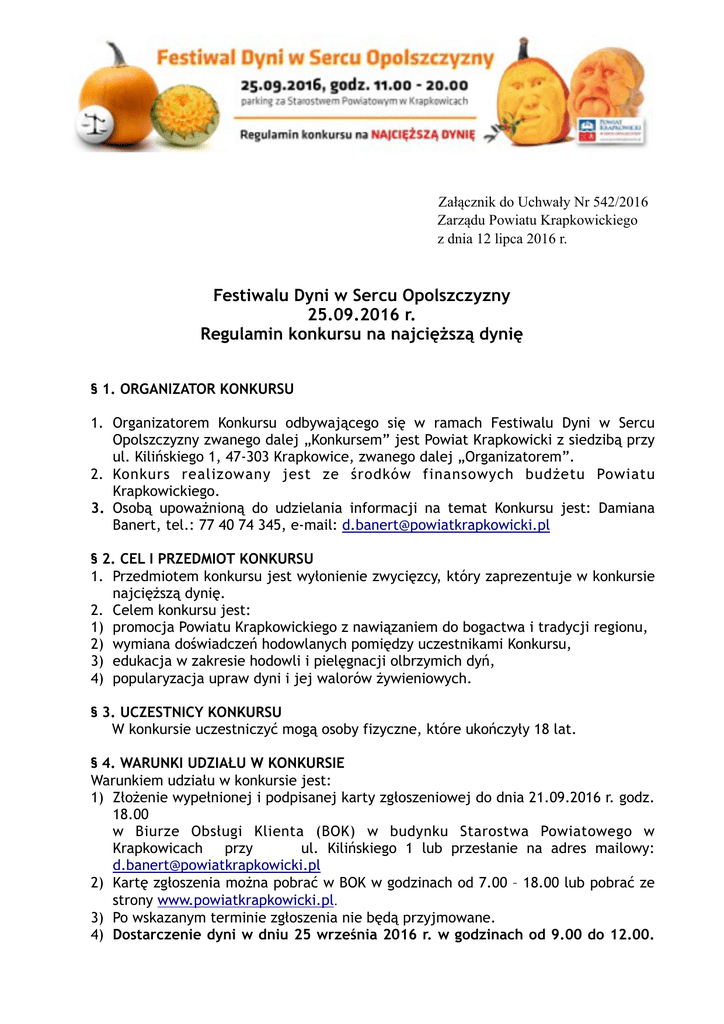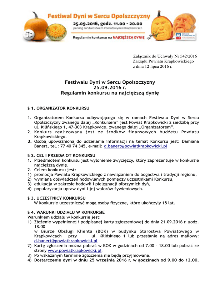 ! Załącznik do Uchwały Nr 542/2016 Zarządu Powiatu Krapkowickiego z dnia 12 lipca 2016 r. Festiwalu Dyni w Sercu Opolszczyzny 25.09.2016 r. Regulamin konkursu na najcięższą dynię § 1. ORGANIZATOR KONKURSU 1. Organizatorem Konkursu odbywającego się w ramach Festiwalu Dyni w Sercu Opolszczyzny zwanego dalej „Konkursem” jest Powiat Krapkowicki z siedzibą przy ul. Kilińskiego 1, 47-303 Krapkowice, zwanego dalej „Organizatorem”. 2. Konkurs realizowany jest ze środków finansowych budżetu Powiatu Krapkowickiego. 3. Osobą upoważnioną do udzielania informacji na temat Konkursu jest: Damiana Banert, tel.: 77 40 74 345, e-mail: [email protected] § 2. CEL I PRZEDMIOT KONKURSU 1. Przedmiotem konkursu jest wyłonienie zwycięzcy, który zaprezentuje w konkursie najcięższą dynię. 2. Celem konkursu jest: 1) promocja Powiatu Krapkowickiego z nawiązaniem do bogactwa i tradycji regionu, 2) wymiana doświadczeń hodowlanych pomiędzy uczestnikami Konkursu, 3) edukacja w zakresie hodowli i pielęgnacji olbrzymich dyń, 4) popularyzacja upraw dyni i jej walorów żywieniowych. § 3. UCZESTNICY KONKURSU W konkursie uczestniczyć mogą osoby fizyczne, które ukończyły 18 lat. § 4. WARUNKI UDZIAŁU W KONKURSIE Warunkiem udziału w konkursie jest: 1) Złożenie wypełnionej i podpisanej karty zgłoszeniowej do dnia 21.09.2016 r. godz. 18.00 w Biurze Obsługi Klienta (BOK) w budynku Starostwa Powiatowego w Krapkowicach przy ul. Kilińskiego 1 lub przesłanie na adres mailowy: [email protected] 2) Kartę zgłoszenia można pobrać w BOK w godzinach od 7.00 – 18.00 lub pobrać ze strony www.powiatkrapkowicki.pl. 3) Po wskazanym terminie zgłoszenia nie będą przyjmowane. 4) Dostarczenie dyni w dniu 25 września 2016 r. w godzinach od 9.00 do 12.00. 5) 6) 7) 8) na Festiwal Dyni w Sercu Opolszczyzny, który odbywać się będzie w Krapkowicach przy ul. Kilińskiego 1 (parking za Starostwem Powiatowym w Krapkowicach). Każdy uczestnik może dostarczyć tylko jedną dynię do konkursu na najcięższą dynię. Podpisanie i przekazanie zgłoszenia udziału jest równoznaczne z wyrażeniem zgody na postanowienia niniejszego Regulaminu, z którymi uczestnik obowiązany jest się zapoznać. W konkursie nie mogą uczestniczyć członkowie komisji konkursowej ani członkowie ich rodzin. Uczestnictwo w konkursie jest bezpłatne. § 5. ORGANIZACJA ORAZ PRZEBIEG KONKURSU 1. Zarząd Powiatu Krapkowickiego: 1) powołuje lub odwołuje Komisję Konkursową, która składa się z co najmniej 3 osób, 2) unieważnia konkurs, w dowolnym czasie z następujących przyczyn: a) nie dostarczono co najmniej 2 dyń, b) konkurs nie został rozstrzygnięty przez komisję niezależnie od przyczyn. 2. Przebieg i zasady Konkursu: 1) Uczestnicy Konkursu zobowiązani są do dostarczenia dyni w dniu 25.09.2016 r. w godzinach od 9.00 do 12.00 na miejsce organizacji wydarzenia tj. Krapkowice, ul. Kilińskiego 1, 2) Palety do prezentacji oraz wózek widłowy do rozładunku zapewnia Organizator, 3) Laureaci konkursu zostaną nagrodzeni podczas Festiwalu w dniu 25.09.2016 r. w miejscu trwania wydarzenia tj. Krapkowice, ul. Kilińskiego 1, 4) Dynie muszą być zdrowe, 5) Dynie nie mogą mieć następującego koloru: szary, niebieski, zielony, 6) Dynie nie mogą być uszkodzone – bez pęknięć, wnęk, obcych ciał, nie mogą mieć śladów pleśni oraz środków grzybobójczych, 7) Łodyga jest dozwolona, winorośla natomiast muszą być przycięte po obu stronach na długość 2,5 cm, 8) Każdy podejrzany element powoduje dyskwalifikację jak m.in.: środki grzybobójcze, kamienie, piasek, wosk, 9) Ważenie dyń rozpoczyna się o godz. 12.30, 10)Ogłoszenie wyników oraz wręczenie nagród ok. godz. 15.00. § 6. SKŁAD I ZADANIA KOMISCJI 1. W skład Komisji wchodzą: 1) Przedstawiciel Powiatu Krapkowickiego, 2) Przedstawiciel Opolskiego Doradztwa Rolniczego w Łosiowie, 3) Specjalista z zakresu gleboznawstwa i ochrony gleb, 4) Przedstawiciel ogrodnictwa, szkółkarz bądź ogrodnik, 5) Przedstawiciel mediów. 2. 1) 2) 3) Zadania Komisji ocena jakości dyni, zarejestrowanie wyników ważenia, Sporządzenie protokołu zawierającego wyniki ważenia, Przydzielenie poszczególnych miejsc. 3. Werdykt Komisji jest ostateczny. § 7. OGŁOSZENIE WYNIKÓW I NAGRODY 1. 2. 3. 4. Nagrodami w konkursie są nagrody pieniężne. Laureat każdego z miejsc otrzymuje nagrodę pieniężną. Ogłoszenie wyników nastąpi 25 września 2016 r. Od nagród o wartości przekraczającej 760 zł nalicza się zryczałtowany podatek dochodowy w wysokości 10% kwoty nagrody. 5. Dopuszcza się nagrodzenie wszystkich uczestników konkursu. § 8. ADMINISTROWANIE DANYMI OSOBOWYMI 1. Administratorem danych osobowych zebranych przed i w trakcie trwania Konkursu jest Organizator. 2. 1) 2) 3) 4) Dane osobowe gromadzone są przez Organizatora wyłącznie na potrzeby: realizacji Konkursu, wyłonienia laureatów Konkursu, wydania nagród, podania do wiadomości publicznej imienia i nazwiska laureata Konkursu. § 9. USTALENIA KOŃCOWE 1. Organizator nie zwraca kosztów podróży uczestnikom. 2. Niniejszy Regulamin jest jedynym dokumentem określającym zasady Konkursu. 3. Organizator zastrzega sobie prawo do opublikowania imion, nazwisk, zdjęć i informacji o zwycięzcach i uczestnikach konkursu. 4. Organizator konkursu zastrzega sobie prawo do zamieszczania informacji w swoich materiałach i kampaniach promocyjnych, jako element promujący. 5. Uczestnictwo w konkursie jest jednoznaczne z wyrażeniem zgody na bezpłatne wykorzystanie swojego wizerunku oraz zdjęć dyni do celów promocyjnych organizatorów. 6. Wszystkie kwestie, których nie ustala regulamin, ustala Organizator.