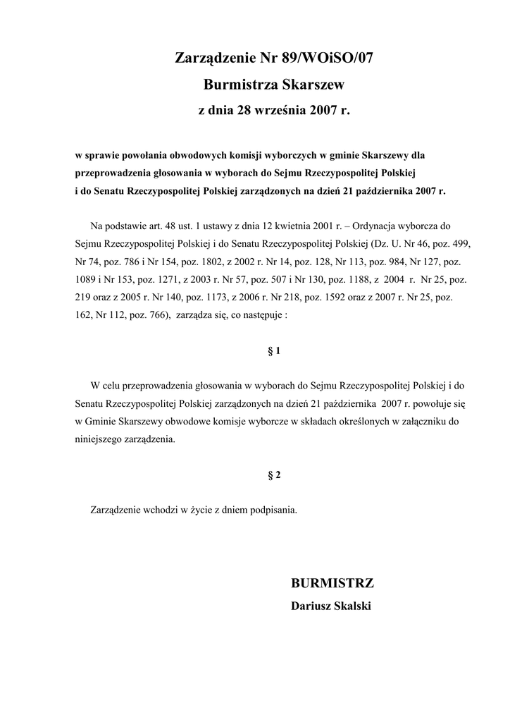Zarządzenie Nr 89/WOiSO/07 Burmistrza Skarszew z dnia 28