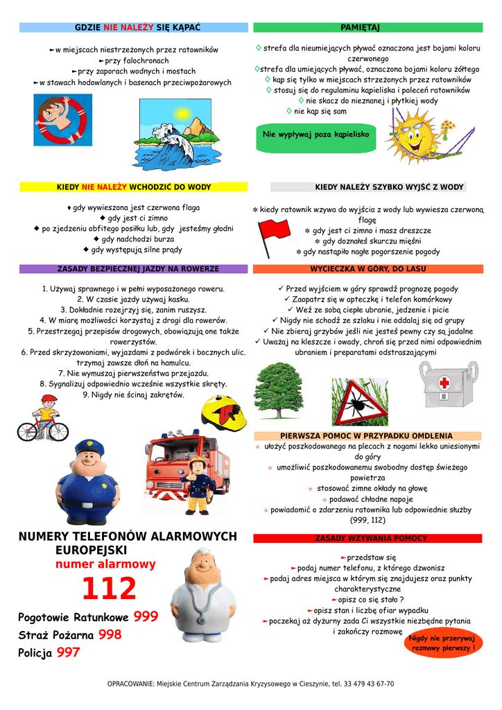 GDZIE NIE NALEŻY SIĘ KĄPAĆ ►w miejscach niestrzeżonych przez ratowników ►przy falochronach ►przy zaporach wodnych i mostach ►w stawach hodowlanych i basenach przeciwpożarowych PAMIĘTAJ ◊ strefa dla nieumiejących pływać oznaczona jest bojami koloru czerwonego ◊strefa dla umiejących pływać, oznaczona bojami koloru żółtego ◊ kąp się tylko w miejscach strzeżonych przez ratowników ◊ stosuj się do regulaminu kąpieliska i poleceń ratowników ◊ nie skacz do nieznanej i płytkiej wody ◊ nie kąp się sam Nie wypływaj poza kąpielisko KIEDY NIE NALEŻY WCHODZIĆ DO WODY ♦ gdy wywieszona jest czerwona flaga ♦ gdy jest ci zimno ♦ po zjedzeniu obfitego posiłku lub, gdy jesteśmy głodni ♦ gdy nadchodzi burza ♦ gdy występują silne prądy ZASADY BEZPIECZNEJ JAZDY NA ROWERZE 1. Używaj sprawnego i w pełni wyposażonego roweru. 2. W czasie jazdy używaj kasku. 3. Dokładnie rozejrzyj się, zanim ruszysz. 4. W miarę możliwości korzystaj z drogi dla rowerów. 5. Przestrzegaj przepisów drogowych, obowiązują one także rowerzystów. 6. Przed skrzyżowaniami, wyjazdami z podwórek i bocznych ulic. trzymaj zawsze dłoń na hamulcu. 7. Nie wymuszaj pierwszeństwa przejazdu. 8. Sygnalizuj odpowiednio wcześnie wszystkie skręty. 9. Nigdy nie ścinaj zakrętów. KIEDY NALEŻY SZYBKO WYJŚĆ Z WODY ✼ kiedy ratownik wzywa do wyjścia z wody lub wywiesza czerwoną flagę ✼ gdy jest ci zimno i masz dreszcze ✼ gdy doznałeś skurczu mięśni ✼ gdy nastąpiło nagłe pogorszenie pogody WYCIECZKA W GÓRY, DO LASU ✓ Przed wyjściem w góry sprawdź prognozę pogody ✓ Zaopatrz się w apteczkę i telefon komórkowy ✓ Weź ze sobą ciepłe ubranie, jedzenie i picie ✓ Nigdy nie schodź ze szlaku i nie oddalaj się od grupy ✓ Nie zbieraj grzybów jeśli nie jesteś pewny czy są jadalne ✓ Uważaj na kleszcze i owady, chroń się przed nimi odpowiednim ubraniem i preparatami odstraszającymi PIERWSZA POMOC W PRZYPADKU OMDLENIA ✫ ułożyć poszkodowanego na plecach z nogami lekko uniesionymi do góry ✫ umożliwić poszkodowanemu swobodny dostęp świeżego powietrza ✫ stosować zimne okłady na głowę ✫ podawać chłodne napoje ✫ powiadomić o zdarzeniu ratownika lub odpowiednie służby (999, 112) NUMERY TELEFONÓW ALARMOWYCH EUROPEJSKI numer alarmowy 112 Pogotowie Ratunkowe Straż Pożarna 998 999 ZASADY WZYWANIA POMOCY ►przedstaw się ►podaj numer telefonu, z którego dzwonisz ►podaj adres miejsca w którym się znajdujesz oraz punkty charakterystyczne ►opisz co się stało ? ►opisz stan i liczbę ofiar wypadku ►poczekaj aż dyżurny zada Ci wszystkie niezbędne pytania i zakończy rozmowę Policja 997 OPRACOWANIE: Miejskie Centrum Zarządzania Kryzysowego w Cieszynie, tel. 33 479 43 67-70 Nigdy nie przerywaj rozmowy pierwszy !