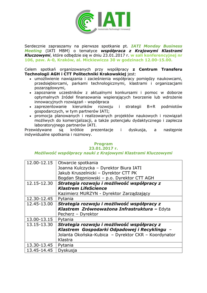 Serdecznie zapraszamy na pierwsze spotkanie pt. IATI Monday Business Meeting (IATI MBM) o tematyce współpraca z Krajowymi Klastrami Kluczowymi, które odbędzie się w dniu 23.01.2017 r. w sali konferencyjnej nr 106, paw. A-0, Kraków, al. Mickiewicza 30 w godzinach 12.00-15.00. Celem spotkań organizowanych przy współpracy z Centrum Transferu Technologii AGH i CTT Politechniki Krakowskiej jest: umożliwienie nawiązania i zacieśnienia współpracy pomiędzy naukowcami, przedsiębiorcami, parkami technologicznymi, klastrami i organizacjami pozarządowymi, zapoznanie uczestników z aktualnymi konkursami i pomoc w doborze optymalnych źródeł finansowania wspierających tworzenie lub wdrożenie innowacyjnych rozwiązań - współpraca zaprezentowanie kierunków rozwoju i strategii B+R podmiotów gospodarczych, w tym partnerów IATI; promocja planowanych i realizowanych projektów naukowych i rozwiązań możliwych do komercjalizacji, a także potencjału dydaktycznego i zaplecza laboratoryjnego partnerów IATI. Przewidywane są krótkie prezentacje i dyskusja, a następnie indywidualne spotkania i rozmowy. Program 23.01.2017 r. Możliwość współpracy nauki z Krajowymi Klastrami Kluczowymi 12.00-12.15 12.15-12.30 12.30-12.45 12.45-13.00 13.00-13.15 13.15-13.30 13.30-13.45 13.45-14.45 Otwarcie spotkania Joanna Kulczycka – Dyrektor Biura IATI Jakub Kruszelnicki – Dyrektor CTT PK Bogdan Stępniowski – p.o. Dyrektor CTT AGH Strategia rozwoju i możliwość współpracy z Klastrem LifeScience Kazimierz MURZYN - Dyrektor Zarządzający Pytania Strategia rozwoju i możliwość współpracy z Klastrem Zrównoważona Infrastruktura – Edyta Pecherz – Dyrektor Pytania Strategia rozwoju i możliwość współpracy z Klastrem Gospodarki Odpadowej i Recyklingu – Jolanta Okońska-Kubica – Dyrektor CKR – Koordynator Klastra Pytania Dyskusja Krajowy Klaster Kluczowy – to klaster o istotnym znaczeniu dla gospodarki kraju i wysokiej konkurencyjności międzynarodowej; krajowe klastry kluczowe są identyfikowane na poziomie krajowym, m.in. w oparciu o kryteria dotyczące: masy krytycznej, potencjału rozwojowego i innowacyjnego, dotychczasowej i planowanej współpracy oraz doświadczenia i potencjału koordynatora (http://www.pi.gov.pl/klastry/chapter_95922.asp). Źródło:https://www.mr.gov.pl/strony/zadania/wsparcie-przedsiebiorczosci/innowacyjno sc/krajowe-klastry-kluczowe/wydarzenia/ Klaster Zrównoważona Infrastruktura powstał z myślą o wsparciu mikro i małych przedsiębiorców we wdrażaniu innowacyjnych rozwiązań z zakresu technologii autonomicznego budownictwa, odnawialnych źródeł energii i nowoczesnych rozwiązań automatyki użytkowej. Obecnie jest to największy w Polsce klaster propagujący i wdrażający dostępne cenowo energooszczędne technologie budowlane, od 2016 uznany przez Ministerstwo Rozwoju za Krajowy Klaster Kluczowy. W jego skład wchodzi ok. 100 podmiotów, w tym oprócz przedsiębiorstw z branży budowlanej, samorządów również największe krakowskie uczelnie tj: AGH, PK, UJ. Istotą jego działania jest tworzenie sieci współpracy i wspieranie innowacji w obszarze budownictwa zrównoważonego, a także promocja najwyższej efektywności energetycznej w budownictwie, osiągniętej dzięki wykorzystaniu autorskich rozwiązań konstrukcyjnych, technologicznych oraz pracy przedsiębiorców skupionych w naszym Klastrze. Partnerami naukowym są m.in. Instytut Metalurgii i Inżynierii Materiałowej PAN, Instytut Odlewnictwa, Instytut Zaawansowanych Technologii Wytwarzania, Laboratorium OZE AGH w Miękini. Głównym produktem kreowanym w ramach łańcucha wartości w klastrze jest inteligentny budynek energooszczędny lub pasywny. Koordynatorem Klastra jest Instytut Doradztwa Sp. z o.o., akredytowany Ośrodek Innowacji przy Ministerstwie Rozwoju, a także ogólnopolski ośrodek szkoleniowo-doradczy oraz specjalizujący się w branży OZE i promowaniu technologii energooszczędnych. Klaster LifeScience Kraków powstał w 2006 r., jako inicjatywa kilkudziesięciu małopolskich przedsiębiorstw, które połączyła wizja rozwoju innowacyjności w sektorze life science. Członkami Klastra są instytucje oraz firmy z regionu związane z biotechnologią, farmacją, medycyną i ochroną środowiska. Do celów Klastra należy podnoszenie efektywności wykorzystania zasobów naukowych, kulturowych i gospodarczych istniejących w Małopolsce. Istotą jego działania jest tworzenie sieci współpracy w obszarze life science oraz wspieranie nowatorskich rozwiązań. Misją Klastra jest tworzenie warunków dla skutecznej komercjalizacji wyników prac badawczych jednostek badawczo-rozwojowych. Klaster stanowi platformę do łączenia i rozwijania zasobów z obszaru life science w celu ich efektywnego wykorzystania w przestrzeni innowacyjnej gospodarki Inicjatywa powstania Klastra Gospodarki Odpadowej i Recyklingu zrodziła się w 2011 r. Firmy z branży odpadowej prowadzące działalność w Skierniewicach w sierpniu 2011 r. zadecydowały o utworzeniu klastra gospodarki odpadowej i recyklingu obejmującego swoich zasięgiem teren województwa łódzkiego i mazowieckiego. Klaster powstał w oparciu o dotychczasową współpracę przedsiębiorstw zajmujących się gospodarką odpadami z firmami świadczącymi usługi doradcze, jednostkami badawczo-rozwojowymi oraz instytucjami otoczenia biznesu.Klaster ma charakter ponadregionalny. Obejmuje swoim zasięgiem i oddziaływaniem teren województw: dolnośląskiego, kujawskopomorskiego, lubelskiego, łódzkiego, mazowieckiego, małopolskiego, śląskiego, świętokrzyskiego, wielkopolskiego i zachodniopomorskiego. Z uwagi na rosnące zainteresowanie przystąpieniem do klastra przedsiębiorstw i organizacja spoza wymienionych województw, przewiduje się dalszy terytorialny rozwój klastra. Serdecznie zapraszamy partnerów naukowych i przemysłowych IATI – podczas dyskusji będzie możliwość krótkiego zaprezentowan