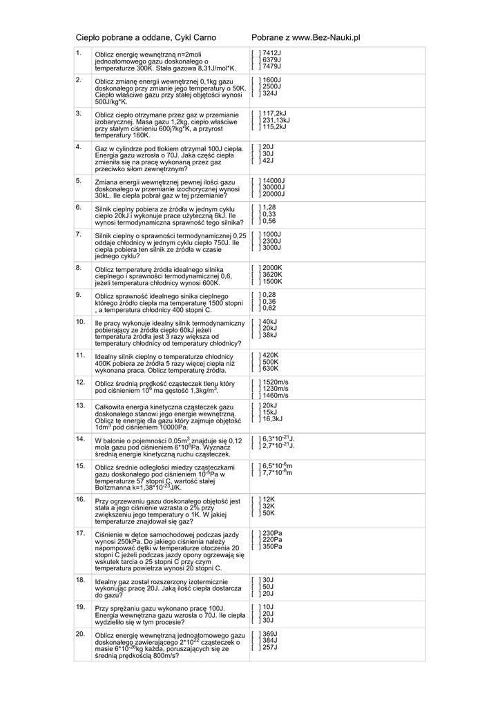 Ciepło pobrane a oddane, Cykl Carno Pobrane z www.Bez-Nauki.pl 1. Oblicz energię wewnętrzną n=2moli jednoatomowego gazu doskonałego o temperaturze 300K. Stała gazowa 8,31J/mol*K. [ ] 7412J [ ] 6379J [ ] 7479J 2. [ ] 1600J Oblicz zmianę energii wewnętrznej 0,1kg gazu doskonałego przy zmianie jego temperatury o 50K. [ ] 2500J Ciepło właściwe gazu przy stałej objętości wynosi [ ] 324J 500J/kg*K. 3. Oblicz ciepło otrzymane przez gaz w przemianie izobarycznej. Masa gazu 1,2kg, ciepło właściwe przy stałym ciśnieniu 600j?kg*K, a przyrost temperatury 160K. [ ] 117,2kJ [ ] 231,13kJ [ ] 115,2kJ 4. Gaz w cylindrze pod tłokiem otrzymał 100J ciepła. Energia gazu wzrosła o 70J. Jaka część ciepła zmieniła się na pracę wykonaną przez gaz przeciwko siłom zewnętrznym? [ ] 20J [ ] 30J [ ] 42J 5. Zmiana energii wewnętrznej pewnej ilości gazu doskonałego w przemianie izochorycznej wynosi 30kL. Ile ciepła pobrał gaz w tej przemianie? [ ] 14000J [ ] 30000J [ ] 20000J 6. Silnik cieplny pobiera ze źródła w jednym cyklu ciepło 20kJ i wykonuje prace użyteczną 6kJ. Ile wynosi termodynamiczna sprawność tego silnika? [ ] 1,28 [ ] 0,33 [ ] 0,56 7. Silnik cieplny o sprawności termodynamicznej 0,25 [ ] 1000J [ ] 2300J oddaje chłodnicy w jednym cyklu ciepło 750J. Ile [ ] 3000J ciepła pobiera ten silnik ze źródła w czasie jednego cyklu? 8. Oblicz temperaturę źródła idealnego silnika cieplnego i sprawności termodynamicznej 0,6, jeżeli temperatura chłodnicy wynosi 600K. [ ] 2000K [ ] 3620K [ ] 1500K 9. Oblicz sprawność idealnego sinika cieplnego którego źródło ciepła ma temperaturę 1500 stopni , a temperatura chłodnicy 400 stopni C. [ ] 0,28 [ ] 0,36 [ ] 0,62 10. Ile pracy wykonuje idealny silnik termodynamiczny pobierający ze źródła ciepło 60kJ jeżeli temperatura źródła jest 3 razy większa od temperatury chłodnicy od temperatury chłodnicy? [ ] 40kJ [ ] 20kJ [ ] 38kJ 11. Idealny silnik cieplny o temperaturze chłodnicy 400K pobiera ze źródła 5 razy więcej ciepła niż wykonana praca. Oblicz temperaturę źródła. [ ] 420K [ ] 500K [ ] 630K 12. Oblicz średnią prędkość cząsteczek tlenu który pod ciśnieniem 106 ma gęstość 1,3kg/m3. 13. Całkowita energia kinetyczna cząsteczek gazu doskonałego stanowi jego energie wewnętrzną. Oblicz tę energię dla gazu który zajmuje objętość 1dm3 pod ciśnieniem 10000Pa. [ [ [ [ [ [ 14. W balonie o pojemności 0,05m3 znajduje się 0,12 mola gazu pod ciśnieniem 6*106Pa. Wyznacz średnią energie kinetyczną ruchu cząsteczek. [ ] 6,3*10-21J. [ ] 2,7*10-21J. 15. Oblicz średnie odległości miedzy cząsteczkami gazu doskonałego pod ciśnieniem 10-5Pa w temperaturze 57 stopni C, wartość stałej Boltzmanna k=1,38*10-23J/K. [ ] 6,5*10-6m [ ] 7,7*10-6m 16. Przy ogrzewaniu gazu doskonałego objętość jest stała a jego ciśnienie wzrasta o 2% przy zwiększeniu jego temperatury o 1K. W jakiej temperaturze znajdował się gaz? [ ] 12K [ ] 32K [ ] 50K 17. Ciśnienie w dętce samochodowej podczas jazdy wynosi 250kPa. Do jakiego ciśnienia należy napompować dętki w temperaturze otoczenia 20 stopni C jeżeli podczas jazdy opony ogrzewają się wskutek tarcia o 25 stopni C przy czym temperatura powietrza wynosi 20 stopni C. [ ] 230Pa [ ] 220Pa [ ] 350Pa 18. Idealny gaz został rozszerzony izotermicznie wykonując pracę 20J. Jaką ilość ciepła dostarcza do gazu? [ ] 30J [ ] 50J [ ] 20J 19. [ ] 10J Przy sprężaniu gazu wykonano pracę 100J. Energia wewnętrzna gazu wzrosła o 70J. Ile ciepła [ ] 20J [ ] 30J wydzieliło się w tym procesie? 20. Oblicz energię wewnętrzną jednoatomowego gazu [ ] 369J [ ] 384J doskonałego zawierającego 2*1022 cząsteczek o [ ] 257J masie 6*10-26kg każda, poruszających się ze średnią prędkością 800m/s? ] 1520m/s ] 1230m/s ] 1460m/s ] 20kJ ] 15kJ ] 16,3kJ Poprawne odpowiedzi 1. 3. 5. 7. 9. 11. 13. 15. 17. 19. 7479J 115,2kJ 30000J 1000J 0,62 500K 15kJ 7,7*10-6m 230Pa 30J 2. 4. 6. 8. 10. 12. 14. 16. 18. 20. 2500J 30J 0,33 1500K 40kJ 1520m/s 6,3*10-21J. 50K 20J 384J