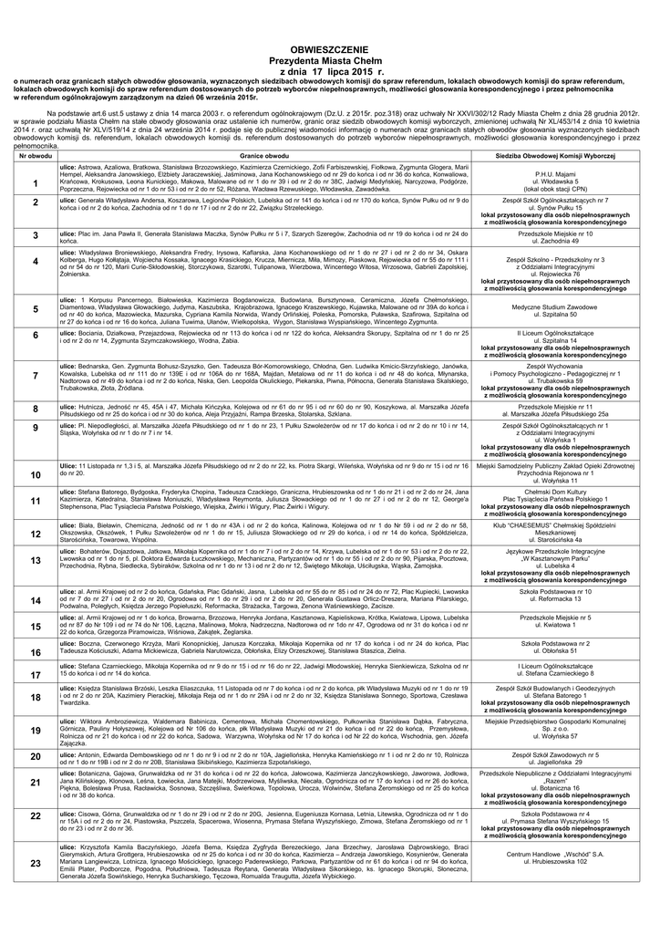 OBWIESZCZENIE Prezydenta Miasta Chełm z dnia 17 lipca 2015 r. o numerach oraz granicach stałych obwodów głosowania, wyznaczonych siedzibach obwodowych komisji do spraw referendum, lokalach obwodowych komisji do spraw referendum, lokalach obwodowych komisji do spraw referendum dostosowanych do potrzeb wyborców niepełnosprawnych, możliwości głosowania korespondencyjnego i przez pełnomocnika w referendum ogólnokrajowym zarządzonym na dzień 06 września 2015r. Na podstawie art.6 ust.5 ustawy z dnia 14 marca 2003 r. o referendum ogólnokrajowym (Dz.U. z 2015r. poz.318) oraz uchwały Nr XXVI/302/12 Rady Miasta Chełm z dnia 28 grudnia 2012r. w sprawie podziału Miasta Chełm na stałe obwody głosowania oraz ustalenie ich numerów, granic oraz siedzib obwodowych komisji wyborczych, zmienionej uchwałą Nr XL/453/14 z dnia 10 kwietnia 2014 r. oraz uchwałą Nr XLV/519/14 z dnia 24 września 2014 r. podaje się do publicznej wiadomości informację o numerach oraz granicach stałych obwodów głosowania wyznaczonych siedzibach obwodowych komisji ds. referendum, lokalach obwodowych komisji ds. referendum dostosowanych do potrzeb wyborców niepełnosprawnych, możliwości głosowania korespondencyjnego i przez pełnomocnika. Nr obwodu 1 Granice obwodu Siedziba Obwodowej Komisji Wyborczej ulice: Astrowa, Azaliowa, Bratkowa, Stanisława Brzozowskiego, Kazimierza Czernickiego, Zofii Farbiszewskiej, Fiołkowa, Zygmunta Glogera, Marii Hempel, Aleksandra Janowskiego, Elżbiety Jaraczewskiej, Jaśminowa, Jana Kochanowskiego od nr 29 do końca i od nr 36 do końca, Konwaliowa, Krańcowa, Krokusowa, Leona Kunickiego, Makowa, Malowane od nr 1 do nr 39 i od nr 2 do nr 38C, Jadwigi Medyńskiej, Narcyzowa, Podgórze, Poprzeczna, Rejowiecka od nr 1 do nr 53 i od nr 2 do nr 52, Różana, Wacława Rzewuskiego, Włodawska, Zawadówka. P.H.U. Majami ul. Włodawska 5 (lokal obok stacji CPN) 2 ulice: Generała Władysława Andersa, Koszarowa, Legionów Polskich, Lubelska od nr 141 do końca i od nr 170 do końca, Synów Pułku od nr 9 do końca i od nr 2 do końca, Zachodnia od nr 1 do nr 17 i od nr 2 do nr 22, Związku Strzeleckiego. Zespół Szkół Ogólnokształcących nr 7 ul. Synów Pułku 15 lokal przystosowany dla osób niepełnosprawnych z możliwością głosowania korespondencyjnego 3 ulice: Plac im. Jana Pawła II, Generała Stanisława Maczka, Synów Pułku nr 5 i 7, Szarych Szeregów, Zachodnia od nr 19 do końca i od nr 24 do końca. Przedszkole Miejskie nr 10 ul. Zachodnia 49 4 ulice: Władysława Broniewskiego, Aleksandra Fredry, Irysowa, Kaflarska, Jana Kochanowskiego od nr 1 do nr 27 i od nr 2 do nr 34, Oskara Kolberga, Hugo Kołłątaja, Wojciecha Kossaka, Ignacego Krasickiego, Krucza, Miernicza, Miła, Mimozy, Piaskowa, Rejowiecka od nr 55 do nr 111 i od nr 54 do nr 120, Marii Curie-Skłodowskiej, Storczykowa, Szarotki, Tulipanowa, Wierzbowa, Wincentego Witosa, Wrzosowa, Gabrieli Zapolskiej, Żołnierska. 5 ulice: 1 Korpusu Pancernego, Białowieska, Kazimierza Bogdanowicza, Budowlana, Bursztynowa, Ceramiczna, Józefa Chełmońskiego, Diamentowa, Władysława Głowackiego, Judyma, Kaszubska, Krajobrazowa, Ignacego Kraszewskiego, Kujawska, Malowane od nr 39A do końca i od nr 40 do końca, Mazowiecka, Mazurska, Cypriana Kamila Norwida, Wandy Orlińskiej, Poleska, Pomorska, Puławska, Szafirowa, Szpitalna od nr 27 do końca i od nr 16 do końca, Juliana Tuwima, Ułanów, Wielkopolska, Wygon, Stanisława Wyspiańskiego, Wincentego Zygmunta. 6 ulice: Bociania, Działkowa, Przejazdowa, Rejowiecka od nr 113 do końca i od nr 122 do końca, Aleksandra Skorupy, Szpitalna od nr 1 do nr 25 i od nr 2 do nr 14, Zygmunta Szymczakowskiego, Wodna, Żabia. II Liceum Ogólnokształcące ul. Szpitalna 14 lokal przystosowany dla osób niepełnosprawnych z możliwością głosowania korespondencyjnego 7 ulice: Bednarska, Gen. Zygmunta Bohusz-Szyszko, Gen. Tadeusza Bór-Komorowskiego, Chłodna, Gen. Ludwika Kmicic-Skrzyńskiego, Janówka, Kowalska, Lubelska od nr 111 do nr 139E i od nr 106A do nr 168A, Majdan, Metalowa od nr 11 do końca i od nr 48 do końca, Młynarska, Nadtorowa od nr 49 do końca i od nr 2 do końca, Niska, Gen. Leopolda Okulickiego, Piekarska, Piwna, Północna, Generała Stanisława Skalskiego, Trubakowska, Złota, Źródlana. Zespół Wychowania i Pomocy Psychologiczno - Pedagogicznej nr 1 ul. Trubakowska 59 lokal przystosowany dla osób niepełnosprawnych z możliwością głosowania korespondencyjnego 8 ulice: Hutnicza, Jedność nr 45, 45A i 47, Michała Kińczyka, Kolejowa od nr 61 do nr 95 i od nr 60 do nr 90, Koszykowa, al. Marszałka Józefa Piłsudskiego od nr 25 do końca i od nr 30 do końca, Aleja Przyjaźni, Rampa Brzeska, Stolarska, Szklana. Przedszkole Miejskie nr 11 al. Marszałka Józefa Piłsudskiego 25a 9 ulice: Pl. Niepodległości, al. Marszałka Józefa Piłsudskiego od nr 1 do nr 23, 1 Pułku Szwoleżerów od nr 17 do końca i od nr 2 do nr 10 i nr 14, Śląska, Wołyńska od nr 1 do nr 7 i nr 14. Zespół Szkół Ogólnokształcących nr 1 z Oddziałami Integracyjnymi ul. Wołyńska 1 lokal przystosowany dla osób niepełnosprawnych z możliwością głosowania korespondencyjnego Ulice: 11 Listopada nr 1,3 i 5, al. Marszałka Józefa Piłsudskiego od nr 2 do nr 22, ks. Piotra Skargi, Wileńska, Wołyńska od nr 9 do nr 15 i od nr 16 do nr 20. Miejski Samodzielny Publiczny Zakład Opieki Zdrowotnej Przychodnia Rejonowa nr 1 ul. Wołyńska 11 11 ulice: Stefana Batorego, Bydgoska, Fryderyka Chopina, Tadeusza Czackiego, Graniczna, Hrubieszowska od nr 1 do nr 21 i od nr 2 do nr 24, Jana Kazimierza, Katedralna, Stanisława Moniuszki, Władysława Reymonta, Juliusza Słowackiego od nr 1 do nr 27 i od nr 2 do nr 12, George'a Stephensona, Plac Tysiąclecia Państwa Polskiego, Wiejska, Żwirki i Wigury, Plac Żwirki i Wigury. Chełmski Dom Kultury Plac Tysiąclecia Państwa Polskiego 1 lokal przystosowany dla osób niepełnosprawnych z możliwością głosowania korespo