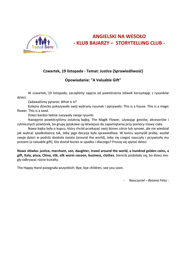 ANGIELSKI NA WESOŁO - KLUB BAJARZY – STORYTELLING CLUB - Czwartek, 19 listopada - Temat: Justice (Sprawiedliwość) Opowiadanie: "A Valuable Gift" W czwartek, 19 listopada, zaczęliśmy zajęcia od powtórzenia słówek korzystając z rysunków dzieci. Zadawaliśmy pytanie: What is it? Kolejne dziecko pokazywało swój wybrany rysunek i opisywało: This is a house. This is a magic flower. This is a seed. Dzieci bardzo ładnie nazywały swoje rysunki. Następnie powtórzyliśmy ostatnią bajkę, The Magik Flower, używając gestów, akcesoriów i rytmicznych powtórek, bo grupy językowe są łatwiejsze do zapamiętania przy pomocy mowy ciała. Nowa bajka była o kupcu, który chciał przekazać swój biznes córce lub synowi, ale nie wiedział jak wybrać spadkobiercę tak, żeby jego decyzja była sprawiedliwa. W końcu wymyślił próbę: wysłał swoje dzieci w podróż dookoła świata (around the world), żeby się czegoś nauczyły i przywiozły mu prezent (a valuable gift). Kto dostał biznes w spadku i dlaczego? Proszę się spytać dzieci. Nowe słówka: justice, merchant, son, daughter, travel around the world, a hundred golden coins, a gift, Italy, pizza, China, silk, silk worm cocoon, business, clothes. Stencils podobały się, bo dzieci mogły odkrywać różne kształty. The Happy Hand pożegnała wszystkich: Bye, bye children, see you soon. - Nauczyciel – Bożena Felsz -