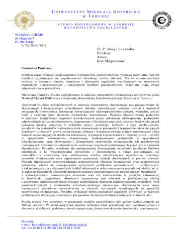 UNIWERSYTET MIKOŁAJA KOPERNIKA W TORUNIU STUDIA PODYPLOMOWE W ZAKRESIE RATOWNICTWA CHEMICZNEGO WYDZIAŁ CHEMII ul. Gagarina 7 87-100 Toruń L. Dz. Nr/11/2012 Sz. P. Imię i nazwisko Funkcja Adres Kod Miejscowość Szanowni Państwo, problem coraz większej skali zagrożeń cywilizacyjno-środowiskowych wymaga rozwijania nowych dziedzin zajmujących się zagadnieniami likwidacji tychże zdarzeń. Ma to odzwierciedlenie również w obecnym tempie, rozmiarze i złożoności zagadnień wynikających ze stosowania materiałów niebezpiecznych i toksycznych środków przemysłowych, które nie mają swego odpowiednika w przeszłości. Oferujemy Państwu Studia podyplomowe w zakresie ratownictwa chemicznego realizowane przez Wydział Chemii UMK wraz z Komendą Wojewódzką Państwowej Straży Pożarnej w Toruniu. Absolwent Studiów podyplomowych w zakresie ratownictwa chemicznego jest przygotowany do skutecznego i bezpiecznego prowadzenia działań ratowniczych podczas awarii i katastrof związanych z obecnością substancji stwarzających niebezpieczeństwo pożaru, wybuchu, zatruć ludzi i zwierząt oraz skażenia środowiska naturalnego. Posiada ukształtowaną podstawę w zakresie: identyfikacji zagrożeń wywoływanych przez substancje niebezpieczne, podmiotów odpowiedzialnych za monitorowanie, rozpoznanie i likwidację zagrożeń, ochrony środowiska przed poważną awarią powstałą w zakładzie pracy, przebiegu wybuchu i jego mechanizmów, oznakowania materiałów niebezpiecznych stosowanego w przemyśle i transporcie, obowiązujących dyrektyw i przepisów prawa ratowniczego, rodzaju i wykorzystywania planów ratowniczych i baz danych wspomagających działania ratownicze, wymagań bezpieczeństwa i higieny pracy – służby w specjalności ratownictwa chemicznego, funkcjonowania podmiotów o specjalności toksykologicznej oraz obowiązków i kompetencji ratowników chemicznych, ich przełożonych i kierujących działaniami ratowniczymi. wykazuje znajomość podstawowych pojęć, praw i zjawisk chemicznych. Ponadto, wyróżnia się umiejętnością dostrzegania zależności pomiędzy budową substancji, a jej właściwościami fizycznymi i chemicznymi, a także posługiwania się nomenklaturą chemiczną oraz podstawową wiedzą umożliwiającą wyjaśnianie przebiegu procesów chemicznych oraz zapisywanie poznanych reakcji chemicznych w postaci równań. Posiada umiejętność przeprowadzania podstawowych obliczeń chemicznych oraz zastosowania posiadanej wiedzy do rozwiązywania wybranych problemów rachunkowych i praktycznych, a także korzystania z różnorodnych źródeł informacji w celu rozszerzenia posiadanej wiedzy, m.in. w zakresie fizycznych i fizykochemicznych podstaw instrumentalnych metod analizy chemicznej z wykorzystaniem nowoczesnych sensorów oraz ich zastosowania w praktyce ratowniczej w środowisku zagrożenia. Absolwent wyposażony jest również w profesjonalną wiedzę i praktyczne umiejętności umożliwiające identyfikację zagrożeń zanieczyszczenia atmosfery, wód powierzchniowych i środowiska gruntowo-wodnego skażeniami chemicznymi oraz umie wykorzystać posiadane doświadczenie w różnych sytuacjach wynikających ze specyfiki ratownictwa chemicznego. Ponadto, wykazuje dobrą znajomość aspektów prawnych w zakresie problematyki dotyczącej substancji i preparatów chemicznych funkcjonujących w środowisku. Studia trwają dwa semestry, w programie studiów przewidziano 320 godzin dydaktycznych, po 160 na semestr. W skład programu studiów wchodzą takie przedmioty jak: podstawy chemii z elementami obliczeń, podstawy chemii organicznej, chemiczne skażenia środowiska, oznakowanie Kontakt: e-mail: [email protected], [email protected] tel: +48 56 611 47 26 lub +48 56 611 43 31 UNIWERSYTET MIKOŁAJA KOPERNIKA W TORUNIU STUDIA PODYPLOMOWE W ZAKRESIE RATOWNICTWA CHEMICZNEGO WYDZIAŁ CHEMII ul. Gagarina 7 87-100 Toruń opakowań i materiałów niebezpiecznych, taktyka działań ratownictwa chemiczno-ekologicznego podczas akcji, zagrożenia wywołane uwolnioną chemią, organizacja ratownictwa chemicznoekologicznego przed otrzymaniem zgłoszenia, plany ratownicze i bazy danych, sensory chemiczne, zagrożenie promieniowaniem jonizującym, taktyka działania ratownictwa chemicznego i ekologicznego podczas akcji, dekontaminacja, rodzaje zagrożeń, monitoring i szacowania ryzyka, wybuchy, toksykologia, poważne awarie, taktyka działąń z LPG i acetylenem, wybuchy bleve, alarmowanie, ostrzeganie i ewakuacja ze stref zagrożenia przy rozprzestrzeniającej się chmurze substancji niebezpiecznej, działania podmiotów ratowniczych po akcji, obowiązki i kompetencje ratowników chemicznych, repetytorium wiedzy z ratownictwa chemicznego, elektryczność statyczna – zjawisko ważne w ratownictwie chemicznym oraz dyrektywy i prawo ratownicze. Studia rozpoczynają się w semestrze letnim, szczegółowe informacje uzyskają Państwo na stronie internetowej: http://podyplomowe.umk.pl/web/guest/sp proszę wybrać wydział chemii i polecenie „szukaj” oraz wybrać nazwę studiów. Koszt studiów to 4750,00 PLN przy jednorazowej opłacie, lub 2500,00 PLN za I semestr i 2400,00PLN za II semestr. Zachęcamy, aby w trosce o bezpieczeństwo w zakresie zagrożeń chemicznych, skierować pracowników do uczestnictwa w realizowanych studiach. W załączeniu przedstawiam rekomendację Komendanta Wojewódzkiego PSP w Toruniu. Jednocześnie informujemy, iż ze względów dydaktycznych liczba miejsc jest limitowana i na rok akademicki 2013/14 wynosi 30. Łącząc wyrazy szacunku Sekretarz studiów podyplomowych w zakresie ratownictwa chemicznego Kierownik Studiów podyplomowych zakresie ratownictwa chemicznego dr Marcin Cichosz dr hab. Roman Buczkowski, prof. UMK Kontakt: e-mail: [email protected], [email protected] tel: +48 56 611 47 26 lub +48 56 611 43 31