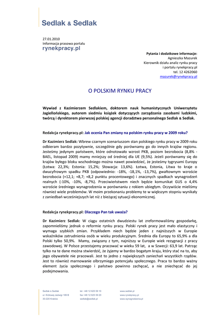 27.01.2010 Informacja prasowa portalu Pytania i dodatkowe informacje: Agnieszka Mazurek Kierownik działu analiz rynku pracy i portalu rynekpracy.pl tel. 12 4262060 [email protected] O POLSKIM RYNKU PRACY Wywiad z Kazimierzem Sedlakiem, doktorem nauk humanistycznych Uniwersytetu Jagiellooskiego, autorem siedmiu książek dotyczących zarządzania zasobami ludzkimi, twórcą i dyrektorem pierwszej polskiej agencji doradztwa personalnego Sedlak & Sedlak. Redakcja rynekpracy.pl: Jak ocenia Pan zmiany na polskim rynku pracy w 2009 roku? Dr Kazimierz Sedlak: Wbrew czarnym scenariuszom stan polskiego rynku pracy w 2009 roku odbieram bardzo pozytywnie, szczególnie gdy porównamy go do innych krajów regionu. Jesteśmy jedynym paostwem, które odnotowało wzrost PKB, poziom bezrobocia (8,8% BAEL, listopad 2009) mamy mniejszy od średniej dla UE (9,5%). Jeżeli porównamy się do krajów byłego bloku wschodniego można nawet powiedzied, że jesteśmy tygrysami Europy (Łotwa: 22,3%; Estonia: 15,2%; Słowacja: 13,6%). Łotwa, Estonia, Litwa to kraje o dwucyfrowym spadku PKB (odpowiednio: -18%, -18,1%, -13,7%), gwałtownym wzroście bezrobocia (+12,1; +8,7; +8,2 punktu procentowego) i znacznych spadkach wynagrodzeo realnych (-10%, -10%, -8,7%). Przeciwieostwem niech będzie komunikat GUS o 4,4% wzroście średniego wynagrodzenia w porównaniu z rokiem ubiegłym. Oczywiście mieliśmy również wiele problemów. W moim przekonaniu problemy te w większym stopniu wynikały z zaniedbao wcześniejszych lat niż z bieżącej sytuacji ekonomicznej. Redakcja rynekpracy.pl: Dlaczego Pan tak uważa? Dr Kazimierz Sedlak: W ciągu ostatnich dwudziestu lat zreformowaliśmy gospodarkę, zapomnieliśmy jednak o reformie rynku pracy. Polski rynek pracy jest mało elastyczny i wymaga szybkich zmian. Przykładem niech będzie jeden z najniższych w Europie wskaźników zatrudnienia osób w wieku produkcyjnym. Średnia dla Europy to 65,9% a dla Polski tylko 50,9%. Mamy, związany z tym, najniższy w Europie wiek rezygnacji z pracy zawodowej. W Polsce przestajemy pracowad w wieku 59 lat, a w Szwecji: 63,9 lat. Patrząc tylko na te dane można stwierdzid, że żyjemy w bardzo bogatym kraju, który stad na to, aby jego obywatele nie pracowali. Jest to jedno z największych zaniechao wszystkich rządów. Jest to również marnowanie olbrzymiego potencjału społecznego. Praca to bardzo ważny element życia społecznego i paostwo powinno zachęcad, a nie zniechęcad do jej podejmowania. Sedlak & Sedlak tel. +48 12 625 59 10 www.sedlak.pl ul. Królowej Jadwigi 189 B fax +48 12 625 59 20 www.rynekpracy.pl 30-220 Kraków [email protected] www.wynagrodzenia.pl Redakcja rynekpracy.pl: Na czym powinna polegad elastycznośd? Dr Kazimierz Sedlak: Zacznę od dwóch prostych przykładów. W 2010 roku Polska zajęła 71 miejsce w rankingu wolności gospodarczej, a 105 pod względem wolności dla biznesu. Oznacza to również brak wolności na rynku pracy. Drugi przykład. Dwa lata temu wszyscy mówili, że w Polsce mamy do czynienia rynkiem pracownika, w 2009 roku z kolei mówiło się o rynku pracodawcy. Dla mnie jest to przejaw patologii rynku pracy. Jeżeli żyjemy w kraju z gospodarką wolnorynkową, to na rynku pracy powinna panowad względną równowaga. Zdrowy rynek pracy to taki, na którym pracownik i pracodawca są partnerami i mają równe prawa. Partnerstwo to swoboda wyboru i zasada równych szans. Partnerstwo to również ryzyko i tu paostwo powinno wypracowad mechanizmy minimalizujące go, szczególnie w przypadku najuboższych grup społecznych. Niestety elastycznośd nie dotyczy tylko polityki paostwa czy regulacji prawnych. Elastycznośd dotyczy również pracowników. Współczesny rynek pracy to rynek szybkich zmian, wystarczy porównad to, co się działo w roku 2008 z wydarzeniami 2009 roku. Musimy więc zaakceptowad fakt, że nasza wiedza i umiejętności szybko się dezaktualizują i trzeba je ciągle doskonalid. Musimy nauczyd się mobilności, przywyknąd do tego, że statystycznie co kilka lat będziemy zmieniad pracę. Często będzie również związane to ze zmianą zawodu. Jeżeli chcemy czud się bezpiecznie, najlepiej posiadad umiejętności pozwalające znaleźd pracę w kilku zawodach. Mamy wysokie aspiracje płacowe i jeżeli chcemy je realizowad w sposób partnerski, to muszą byd one powiązane ze stałym doskonaleniem kompetencji zawodowych. Wynagrodzenia powinny byd również powiązane z wydajnością pracy. Powinniśmy więc pamiętad i nauczyd się, że nasze płace nie będą tylko rosły, ale mogą się też zmniejszyd w przypadku trudnej sytuacji na rynku. Redakcja rynekpracy.pl: A co z osobami trwale bezrobotnymi i żyjącymi na skraju ubóstwa? Dr Kazimierz Sedlak: Elastycznośd rynku pracy musi byd powiązana z zapewnieniem bezpieczeostwa wszystkim, również i tym co gorzej sobie radzą. To jest kolejny ważny problem, który powinien zostad uregulowany w ramach reformy. W tej chwili w Polsce sam fakt bezrobocia nie jest tak istotny jak to, że w tej grupie bardzo dużo osób jest długotrwale bezrobotnych, stanowią oni 40,6% ogółu zarejestrowanych bezrobotnych. Oznacza to, że rynek pracy ich nie chce i to jest poważny problem do rozwiązania. Niestety nie wygląda na to, aby nasze władze podejmowały zdecydowane działania w tym kierunku. Redakcja rynekpracy.pl: Co poradziłby Pan osobom, które w ostatnich miesiącach straciły pracę? Dr Kazimierz Sedlak: Utrata pracy to jedno z najbardziej stresujących wydarzeo w życiu każdego z nas. Dla wielu ludzi wiąże się z to z pogorszeniem sytuacji materialnej. Pamiętajmy jednak, że jest to również szansa poprawienia swojej sytuacji na rynku pracy. W tej chwili w Polsce realizowane są liczne programy unijne związane z rozwojem kapitału ludzkiego. Różne instytucje organizują liczne szkolenia doskonalące umiejętności zawodowe czy pozwalające na przekwalifikowanie i nabycie kompetencji poszukiwanych przez Sedlak &