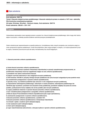 BDO - informacje o szkoleniu Opis szkolenia Dane o szkoleniu Kod szkolenia: 594716 Temat: Klauzula obejścia prawa podatkowego i klauzula nadużycia prawa w ustawie o VAT oraz Jednolity Plik Kontrolny-nowelizacja przepisów. 29 Lipiec Wrocław, Wrocław - Centrum miasta, Kod szkolenia: 594716 Koszt szkolenia: 590.00 + 23% VAT Program Ustawodawca wprowadza nowe regulacje prawne w postaci tzw. klauzuli obejścia prawa podatkowego, które mogą mieć istotny wpływ na przyszłe, a niekiedy przeszłe działania restrukturyzacyjne przedsiębiorstw. Celem szkolenia jest zaprezentowanie w sposób praktyczny i kompleksowy istoty nowych przepisów oraz zwrócenie uwagi na nowe uprawnienia organów podatkowych i skutki dla podatników, jakie mogą wystąpić w związku z ich wykorzystywaniem przez te organy. Szkolenie przeznaczone jest dla kadry menadżerskiej oraz służb księgowych. 1. Klauzula przeciwko unikaniu opodatkowania: a) istota klauzuli przeciwko unikaniu opodatkowania, b) ograniczenia w zakresie uzyskaniu interpretacji indywidualnej w sytuacji uzasadnionego przypuszczenia, że przedmiotem interpretacji może być zagadnienie mające na celu unikania opodatkowania, c) przesłanki oraz zakres zastosowania klauzuli, d) pojęcie czynność dokonanej w celu osiągnięcia korzyści podatkowej, e) limit kwotowy 100 000 zł. powyżej, którego korzyść podatkowa lub suma korzyści osiągniętych przez podmiot może być przedmiotem postępowania w sprawie unikania opodatkowania, f) sposoby oceny, czy działania podatnika były sztuczne w celu osiągnięcia korzyści podatkowej, g) niepowstanie zobowiązania podatkowego, odsunięcie w czasie powstania, zobowiązania podatkowego lub obniżenie jego wysokości, powstanie lub zawyżenie straty podatkowej, powstanie nadpłaty lub prawa do zwrotu podatku, podwyższenie kwoty nadpłaty lub zwrotu podatku jako korzyść podatkowa, h) organy podatkowe właściwe w sprawie klauzuli przeciwko unikaniu opodatkowania, i) tryb i charakterystyka postępowania w przypadku unikania opodatkowania, j) Rada do Spraw Przeciwdziałania Unikaniu Opodatkowania jako organ opiniodawczy, k) zawieszenie postępowania w sprawie unikania opodatkowania, l) klauzula przeciwko unikaniu opodatkowania, a podatek VAT, ł) klauzula przeciwko unikania opodatkowania a interpretacje indywidualne m) wniosek i opłata o wydanie opinii zabezpieczającej, n) tryb wydawania opinii zabezpieczającej, o) treść opinii zabezpieczającej, p) rygor natychmiastowej wykonalności, a decyzja wydana w sprawie unikania opodatkowania, BDO - informacje o szkoleniu q) stosowanie klauzul do zdarzeń przeszłych - intertemporalność przepisów dot. klauzuli r) przykłady transakcji/rozliczeń/struktur, do których może mieć zastosowanie klauzula s) przykłady działań podatnika naruszających klauzulę 2. Jednolity Plik Kontrolny: a) cel regulacji b) zakres czasowy obowiązku przekazywania JPK c) podmioty zobowiązane do prowadzenia ksiąg w formie JPK- termin wprowadzenia obowiązku dostarczania JPK (przepisy przejściowe) d) zakres żądania/wezwania do przedstawienia ksiąg w formie JPK -uprawnienia organu podatkowego do żądania JPK e) technika przesyłania JPK (możliwe sposoby przekazywania JPK, rodzaje nośników) f) struktury logiczne JPK, g) struktura JPK w zakresie podatku od towarów i usług (faktury, rejestry, ewidencje, deklaracje- częstotliwość raportowania, raportowanie bez wezwania, różnica między obowiązkiem przesyłania JPK a przesyłanie rejestrów VAT, NIP kontrahenta w rejestrze sprzedaży, prowadzenie rejestrów w formie elektronicznej) h) kara porządkowa w przypadku nie zastosowania JPK, i) ustawa karna skarbowa, a JPK, j) rozporządzenie Ministra Finansów dot. JPK. k) JPK w wyjaśnieniach Ministerstwa Finansów Prowadzący Informacje organizacyjne Kalendarz zajęć: Informacje i zgłoszenia
