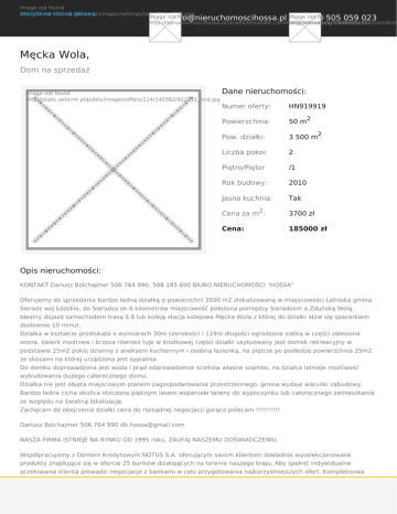 Image not found przejdź na stronę główną http://nieruchomoscihossa.pl/images/settings/logo_hossa300.png Image [email protected] not found Image +48 not found 505 059 023 http://nieruchomoscihossa.pl/assets/template-common/gfx/mail.png?1466025261 http://nieruchomoscihossa.pl/assets/tem Męcka Wola, Dom na sprzedaż Image not found http://static.esticrm.pl/public/images/offers/114/140382/912751_mid.jpg Dane nieruchomości: Numer oferty: HN919919 Powierzchnia: 50 m Pow. działki: 3 500 m Liczba pokoi: 2 Piętro/Pięter /1 Rok budowy: 2010 Jasna kuchnia: Tak 2 2 2 Cena za m : 3700 zł Cena: 185000 zł Opis nieruchomości: KONTAKT Dariusz Bolchajmer 506 764 990, 508 185 690 BIURO NIERUCHOMOŚCI "HOSSA" Oferujemy do sprzedania bardzo ładną działkę o powierzchni 3500 m2 zlokalizowaną w miejscowości Letniska gmina Sieradz woj Łódzkie, do Sieradza ok 6 kilometrów miejscowość położona pomiędzy Sieradzem a Zduńską Wolą. Idealny dojazd samochodem trasą S 8 lub koleją stacja kolejowa Męcka Wola z której do działki idzie się spacerkiem dosłownie 10 minut. Działka w kształcie prostokąta o wymiarach 30m szerokości i 119m długości ogrodzona siatką w części zalesiona sosna, świerk modrzew i brzoza również tuje w środkowej części działki usytuowany jest domek rekreacyjny w podstawie 25m2 pokój dzienny z aneksem kuchennym i osobną łazienką, na piętrze po podłodze powierzchnia 25m2 ze skosami na której urządzona jest sypialnia. Do domku doprowadzona jest woda i prąd odprowadzenie ścieków własne szambo, na działce istnieje możliwość wybudowania dużego całorocznego domu. Działka nie jest objęta miejscowym planem zagospodarowania przestrzennego, gmina wydaje warunki zabudowy. Bardzo ładna cicha okolica otoczona pięknym lasem wspaniałe tereny do wypoczynku lub całorocznego zamieszkania ze względu na świetną lokalizację. Zachęcam do obejrzenia działki cena do rozsądnej negocjacji gorąco polecam !!!!!!!!!! Dariusz Bolchajmer 506 764 990 [email protected] NASZA FIRMA ISTNIEJE NA RYNKU OD 1995 roku, ZAUFAJ NASZEMU DOŚWIADCZENIU. Współpracujemy z Domem Kredytowym NOTUS S.A. oferującym swoim klientom dokładnie wyselekcjonowane produkty znajdujące się w ofercie 25 banków działających na terenie naszego kraju. Aby spełnić indywidualne oczekiwania klienta prowadzi negocjacje z bankami w celu przygotowania najkorzystniejszych ofert. Kompleksowa Image not found przejdź na stronę główną http://nieruchomoscihossa.pl/images/settings/logo_hossa300.png Image [email protected] not found Image +48 not found 505 059 023 http://nieruchomoscihossa.pl/assets/template-common/gfx/mail.png?1466025261 http://nieruchomoscihossa.pl/assets/tem obsługa klienta od chwili złożenia wniosku o kredyt do momentu podpisania umowy kredytowej jest bezpłatna. Image not found Image not found Image not found Image not found http://static.esticrm.pl/public/images/offers/114/140382/912751_mid.jpg http://static.esticrm.pl/public/images/offers/114/140382/912752_mid.jpg http://static.esticrm.pl/public/images/offers/114/140382/912753_mid.jpg http://static.esticrm.pl/public/images/offers/114/14038 Image not found Image not found Image not found Image not found http://static.esticrm.pl/public/images/offers/114/140382/912755_mid.jpg http://static.esticrm.pl/public/images/offers/114/140382/912756_mid.jpg http://static.esticrm.pl/public/images/offers/114/140382/912757_mid.jpg http://static.esticrm.pl/public/images/offers/114/14038 Image not found Image not found Image not found Image not found http://static.esticrm.pl/public/images/offers/114/140382/912759_mid.jpg http://static.esticrm.pl/public/images/offers/114/140382/912760_mid.jpg http://static.esticrm.pl/public/images/offers/114/140382/912761_mid.jpg http://static.esticrm.pl/public/images/offers/114/14038 Image not found Image not found Image not found Image not found http://static.esticrm.pl/public/images/offers/114/140382/912763_mid.jpg http://static.esticrm.pl/public/images/offers/114/140382/912764_mid.jpg http://static.esticrm.pl/public/images/offers/114/140382/912765_mid.jpg http://static.esticrm.pl/public/images/offers/114/14038 Image not found Image not found Image not found http://static.esticrm.pl/public/images/offers/114/140382/912767_mid.jpg http://static.esticrm.pl/public/images/offers/114/140382/912768_mid.jpg http://static.esticrm.pl/public/images/offers/114/140382/912769_mid.jpg