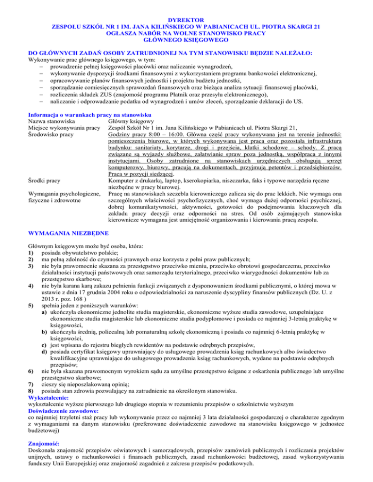 DYREKTOR ZESPOŁU SZKÓŁ NR 1 IM. JANA KILIŃSKIEGO W PABIANICACH UL. PIOTRA SKARGI 21 OGŁASZA NABÓR NA WOLNE STANOWISKO PRACY GŁÓWNEGO KSIĘGOWEGO DO GŁÓWNYCH ZADAŃ OSOBY ZATRUDNIONEJ NA TYM STANOWISKU BĘDZIE NALEŻAŁO: Wykonywanie prac głównego księgowego, w tym: − prowadzenie pełnej księgowości placówki oraz naliczanie wynagrodzeń, − wykonywanie dyspozycji środkami finansowymi z wykorzystaniem programu bankowości elektronicznej, − opracowywanie planów finansowych jednostki i projektu budżetu jednostki, − sporządzanie comiesięcznych sprawozdań finansowych oraz bieżąca analiza sytuacji finansowej placówki, − rozliczenia składek ZUS (znajomość programu Płatnik oraz przesyłu elektronicznego), − naliczanie i odprowadzanie podatku od wynagrodzeń i umów zleceń, sporządzanie deklaracji do US. Informacja o warunkach pracy na stanowisku Nazwa stanowiska Główny księgowy Miejsce wykonywania pracy Zespół Szkół Nr 1 im. Jana Kilińskiego w Pabianicach ul. Piotra Skargi 21, Środowisko pracy Godziny pracy 8:00 – 16:00. Główna część pracy wykonywana jest na terenie jednostki: pomieszczenia biurowe, w których wykonywana jest praca oraz pozostała infrastruktura budynku: sanitariaty, korytarze, drogi i przejścia, klatki schodowe – schody. Z pracą związane są wyjazdy służbowe, załatwianie spraw poza jednostką, współpraca z innymi instytucjami. Osoby zatrudnione na stanowiskach urzędniczych obsługują sprzęt komputerowy, biurowy, pracują na dokumentach, przyjmują petentów i przedsiębiorców. Praca w pozycji siedzącej. Środki pracy Komputer z drukarką, laptop, kserokopiarka, niszczarka, faks i typowe narzędzia ręczne niezbędne w pracy biurowej. Wymagania psychologiczne, Pracę na stanowiskach szczebla kierowniczego zalicza się do prac lekkich. Nie wymaga ona fizyczne i zdrowotne szczególnych właściwości psychofizycznych, choć wymaga dużej odporności psychicznej, dobrej komunikatywności, aktywności, gotowości do podejmowania kluczowych dla zakładu pracy decyzji oraz odporności na stres. Od osób zajmujących stanowiska kierownicze wymagana jest umiejętność organizowania i kierowania pracą zespołu. WYMAGANIA NIEZBĘDNE Głównym księgowym może być osoba, która: 1) posiada obywatelstwo polskie; 2) ma pełną zdolność do czynności prawnych oraz korzysta z pełni praw publicznych; 3) nie była prawomocnie skazana za przestępstwo przeciwko mieniu, przeciwko obrotowi gospodarczemu, przeciwko działalności instytucji państwowych oraz samorządu terytorialnego, przeciwko wiarygodności dokumentów lub za przestępstwo skarbowe; 4) nie była karana karą zakazu pełnienia funkcji związanych z dysponowaniem środkami publicznymi, o której mowa w ustawie z dnia 17 grudnia 2004 roku o odpowiedzialności za naruszenie dyscypliny finansów publicznych (Dz. U. z 2013 r. poz. 168 ) 5) spełnia jeden z poniższych warunków: a) ukończyła ekonomiczne jednolite studia magisterskie, ekonomiczne wyższe studia zawodowe, uzupełniające ekonomiczne studia magisterskie lub ekonomiczne studia podyplomowe i posiada co najmniej 3-letnią praktykę w księgowości, b) ukończyła średnią, policealną lub pomaturalną szkołę ekonomiczną i posiada co najmniej 6-letnią praktykę w księgowości, c) jest wpisana do rejestru biegłych rewidentów na podstawie odrębnych przepisów, d) posiada certyfikat księgowy uprawniający do usługowego prowadzenia ksiąg rachunkowych albo świadectwo kwalifikacyjne uprawniające do usługowego prowadzenia ksiąg rachunkowych, wydane na podstawie odrębnych przepisów; 6) nie była skazana prawomocnym wyrokiem sądu za umyślne przestępstwo ścigane z oskarżenia publicznego lub umyślne przestępstwo skarbowe; 7) cieszy się nieposzlakowaną opinią; 8) posiada stan zdrowia pozwalający na zatrudnienie na określonym stanowisku. Wykształcenie: wykształcenie wyższe pierwszego lub drugiego stopnia w rozumieniu przepisów o szkolnictwie wyższym Doświadczenie zawodowe: co najmniej trzyletni staż pracy lub wykonywanie przez co najmniej 3 lata działalności gospodarczej o charakterze zgodnym z wymaganiami na danym stanowisku (preferowane doświadczenie zawodowe na stanowisku księgowego w jednostce budżetowej) Znajomość: Doskonała znajomość przepisów oświatowych i samorządowych, przepisów zamówień publicznych i rozliczania projektów unijnych, ustawy o rachunkowości i finansach publicznych, zasad rachunkowości budżetowej, zasad wykorzystywania funduszy Unii Europejskiej oraz znajomość zagadnień z zakresu przepisów podatkowych. Umiejętność: - korzystania z przepisów prawa, - obsługi komputera i programów niezbędnych do obsługi budżetu placówki, w tym znajomość obsługi programów księgowych oraz pakietu MS Office, - faksu, skanera i kserokopiarki. WYMAGANIA DODATKOWE - samodzielność i komunikatywność, - umiejętność pracy w zespole, logicznego myślenia, słuchania i wysławiania się, wykazywanie inicjatywy w usprawnianiu pracy placówki. Cechy osobowości: Uczciwość, solidność, punktualność, dokładność, systematyczność, stanowczość, samodzielność i kreatywność w rozwiązywaniu problemów, zaangażowanie, lojalność, otwartość na wiedzę i chęć do jej pogłębiania, komunikatywność, dyskretność, odporność na stres. Dyspozycyjność: W sytuacjach tego wymagających konieczność pozostawania w dyspozycji pracodawcy po godzinach pracy i dni wolne od pracy. WYMAGANE DOKUMENTY APLIKACYJNE Osoby zainteresowane zatrudnieniem prosimy o złożenie (przesłanie) - życiorysu (szczegółowego CV z uwzględnieniem przebiegu kariery zawodowej), - listu motywacyjnego, - wypełnionego kwestionariusza personalnego. Oferta kandydata powinna ponadto zawierać w szczególności: − kopię dyplomu ukończenia uczelni, − kopię dokumentów potwierdzających spełnienie warunków kwalifikacyjnych, − kopie dokumentów potwi