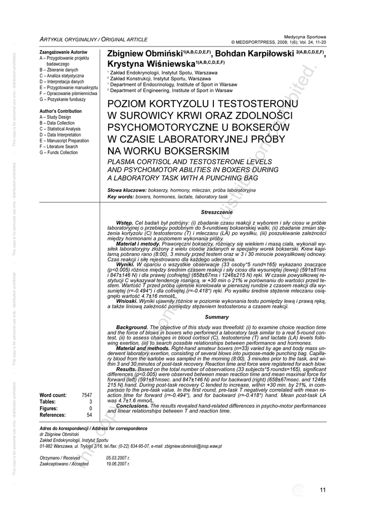 Medycyna Sportowa © MEDSPORTPRESS, 2008; 1(6); Vol. 24, 11-20 2 1 2 POZIOM KORTYZOLU I TESTOSTERONU W SUROWICY KRWI ORAZ ZDOLNOŒCI PSYCHOMOTORYCZNE U BOKSERÓW W CZASIE LABORATORYJNEJ PRÓBY NA WORKU BOKSERSKIM Author’s Contribution A – Study Design B – Data Collection C – Statistical Analysis D – Data Interpretation E – Manuscript Preparation F – Literature Search G – Funds Collection PLASMA CORTISOL AND TESTOSTERONE LEVELS AND PSYCHOMOTOR ABILITIES IN BOXERS DURING A LABORATORY TASK WITH A PUNCHING BAG ibu -d istr S³owa kluczowe: bokserzy, hormony, mleczan, próba laboratoryjna Key words: boxers, hormones, lactate, laboratory task Streszczenie on al us This copy is for personal use only - distribution prohibited. - eo nly Wstêp. Cel badañ by³ potrójny: (i) zbadanie czasu reakcji z wyborem i si³y ciosu w próbie laboratoryjnej o przebiegu podobnym do 5-rundowej bokserskiej walki, (ii) zbadanie zmian stê¿enia kortyzolu (C) testosteronu (T) i mleczanu (LA) po wysi³ku, (iii) poszukiwanie zale¿noœci miêdzy hormonami a poziomem wykonania próby. Materia³ i metody. Praworêczni bokserzy, ró¿ni¹cy siê wiekiem i mas¹ cia³a, wykonali wysi³ek laboratoryjny z³o¿ony z wielu ciosów zadanych w specjalny worek bokserski. Krew kapilarn¹ pobrano rano (8:00), 3 minuty przed testem oraz w 3 i 30 minucie powysi³kowej odnowy. Czas reakcji i si³ê rejestrowano dla ka¿dego uderzenia. Wyniki. W oparciu o wszystkie obserwacje (33 osoby*5 rund=165) wykazano znacz¹ce (p<0.005) ró¿nice miêdzy œrednim czasem reakcji i si³y ciosu dla wysuniêtej (lewej) (591±81ms i 847±146 N) i dla prawej (cofniêtej) (658±67ms i 1246±215 N) rêki. W czasie powysi³kowej restytucji C wykazywa³ tendencjê rosn¹c¹, w +30 min o 21% w porównaniu do wartoœci przed testem. Wartoœæ T przed prób¹ ujemnie korelowa³a w pierwszej rundzie z czasem reakcji dla wysuniêtej (r=-0.494*) i dla cofniêtej (r=-0.418*) rêki. Po wysi³ku œrednie stê¿enie mleczanu osi¹gnê³o wartoœæ 4.7±16 mmol/L. Wnioski. Wyniki ujawni³y ró¿nice w poziomie wykonania testu pomiêdzy lew¹ i praw¹ rêk¹, a tak¿e liniow¹ zale¿noœæ pomiêdzy stê¿eniem testosteronu a czasem reakcji. Summary 7547 3 0 54 op Word count: Tables: Figures: References: y is - for pe rs Background. The objective of this study was threefold: (i) to examine choice reaction time and the force of blows in boxers who performed a laboratory task similar to a real 5-round contest, (ii) to assess changes in blood cortisol (C), testosterone (T) and lactate (LA) levels following exertion, (iii) to search possible relationships between performance and hormones. Material and methods. Right-hand amateur boxers (n=33) varied by age and body mass underwent laboratory exertion, consisting of several blows into purpose-made punching bag. Capillary blood from the earlobe was sampled in the morning (8:00), 3 minutes prior to the task, and within 3 and 30 minutes of post-task recovery. Reaction time and force were registered for each blow. Results. Based on the total number of observations (33 subjects*5 rounds=165), significant differences (p<0.005) were observed between mean reaction time and mean maximal force for forward (left) (591±81msec. and 847±146 N) and for backward (right) (658±67msec. and 1246± 215 N) hand. During post-task recovery C tended to increase, within +30 min. by 21%, in comparison to the pre-task value. In the first round, pre-task T negatively correlated with mean reaction time for forward (r=-0.494*), and for backward (r=-0.418*) hand. Mean post-task LA was 4.7±1.6 mmo/L. Conclusions. The results revealed hand-related differences in psycho-motor performances and linear relationships between T and reaction time. Th is c Adres do korespondencji / Address for correspondence dr Zbigniew Obmiñski Zak³ad Endokrynologii, Instytut Sportu 01-982 Warszawa, ul. Trylogii 2/16, tel./fax: (0-22) 834-95-07, e-mail: [email protected] Otrzymano / Received Zaakceptowano / Accepted 05.03.2007 r. 19.06.2007 r. - This copy is for personal use only - distribution prohibited. Zak³ad Endokrynologii, Instytut Spotu, Warszawa Zak³ad Konstrukcji, Instytut Sportu, Warszawa Department of Endocrinology, Institute of Sport in Warsaw Department of Engineering, Institute of Sport in Warsaw tio np roh ibit 1 ed . Zbigniew Obmiñski1(A,B,C,D,E,F), Bohdan Karpi³owski 2(A,B,C,D,E,F), Krystyna Wiœniewska1(A,B,C,D,E,F) Zaanga¿owanie Autorów A – Przygotowanie projektu badawczego B – Zbieranie danych C – Analiza statystyczna D – Interpretacja danych E – Przygotowanie manuskryptu F – Opracowanie piœmiennictwa G – Pozyskanie funduszy This copy is for personal use only - distribution prohibited. - This copy is for personal use only - distribution prohibited. - ARTYKU£ ORYGINALNY / ORIGINAL ARTICLE 11 Background W sportach walki wa¿n¹ sk³adow¹ specyficznej sprawnoœci psychomotorycznej jest czas reakcji, prosty lub z wyborem. W tych sportach wspomniany parametr w znacznym stopniu determinuje klasê sportow¹ i mo¿e przes¹dziæ o wyniku rywalizacji. Z tego powodu pomiary odpowiednich zmiennych w warunkach laboratoryjnych maj¹ du¿e znaczenie diagnostyczne. W literaturze opisano wiele relacji pomiêdzy czasem reakcji a poziomem endogennych hormonów. Na uwagê zas³uguje fakt, ¿e laboratoryjne pomiary czasu reakcji s¹ traktowane przez uczestników badañ jak test i gdy pomiary trwaj¹ dostatecznie d³ugo, powoduj¹ zmêczenie psychiczne i krótkotrwa³e reakcje biologiczne podobne do tych, które obserwuje siê po wysi³kach fizycznych. W 12-minutowej laboratoryjnej próbie, pomiary czasu reakcji w 2-sekundowych odstêpach wywo³a³y ok. 40% wzrost poziomu adrenaliny we krwi [1] i nieznaczne (o 6%) pogorszenie czasu reakcji pod koniec badania [2]. Inni autorzy odnotowali wzrost czêstoœci skurczów serca, ciœnienia krwi i przewodnictwa elektrycznego skóry. Wymienione reakcje by³y wiêksze u osób z osobowoœci¹ Ty