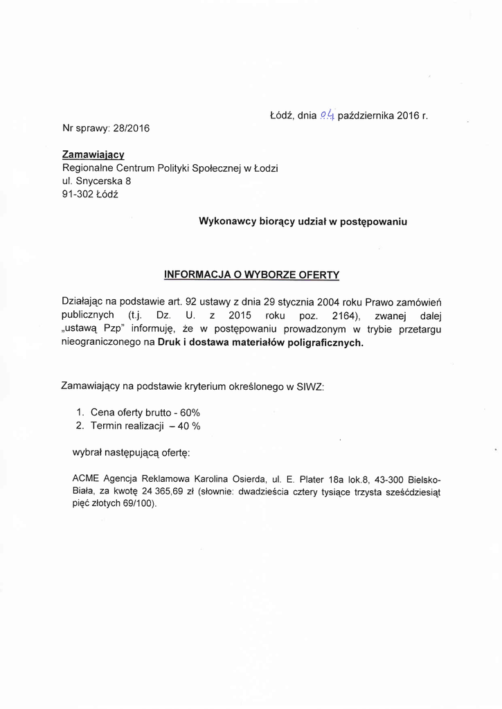 ŁódŹ, dnia Nr sprawy 2812016 9Ą pażdziernika2016 r. Zamawiaiacv Regionalne Centrum Polityki Społecznej w Łodzi ul. Snycerska 8 91-302 ŁódŹ Wykonawcy biorący tldział w postępowaniu INFORMACJA O VVYBORZE OFERTY Działając na podstawie ań. 92 ustawy z dnia 29 stycznia 2004 roku Prawo zamówień publicznych (t j Dz. u. z 2015 roku poz. 2164), zwanej dalej ,,ustawą Pzp" informuję, Że W postępowaniu prowadzonym W trybie przetargu nieograniczonego na Druk i dostawa materiałów poligraficznych. Zamawiający na podstawie kryterium określonego w SlWZ: 1' 2. Cena ofeńy brutto - 60% Termin realizaĄi _ 40 o/o wybrał następującą ofertę: ACME Agencja Reklamowa Karolina Osierda, ul. E. Plater 18a 1ok.8,43-300 BielskoBiała, za kwotę 24 365,69 zł (słownie: dwadzieścia cztery tysiące trzysta sześcdziesiąt pięÓ złotych 69/100). UZASADN!ENIE VVYBORU 1. Do uptywu terminu składania ofeń tj do dnia 30 września 2016 roku godz.10:00 do złoŻono 6 oferty: 7,) ACMEAgencja Reklamowa Karolina Osierda, ul. E. Plater 18a 1ok.8,43-300 BielskoBiała, za kwotę 24 365,69 zł (słownie: dwadzieścia cztery tysiące trzysta sześÓdziesiąt pięc złotych 69/1 00). 2) Agenqa Reklamy Eureka Plus Barbara Fedorowicz Ryszard Fedorowicz, ul. 3 Maja 11l10,35-030 Rzeszów' za kwotę 32075,94 zł (słownie: trzydzieści dwa tysiące siedemdziesiąt pięó złotych 94l100). 3) REMl-B Krzysztof Boiński, Adam Krakowski sp.j, ul. Strazacka 35, 43-382 BielskoBiała, za kwotę 28 465'89 zł (słownie: dwadzieścia osiem tysięcy czterysta sześćdziesiąt pięc złotych 89/1 00). 4) AgenĄa Reklamowa Logo-Ań. Andrzej Pietroczuk, ul. Gajowa 35, 17-200 Hajnowka, za kwotę 23 896'94 zł. (słownie: dwadzieścia tzy tysiące osiemset dziewięódziesiąt sześc94/100)' 5) Pro-Factum Spółka Jawna, ul. Winogronowa 17,05-831 Rozalin, za kwotę 3'1 759'83 zł (słownie: trzydzie$ci jeden tysięcy siedemset pięódziesiąt dziewięó 83/100). 6) Zapol Sobczyk Sp J , Al. Piastow 42, 71-062 Szczecin, za kwotę 41 979,90 zł (słownie' czterdzieścijeden tysięcy dziewięcset siedemdziesiąt dziewięÓ 90/1 00). 2. Wybór najkorzystniejszej Nr Nazwa ofeńy oferty: Cena Kryterium: Cena ofeńy brutto Kryterium: Termin realizacji 24 365,69zł 58,85pkt. 40 pkt. 98,85pkt. 40 pkt. 84,70 pkt wykonawcy (imię i nazwisko Wykonawcy) Razem !iczba punktów Miejsce ACME Agencja 1 2 Reklamowa Karolina Osierda, ul. E. Plater 18a lok.8, 43300 BielskoBiała, Agencja Reklamy Eureka Plus Barbara Fedorowicz Ryszard Fedorowicz, ul. 3 Maja 11n0,35-030 Rzeszów, 32 075,94zł 44,7)pkt. I ilt 3 4 5 6 REMI-B Krzysztof Boiński, Adam Krakowski sp.j, ul. Strazacka 35,43-382 Bielsko-Biała, Agencja Reklamowa Logo-Art. Andrzej Pietroczuk, ul. Gajowa 35,17200 Hajnowka Pro-Factum Społka Jawna, ul. Winogronowa 17,05-93'l Rozalin Zapol Sobczyk Sp. J. , Al. Piastów 42,71062 Szczecin V 50,37pkt 0 pkt. 23 896,94zł 60 pkt. 0 pkt. 60 pkt 31759,83zł 45,15 pkt 40 pkt. 85,15 pkt 41 979,90zł 34,15 pkt 0 pkt 34,15 pkt 28 465,89zł 50,37 pkt. IV il VI Z powyŻszego rankingu wynika, iŻ najkorzystniejsza ofeńa została złoŻona przez '' ACME Agencja Reklamowa Karolina Osierda, ul. E. Plater 18a |ok.8,43-300 BielskoBiała, za kwotę 24 365,69 zł (słownie: dwadzieścia cztery tysiące trzysta sześcdziesiąt pięć złotych 69/100). ofeńa spełnia warunki S|WZ i jest zgodna z ustawą Prawo zamowień publicznych' Cena ofeńy mieścisię W kwocie jaką ZamawiĄący moze przeznaczyć na sfinansowanie zamówienia. W ocenie dokonanej na podstawie kryterium określonego w S|WZ oferta uzyskała 98,85 punktow. DY Region Folityki KTOR g Centrum Łodzi