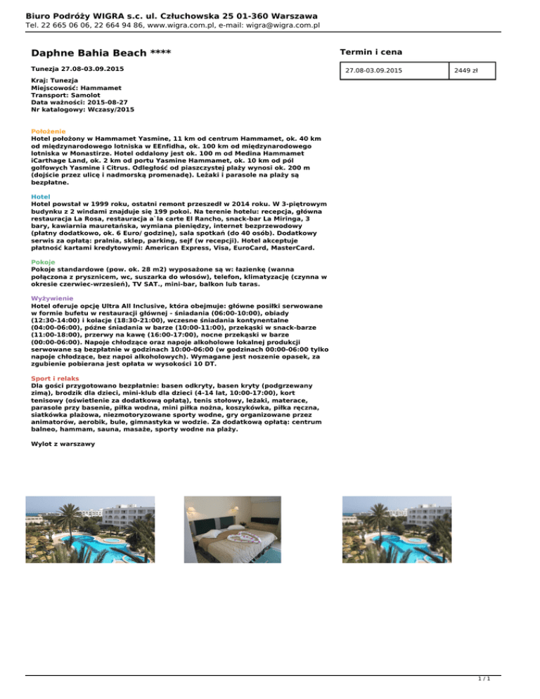 Biuro Podróży WIGRA s.c. ul. Człuchowska 25 01-360 Warszawa Tel. 22 665 06 06, 22 664 94 86, www.wigra.com.pl, e-mail: [email protected] Daphne Bahia Beach **** Tunezja 27.08-03.09.2015 Termin i cena 27.08-03.09.2015 2449 zł Kraj: Tunezja Miejscowość: Hammamet Transport: Samolot Data ważności: 2015-08-27 Nr katalogowy: Wczasy/2015 Położenie Hotel położony w Hammamet Yasmine, 11 km od centrum Hammamet, ok. 40 km od międzynarodowego lotniska w EEnfidha, ok. 100 km od międzynarodowego lotniska w Monastirze. Hotel oddalony jest ok. 100 m od Medina Hammamet iCarthage Land, ok. 2 km od portu Yasmine Hammamet, ok. 10 km od pól golfowych Yasmine i Citrus. Odległość od piaszczystej plaży wynosi ok. 200 m (dojście przez ulicę i nadmorską promenadę). Leżaki i parasole na plaży są bezpłatne. Hotel Hotel powstał w 1999 roku, ostatni remont przeszedł w 2014 roku. W 3-piętrowym budynku z 2 windami znajduje się 199 pokoi. Na terenie hotelu: recepcja, główna restauracja La Rosa, restauracja a`la carte El Rancho, snack-bar La Miringa, 3 bary, kawiarnia mauretańska, wymiana pieniędzy, internet bezprzewodowy (płatny dodatkowo, ok. 6 Euro/ godzinę), sala spotkań (do 40 osób). Dodatkowy serwis za opłatą: pralnia, sklep, parking, sejf (w recepcji). Hotel akceptuje płatność kartami kredytowymi: American Express, Visa, EuroCard, MasterCard. Pokoje Pokoje standardowe (pow. ok. 28 m2) wyposażone są w: łazienkę (wanna połączona z prysznicem, wc, suszarka do włosów), telefon, klimatyzację (czynna w okresie czerwiec-wrzesień), TV SAT., mini-bar, balkon lub taras. Wyżywienie Hotel oferuje opcję Ultra All Inclusive, która obejmuje: główne posiłki serwowane w formie bufetu w restauracji głównej - śniadania (06:00-10:00), obiady (12:30-14:00) i kolacje (18:30-21:00), wczesne śniadania kontynentalne (04:00-06:00), późne śniadania w barze (10:00-11:00), przekąski w snack-barze (11:00-18:00), przerwy na kawę (16:00-17:00), nocne przekąski w barze (00:00-06:00). Napoje chłodzące oraz napoje alkoholowe lokalnej produkcji serwowane są bezpłatnie w godzinach 10:00-06:00 (w godzinach 00:00-06:00 tylko napoje chłodzące, bez napoi alkoholowych). Wymagane jest noszenie opasek, za zgubienie pobierana jest opłata w wysokości 10 DT. Sport i relaks Dla gości przygotowano bezpłatnie: basen odkryty, basen kryty (podgrzewany zimą), brodzik dla dzieci, mini-klub dla dzieci (4-14 lat, 10:00-17:00), kort tenisowy (oświetlenie za dodatkową opłatą), tenis stołowy, leżaki, materace, parasole przy basenie, piłka wodna, mini piłka nożna, koszykówka, piłka ręczna, siatkówka plażowa, niezmotoryzowane sporty wodne, gry organizowane przez animatorów, aerobik, bule, gimnastyka w wodzie. Za dodatkową opłatą: centrum balneo, hammam, sauna, masaże, sporty wodne na plaży. Wylot z warszawy 1/1 Powered by TCPDF (www.tcpdf.org)