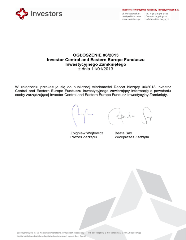 OGŁOSZENIE 06/2013 Investor Central and Eastern Europe Funduszu Inwestycyjnego Zamkniętego z dnia 11/01/2013 W załączeniu przekazuje się do publicznej wiadomości Raport bieżący 06/2013 Investor Central and Eastern Europe Funduszu Inwestycyjnego zawierający informację o powołaniu osoby zarządzającej Investor Central and Eastern Europe Fundusz Inwestycyjny Zamknięty. Zbigniew Wójtowicz Prezes Zarządu Beata Sax Wiceprezes Zarządu INVESTOR CENTRAL AND EASTERN EUROPE FIZ ZFP-E_3_07_06 korekta KOMISJA NADZORU FINANSOWEGO Raport bieżący nr 6 / 2013 (kolejny numer raportu / rok) Temat raportu: Informacja o powołaniu osoby zarządzającej lub nadzorującej fundusz Podstawa prawna: § 42 ust. 1pkt 32 rozporządzenia Ministra Finansów z dnia 19 lutego 2009 r. w sprawie informacji bieżących i okresowych przekazywanych przez emitentów papierów wartościowych oraz warunków uznawania za równoważne informacji wymaganych przepisami prawa państwa niebędącego państwem członkowskim (Dz. U. z 2009 r. Nr 33, poz. 259) Data przekazania: 2013-01-11 INVESTOR CENTRAL AND EASTERN EUROPE FUNDUSZ INWESTYCYJNY ZAMKNIĘTY (peł na nazwa funduszu) INVESTOR CENTRAL AND EASTERN EUROPE FIZ INVESTORS TFI S.A. (skrócona nazwa funduszu) (nazwa towarzystwa) 00-640 WARSZAWA (kod poc ztowy) (miejscowość) MOKOTOWSKA 1 (ulic a) ( numer) 22 378 91 00 22 378 91 01 (telefon) [email protected] (fax) 107-000-77-00 (e-mail) 141018278 (NIP) www.investors.pl (REGON) (WWW) TREŚĆRAPORTU: l.p. imię Andrzej nazwisko Kaczorowski zarządzanie lub nadzór Osoba zarządzająca Plik CV_Andrzej Kaczorowski.pdf opis kwalifikacji i doświadczeń zawodowych Opi s znajduje si ę w załączeniu data powołania 2013-01-11 Opis PODPISYOSÓBREPREZENTUJĄCYCHPODMIOT Data Imię i Nazwisko Stanowisko / Funkcja 2013-01-11 Zbigniew Wójtowi cz Prezes Zarządu 2013-01-11 Beata Sax Wic eprezes Zarządu Podpis Komisja Nadzoru Finansowego 1 CURRICULUM VITAE Andrzej Kaczorowski Data urodzenia: 14 marca 1973 r. DOŚWIADCZENIE ZAWODOWE: 2012 – dziś Wiceprezes Zarządu w Investors Holding S.A. 2012 – dziś 2010 – 2011 Członek Rady Nadzorczej Bytom S.A. 2010 – 2011 Członek Zarządu w Investors Holding S.A. 2011 – 2012 Członek Rady Nadzorczej w Investors Holding S.A. 2007 – 2012 Członek i Sekretarz Rady Nadzorczej w Domu Inwestycyjnym Investors S.A. 2011 – 2012 Członek Rady Nadzorczej w Investors Towarzystwie Funduszy Inwestycyjnych S.A. 2006 – 2011 Członek Zarządu w Investors Towarzystwie Funduszy Inwestycyjnych S.A. 2005 – 2011 Członek Komitetu Inwestycyjnego i Dyrektor Rynku Obligacji i Instrumentów Pochodnych w Investors Towarzystwie Funduszy Inwestycyjnych S.A. (później Zarządzający Funduszami Inwestycyjnymi) 2001 – 2005 niezależny inwestor giełdowy – w każdym roku, niezależnie od koniunktury giełdowej uzyskiwałem dodatnie stopy zwrotu z inwestycji w akcje oraz kontrakty terminowe, również na giełdach zagranicznych. 1998 – 2001 Urząd Nadzoru nad Funduszami Emerytalnymi, specjalista w Departamencie Pracowniczych Programów Emerytalnych. zajmowałem się licencjonowaniem i nadzorowaniem pracowniczych funduszy emerytalnych, opiniowaniem i tworzeniem aktów prawnych związanych z funkcjonowaniem funduszy emerytalnych 1996 – 1997 Ministerstwo Finansów, Departament Długu Publicznego. zajmowałem się analizowaniem wtórnego rynku obligacji skarbowych, trendów rynkowych na rynku, propozycjami zmian zasad funkcjonowania międzybankowego rynku obligacji skarbowych mających na celu poprawienie jego płynności 1995 – 1996 Raiffeisen Capital & Investment Polska S.A. – asystent maklera – zajmowałem się obsługą klientów na rynku obligacji skarbowych, organizowaniem transakcji na rynku międzybankowym głównie pomiędzy zakładami ubezpieczeń oraz bankami. Komentarze na temat sytuacji na rynku obligacji dla Reuters oraz Internet Securities. EDUKACJA: 1997 Szkoła Główna Handlowa w Warszawie – magister Finanse i Bankowość, „Zarządzanie portfelem obligacji” 02.1999 11.1999 Kurs na doradcę inwestycyjnego Kurs na maklerów rynku terminowego Warszawskiej Giełdy Towarowej Accounting of Pension Funds And Societies – kurs zorganizowany przez PriceWaterhouse Coopers w ramach progamu USAID Kurs dla Kandydatów na Specjalistów Ewodencji Papierów Wartościowych prowadzony przez Izbę Domów Maklerskich Pension System in the United Staes of America – kurs w Bostonie i Waszyngtonie zorganizowany przez PriceWaterhouse Cooprers zorganizowany w ramach programu USAID. The United States Department of Labor – Pension Law & Inevstigative Tachniques – dwutygodniowe szkolenie w Bostonie. Praca z pracownikami the US Dep. of Labor w zakresie nadzoru nad planami emerytalnymi 02.2000 03.2000 04.2000 11.2001 JĘZYKI: polski angielski język ojczysty płynnie w mowie i w piśmie (Business English Certificate 2, University of Cambridge) ZAINTERESOWANIA: squash, nurkowanie