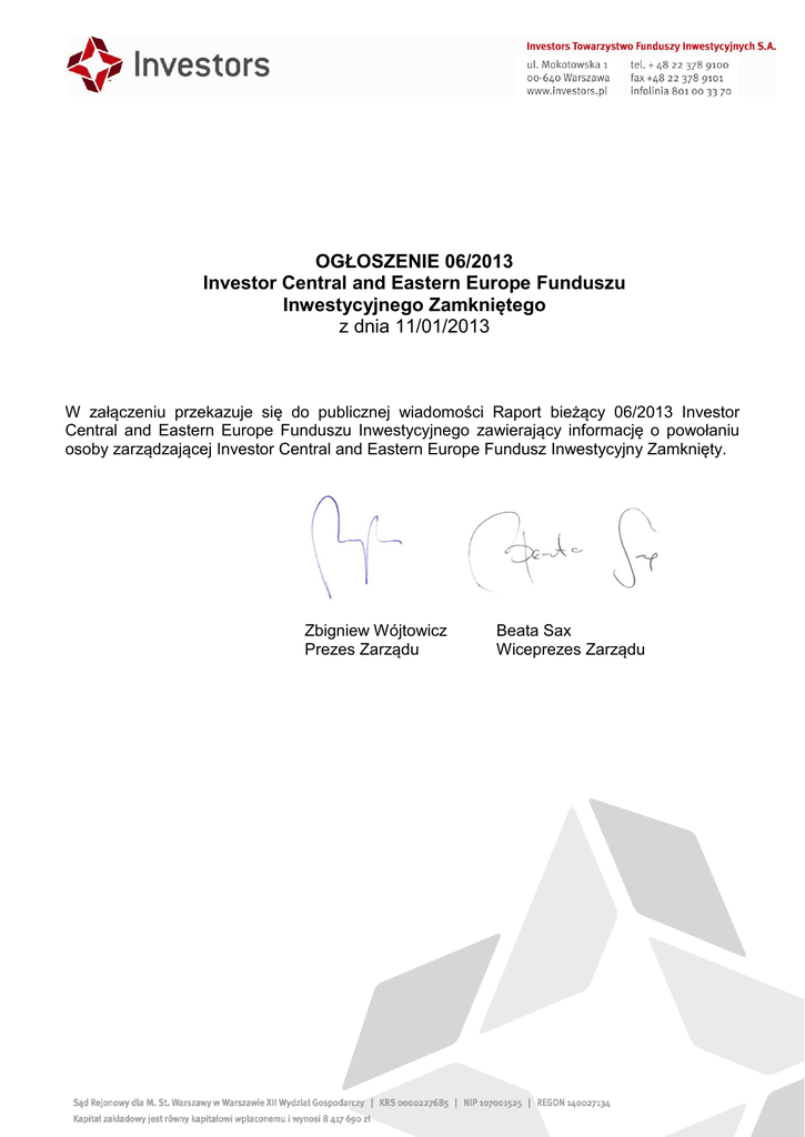 Investor CEE FIZ - Powołanie osoby zarządzającej