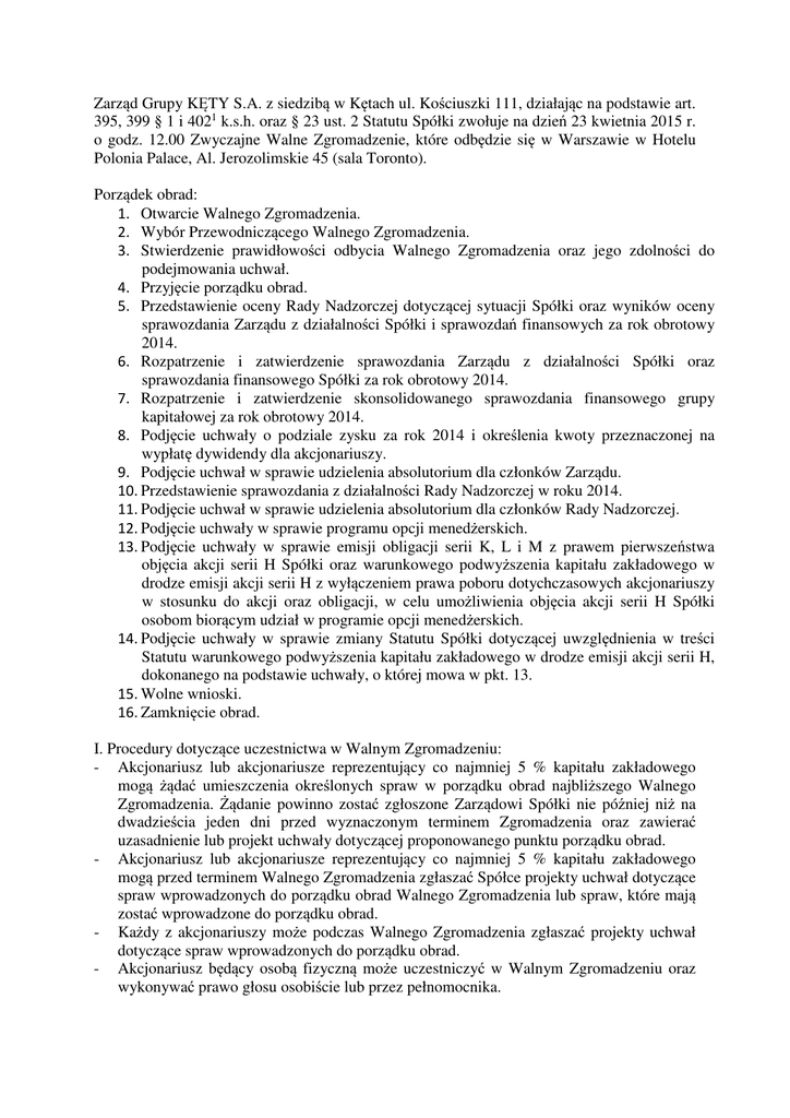 Zarząd Grupy KĘTY S.A. z siedzibą w Kętach ul. Kościuszki 111, działając na podstawie art. 395, 399 § 1 i 4021 k.s.h. oraz § 23 ust. 2 Statutu Spółki zwołuje na dzień 23 kwietnia 2015 r. o godz. 12.00 Zwyczajne Walne Zgromadzenie, które odbędzie się w Warszawie w Hotelu Polonia Palace, Al. Jerozolimskie 45 (sala Toronto). Porządek obrad: 1. Otwarcie Walnego Zgromadzenia. 2. Wybór Przewodniczącego Walnego Zgromadzenia. 3. Stwierdzenie prawidłowości odbycia Walnego Zgromadzenia oraz jego zdolności do podejmowania uchwał. 4. Przyjęcie porządku obrad. 5. Przedstawienie oceny Rady Nadzorczej dotyczącej sytuacji Spółki oraz wyników oceny sprawozdania Zarządu z działalności Spółki i sprawozdań finansowych za rok obrotowy 2014. 6. Rozpatrzenie i zatwierdzenie sprawozdania Zarządu z działalności Spółki oraz sprawozdania finansowego Spółki za rok obrotowy 2014. 7. Rozpatrzenie i zatwierdzenie skonsolidowanego sprawozdania finansowego grupy kapitałowej za rok obrotowy 2014. 8. Podjęcie uchwały o podziale zysku za rok 2014 i określenia kwoty przeznaczonej na wypłatę dywidendy dla akcjonariuszy. 9. Podjęcie uchwał w sprawie udzielenia absolutorium dla członków Zarządu. 10. Przedstawienie sprawozdania z działalności Rady Nadzorczej w roku 2014. 11. Podjęcie uchwał w sprawie udzielenia absolutorium dla członków Rady Nadzorczej. 12. Podjęcie uchwały w sprawie programu opcji menedżerskich. 13. Podjęcie uchwały w sprawie emisji obligacji serii K, L i M z prawem pierwszeństwa objęcia akcji serii H Spółki oraz warunkowego podwyższenia kapitału zakładowego w drodze emisji akcji serii H z wyłączeniem prawa poboru dotychczasowych akcjonariuszy w stosunku do akcji oraz obligacji, w celu umożliwienia objęcia akcji serii H Spółki osobom biorącym udział w programie opcji menedżerskich. 14. Podjęcie uchwały w sprawie zmiany Statutu Spółki dotyczącej uwzględnienia w treści Statutu warunkowego podwyższenia kapitału zakładowego w drodze emisji akcji serii H, dokonanego na podstawie uchwały, o której mowa w pkt. 13. 15. Wolne wnioski. 16. Zamknięcie obrad. I. Procedury dotyczące uczestnictwa w Walnym Zgromadzeniu: - Akcjonariusz lub akcjonariusze reprezentujący co najmniej 5 % kapitału zakładowego mogą żądać umieszczenia określonych spraw w porządku obrad najbliższego Walnego Zgromadzenia. Żądanie powinno zostać zgłoszone Zarządowi Spółki nie później niż na dwadzieścia jeden dni przed wyznaczonym terminem Zgromadzenia oraz zawierać uzasadnienie lub projekt uchwały dotyczącej proponowanego punktu porządku obrad. - Akcjonariusz lub akcjonariusze reprezentujący co najmniej 5 % kapitału zakładowego mogą przed terminem Walnego Zgromadzenia zgłaszać Spółce projekty uchwał dotyczące spraw wprowadzonych do porządku obrad Walnego Zgromadzenia lub spraw, które mają zostać wprowadzone do porządku obrad. - Każdy z akcjonariuszy może podczas Walnego Zgromadzenia zgłaszać projekty uchwał dotyczące spraw wprowadzonych do porządku obrad. - Akcjonariusz będący osobą fizyczną może uczestniczyć w Walnym Zgromadzeniu oraz wykonywać prawo głosu osobiście lub przez pełnomocnika. - - - - - - Akcjonariusz nie będący osobą fizyczną może uczestniczyć w Walnym Zgromadzeniu oraz wykonywać prawo głosu przez osobę uprawnioną do składania oświadczeń woli w jego imieniu lub przez pełnomocnika. Przedstawiciele takich podmiotów winni okazać aktualne wyciągi z rejestru wymieniające osoby uprawnione do reprezentowania tych podmiotów. Osoby nie wymienione w wyciągu winny okazać oryginał pełnomocnictwa podpisanego przez osoby upoważnione. Wymaga się pełnomocnictwa udzielonego na piśmie lub w postaci elektronicznej. Zawiadomienie o udzieleniu pełnomocnictwa w postaci elektronicznej powinno zostać przesłane przez akcjonariusza uprawnionego do uczestnictwa w Walnym Zgromadzeniu co najmniej na 3 dni przez terminem Walnego Zgromadzenia na adres mailowy [email protected] Informacja o udzieleniu pełnomocnictwa powinna zawierać również zakres pełnomocnictwa poprzez wskazanie liczby akcji, z których wykonywane będzie prawo głosu. W celu weryfikacji ważności pełnomocnictwa udzielonego w drodze elektronicznej, Spółka ma prawo podejmowania działań związanych z identyfikacją akcjonariusza i pełnomocnika, w szczególności ma prawo skierowania pytania zwrotnego w formie elektronicznej oraz prawo kontaktu telefonicznego. Brak udzielenia odpowiedzi na zadawane pytania w trakcie weryfikacji będzie traktowany jako brak możliwości weryfikacji udzielenia pełnomocnictwa i stanowić będzie podstawę do odmowy dopuszczenia pełnomocnika do udziału w Walnym Zgromadzeniu. Jeżeli pełnomocnikiem na Walnym Zgromadzeniu jest członek zarządu, członek rady nadzorczej, likwidator, pracownik Spółki lub członek organów lub pracownik spółki zależnej od Grupa KĘTY S.A., pełnomocnictwo może upoważniać do reprezentacji tylko na jednym Walnym Zgromadzeniu. Pełnomocnik ma obowiązek ujawnić akcjonariuszowi okoliczności wskazujące na istnienie bądź możliwość wystąpienia konfliktu interesów. Pełnomocnik taki głosuje zgodnie z instrukcjami udzielonymi przez akcjonariusza, zaś udzielenie dalszego pełnomocnictwa jest wyłączone. Wszelkie dokumenty sporządzone w języku obcym winny być przedstawione wraz z tłumaczeniem na język polski dokonanym przez tłumacza przysięgłego. Statut Grupy KĘTY S.A. oraz Regulamin Walnego Zgromadzenia Grupy KĘTY S.A. nie przewidują możliwości wykonywania prawa głosu drogą korespondencyjną Statut Grupy KĘTY S.A. oraz Regulamin Walnego Zgromadzenia Grupy KĘTY S.A. przewidują możliwość uczestniczenia w Walnym Zgromadzeniu również przy wykorzystaniu środków komunikacji elektronicznej. Jednakże do określenia szczegółowych zasad takiego uczestnictwa jest upoważniony Zarząd Spółki. Zarząd Spółki nie przewiduje