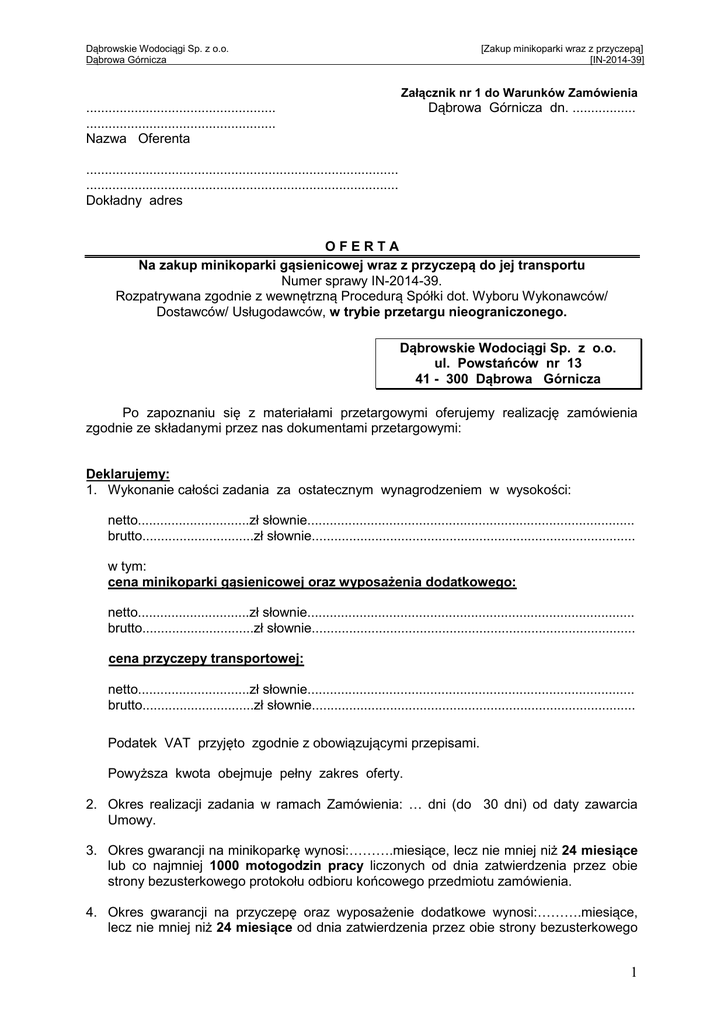 Dąbrowskie Wodociągi Sp. z o.o. Dąbrowa Górnicza [Zakup minikoparki wraz z przyczepą] [IN-2014-39] Załącznik nr 1 do Warunków Zamówienia ................................................... ................................................... Nazwa Oferenta Dąbrowa Górnicza dn. ................. .................................................................................... .................................................................................... Dokładny adres OFERTA Na zakup minikoparki gąsienicowej wraz z przyczepą do jej transportu Numer sprawy IN-2014-39. Rozpatrywana zgodnie z wewnętrzną Procedurą Spółki dot. Wyboru Wykonawców/ Dostawców/ Usługodawców, w trybie przetargu nieograniczonego. Dąbrowskie Wodociągi Sp. z o.o. ul. Powstańców nr 13 41 - 300 Dąbrowa Górnicza Po zapoznaniu się z materiałami przetargowymi oferujemy realizację zamówienia zgodnie ze składanymi przez nas dokumentami przetargowymi: Deklarujemy: 1. Wykonanie całości zadania za ostatecznym wynagrodzeniem w wysokości: netto..............................zł słownie........................................................................................ brutto..............................zł słownie....................................................................................... w tym: cena minikoparki gąsienicowej oraz wyposażenia dodatkowego: netto..............................zł słownie........................................................................................ brutto..............................zł słownie....................................................................................... cena przyczepy transportowej: netto..............................zł słownie........................................................................................ brutto..............................zł słownie....................................................................................... Podatek VAT przyjęto zgodnie z obowiązującymi przepisami. Powyższa kwota obejmuje pełny zakres oferty. 2. Okres realizacji zadania w ramach Zamówienia: … dni (do 30 dni) od daty zawarcia Umowy. 3. Okres gwarancji na minikoparkę wynosi:……….miesiące, lecz nie mniej niż 24 miesiące lub co najmniej 1000 motogodzin pracy liczonych od dnia zatwierdzenia przez obie strony bezusterkowego protokołu odbioru końcowego przedmiotu zamówienia. 4. Okres gwarancji na przyczepę oraz wyposażenie dodatkowe wynosi:……….miesiące, lecz nie mniej niż 24 miesiące od dnia zatwierdzenia przez obie strony bezusterkowego 1 Dąbrowskie Wodociągi Sp. z o.o. Dąbrowa Górnicza [Zakup minikoparki wraz z przyczepą] [IN-2014-39] protokołu odbioru końcowego przedmiotu zamówienia. 5. Gwarantujemy autoryzowany serwis gwarancyjny i pogwarancyjny. 6. Zapewniamy czas reakcji serwisu: - 6 godzin od otrzymania zgłoszenia przesłanego faksem/e-mailem, o wystąpieniu awarii/wady minikoparki lub przyczepy na placu budowy, poza siedzibą Zamawiającego; 48 godzin od otrzymania zgłoszenia przesłanego faksem/e-mailem, o wystąpieniu awarii/wady minikoparki lub przyczepy na terenie siedziby Zamawiającego. Jednocześnie oświadczamy, że: - Znane nam są warunki postępowania określone w Warunkach Zamówienia; Zapoznaliśmy się z projektem Umowy, który przyjmujemy bez zastrzeżeń; Zdobyliśmy wszystkie informacje niezbędne do prawidłowego przygotowania Oferty; Jesteśmy podatnikiem podatku od towarów i usług. Niniejsza oferta wraz z załącznikami Umowy. będzie stanowiła podstawę do zawarcia ------------------------------------podpis Oferenta Załączniki : 1. Aktualny odpis z właściwego rejestru albo aktualne zaświadczenie o wpisie do ewidencji działalności gospodarczej, jeżeli odrębne przepisy wymagają wpisu do rejestru lub zgłoszenia do ewidencji działalności gospodarczej, w celu wykazania braku podstaw do wykluczenia, wystawiony nie wcześniej niż 6 miesięcy przed upływem terminu składania ofert, a w stosunku do osób fizycznych oświadczenia o braku podstaw do wykluczenia Oferenta z uwagi na jego upadłość lub likwidację. 2. Aktualne zaświadczenie właściwego Naczelnika Urzędu Skarbowego potwierdzające, że Oferent nie zalega z opłacaniem podatków, lub zaświadczenie, że uzyskał przewidziane prawem zwolnienie, odroczenie lub rozłożenie na raty zaległych płatności lub wstrzymanie w całości wykonania decyzji właściwego organu - wystawione nie wcześniej niż 3 miesiące przed upływem terminu składania ofert. 3. Aktualne zaświadczenie właściwego oddziału Zakładu Ubezpieczeń Społecznych lub Kasy Rolniczego Ubezpieczenia Społecznego potwierdzające, że Oferent nie zalega z opłacaniem składek na ubezpieczenie zdrowotne i społeczne, lub potwierdzenia, że uzyskał przewidziane prawem zwolnienie, odroczenie lub rozłożenie na raty zaległych płatności lub wstrzymanie w całości wykonania decyzji właściwego organu - wystawione nie wcześniej niż 3 miesiące przed upływem terminu składania ofert. 4. Aktualną informację z Krajowego Rejestru Karnego zgodnie z punktem 2.5.5 WZ do punktu 2.5.11.WZ, wystawionego nie wcześniej niż 6 miesięcy przed upływem terminu składania ofert. 5. Oświadczenie o braku podstaw do wykluczenia, zgodnie z art. 24 ust. 1 i 2. Ustawy Prawo zamówień publicznych (Dz. U. 2013 r. poz. 907 z późniejszymi zmianami), którego wzór stanowi załącznik nr 1/2 do WZ. 6. Oświadczenie, że Oferent posiada uprawnienia do wykonywania określonej działalności lub czynności, jeżeli przepisy prawa nakładają obowiązek ich posiadania, a także posiada wiedzę i doświadczenie zapewniające wykonanie zamówienia, dysponuje 2 Dąbrowskie Wodociągi Sp. z o.o. Dąbrowa Górnicza [Zakup minikoparki wraz z przyczepą] [IN-2014-39] odpowiednim potencjałem technicznym oraz osobami zdolnymi do wykonania zamówienia, znajduje się w sytuacji ekonomicznej i finansowej zapewniającej wy