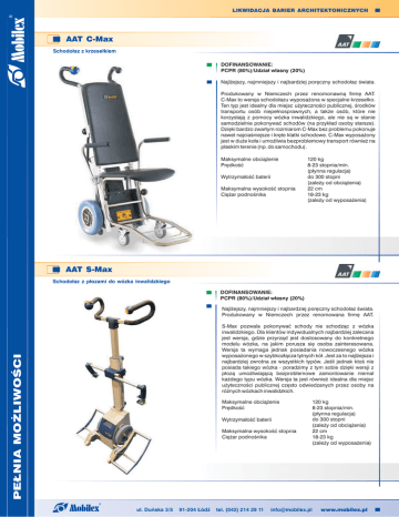 LIKWIDACJA BARIER ARCHITEKTONICZNYCH AAT C-Max Schodołaz z krzesełkiem DOFINANSOWANIE: PCPR (80%)/Udział własny (20%) Najlżejszy, najmniejszy i najbardziej poręczny schodołaz świata. Produkowany w Niemczech przez renomonawną firmę AAT. C-Max to wersja schodołazu wyposażona w specjalne krzesełko. Ten typ jest idealny dla miejsc użyteczności publicznej, środków transportu osób niepełnosprawnych, a także osób, które nie korzystają z pomocy wózka inwalidzkiego, ale nie są w stanie samodzielnie pokonywać schodów (na przykład osoby starsze). Dzięki bardzo zwartym rozmiarom C-Max bez problemu pokonuje nawet najciaśniejsze i kręte klatki schodowe. C-Max wyposażony jest w duże koła i umożliwia bezproblemowy transport również na płaskim terenie (np. do samochodu). Maksymalne obciążenie Prędkość Wytrzymałość baterii Maksymalna wysokość stopnia Ciężar podnośnika 120 kg 8-23 stopnia/min. (płynna regulacja) do 300 stopni (zależy od obciążenia) 22 cm 18-23 kg (zależy od wyposażenia) AAT S-Max Schodołaz z płozami do wózka inwalidzkiego DOFINANSOWANIE: PCPR (80%)/Udział własny (20%) Najlżejszy, najmniejszy i najbardziej poręczny schodołaz świata. Produkowany w Niemczech przez renomowana firmę AAT. PEŁNIA MOŻLIWOŚCI S-Max pozwala pokonywać schody nie schodząc z wózka inwalidzkiego. Dla klientów indywidualnych najbardziej zalecana jest wersja, gdzie przyrząd jest dostosowany do konkretnego modelu wózka, na jakim porusza się osoba zainteresowana. Wersja ta wymaga jednak posiadania nowoczesnego wózka wyposażonego w szybkozłącza tylnych kół. Jest za to najlżejsza i najbardziej zwrotna ze wszystkich typów. Jeśli jednak ktoś nie posiada takiego wózka - poradzimy z tym sobie dzięki wersji z płozą umożliwiającą bezproblemowe zamontowanie niemal każdego typu wózka. Wersja ta jest również idealna dla miejsc użyteczności publicznej często odwiedzanych przez osoby na różnych wózkach inwalidzkich. Maksymalne obciążenie Prędkość Wytrzymałość baterii Maksymalna wysokość stopnia Ciężar podnośnika ul. Duńska 3/5 91-204 Łódź tel. (042) 214 29 11 [email protected] 120 kg 8-23 stopnia/min. (płynna regulacja) do 300 stopni (zależy od obciążenia) 22 cm 18-23 kg (zależy od wyposażenia) www.mobilex.pl