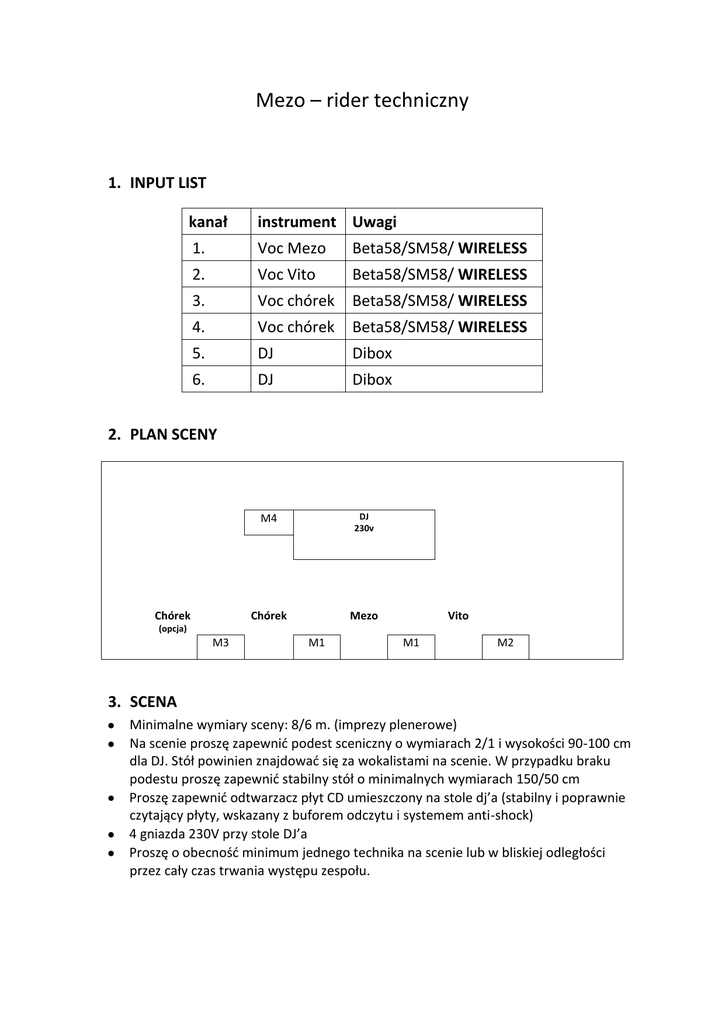 Mezo – rider techniczny 1. INPUT LIST kanał instrument Uwagi 1. Voc Mezo Beta58/SM58/ WIRELESS 2. Voc Vito Beta58/SM58/ WIRELESS 3. Voc chórek Beta58/SM58/ WIRELESS 4. Voc chórek Beta58/SM58/ WIRELESS 5. DJ Dibox 6. DJ Dibox M4 DJ 230v Chórek Mezo 2. PLAN SCENY Chórek Vito (opcja) M3 M1 M1 M2 3. SCENA Minimalne wymiary sceny: 8/6 m. (imprezy plenerowe) Na scenie proszę zapewnić podest sceniczny o wymiarach 2/1 i wysokości 90-100 cm dla DJ. Stół powinien znajdować się za wokalistami na scenie. W przypadku braku podestu proszę zapewnić stabilny stół o minimalnych wymiarach 150/50 cm Proszę zapewnić odtwarzacz płyt CD umieszczony na stole dj’a (stabilny i poprawnie czytający płyty, wskazany z buforem odczytu i systemem anti-shock) 4 gniazda 230V przy stole DJ’a Proszę o obecność minimum jednego technika na scenie lub w bliskiej odległości przez cały czas trwania występu zespołu. 4. SYSTEM NAGŁOŚNIENIOWY F.O.H. System nagłośnieniowy powinien mieć moc adekwatną do wielkości imprezy. System musi równomiernie pokrywać dźwiękiem cały obszar widowni (proszę pamiętać o frontfillach), musi być bezwzględnie uziemiony, wolny od szumów i przydźwięków sieciowych. Do klubów i małych pomieszczeń zamkniętych: co najmniej trójdrożny system nagłaśniający mocy odpowiedniej dla danego miejsca, Imprezy plenerowe, hale, sale koncertowe: co najmniej trójdrożny system nagłaśniający o mocy odpowiedniej dla danego miejsca Preferowane systemy nagłośnieniowe o uznanej reputacji: Meyer, d&b, Nexo, Polaudio, L’acoustic, JBL Vrx, Vertec itp. Nie dopuszcza się stosowania systemów nagłośnieniowych niewiadomego pochodzenia, samoróbek itd. Proszę zwrócić uwagę, aby mikrofony dla wykonawców nie były „niższej klasy” niż te wymienione. Nie dopuszcza się urządzeń typu: Alphard, Sekaku, Omnitronic, Sennheiser freeport, Shure PG itd… Preferowane systemy: Shure SLX, Shure ULX, Sennheiser EW100 lub wyższe 5. KONSOLA F.O.H. 6 kanałów do wyłącznej dyspozycji realizatora. Mikser musi posiadać przestrajalny filtr górno przepustowy, czteropunktowa korekcja EQ w tym minimum dwa pełne filtry parametryczne. 4 kompresory Dwa efekty: reverb oraz delay. Konsola powinna być ustawiona centralnie na osi sceny, wśród publiczności, odpowiednio zabezpieczona przed warunkami atmosferycznymi. Preferowane konsolety cyfrowe: Soundcraft Vi/Si, Midas Pro, Allen&Heath iLive/GLD, Digico SD 6. SYSTEM MONITOROWY: Konsola monitorowa powinna być usytuowana w bezpośrednim pobliżu sceny, zapewniającym obustronny kontakt wzrokowy realizatora monitorowego z muzykami na scenie 6 kanałów do wyłącznej dyspozycji realizatora. Mikser musi posiadać przestrajalny filtr górno przepustowy, czteropunktowa korekcja EQ w tym minimum dwa pełne filtry parametryczne. 3 kompresory minimum 4 wysyłki AUX. Na każdą wysyłkę AUX musi być zainsertowany 31 pasmowy korektor graficzny. 7. ZESTAWY MONITOROWE: 1. M1 – zestaw podłogowy Mezo (dwie kolumny m.in. 500W każda) 2. M2 – Vito (kolumna m.in. 500W) 3. M3 – Chórek (kolumna m.in. 500W) 4. M4 – DJ (kolumna m.in. 500W) 8. UWAGI W szczególnych wypadkach (małe sale, kluby, imprezy zamknięte) dopuszcza się możliwość zrezygnowania z konsoli monitorowej i sterowania monitorami z konsoli FOH. W tej sytuacji należy w konsoli FOH zarezerwować cztery tory AUX na wyłączność zespołu. Statywy mikrofonowe na czas występu zespołu są zbędne W każdym przypadku proszę o kontakt w celu potwierdzenia spełnienia rideru. Wszelkie zmiany w riderze winny być potwierdzone i zaakceptowane przez obie strony w formie pisemnej (e-mail). W kwestii pytań i ustalenia szczegółów proszę o kontakt. Antos Sobucki +48604965306 [email protected]