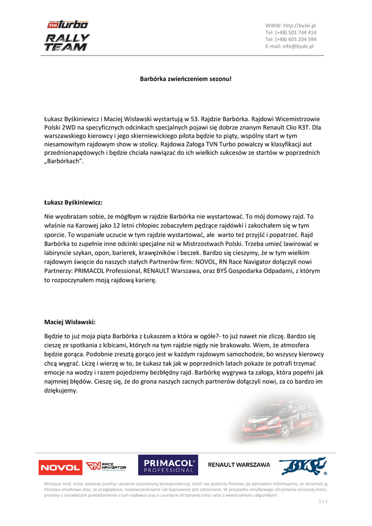 WWW: http://byski.pl Tel: (+48) 501 744 414 Tel: (+48) 605 204 594 E-mail: [email protected] Barbórka zwieńczeniem sezonu! Łukasz Byśkiniewicz i Maciej Wisławski wystartują w 53. Rajdzie Barbórka. Rajdowi Wicemistrzowie Polski 2WD na specyficznych odcinkach specjalnych pojawi się dobrze znanym Renault Clio R3T. Dla warszawskiego kierowcy i jego skierniewickiego pilota będzie to piąty, wspólny start w tym niesamowitym rajdowym show w stolicy. Rajdowa Załoga TVN Turbo powalczy w klasyfikacji aut przednionapędowych i będzie chciała nawiązać do ich wielkich sukcesów ze startów w poprzednich „Barbórkach”. Łukasz Byśkiniewicz: Nie wyobrażam sobie, że mógłbym w rajdzie Barbórka nie wystartować. To mój domowy rajd. To właśnie na Karowej jako 12 letni chłopiec zobaczyłem pędzące rajdówki i zakochałem się w tym sporcie. To wspaniałe uczucie w tym rajdzie wystartować, ale warto też przyjść i popatrzeć. Rajd Barbórka to zupełnie inne odcinki specjalne niż w Mistrzostwach Polski. Trzeba umieć lawirować w labiryncie szykan, opon, barierek, krawężników i beczek. Bardzo się cieszymy, że w tym wielkim rajdowym święcie do naszych stałych Partnerów firm: NOVOL, RN Race Navigator dołączyli nowi Partnerzy: PRIMACOL Professional, RENAULT Warszawa, oraz BYŚ Gospodarka Odpadami, z którym to rozpoczynałem moją rajdową karierę. Maciej Wisławski: Będzie to już moja piąta Barbórka z Łukaszem a która w ogóle?- to już nawet nie zliczę. Bardzo się cieszę ze spotkania z kibicami, których na tym rajdzie nigdy nie brakowało. Wiem, że atmosfera będzie gorąca. Podobnie zresztą gorąco jest w każdym rajdowym samochodzie, bo wszyscy kierowcy chcą wygrać. Liczę i wierzę w to, że Łukasz tak jak w poprzednich latach pokaże że potrafi trzymać emocje na wodzy i razem pojedziemy bezbłędny rajd. Barbórkę wygrywa ta załoga, która popełni jak najmniej błędów. Cieszę się, że do grona naszych zacnych partnerów dołączyli nowi, za co bardzo im dziękujemy. Niniejsza treść może zawierać poufną i prawnie zastrzeżoną korespondencję. Jeżeli nie jesteście Państwo jej adresatem informujemy, że otrzymali ją Państwo omyłkowo oraz, że przeglądanie, rozpowszechnianie lub kopiowanie jest zabronione. W przypadku omyłkowego otrzymania niniejszej treści, prosimy o niezwłoczne powiadomienie o tym nadawcy oraz o usunięcie otrzymanej treści wraz z ewentualnymi załącznikami. 1z1