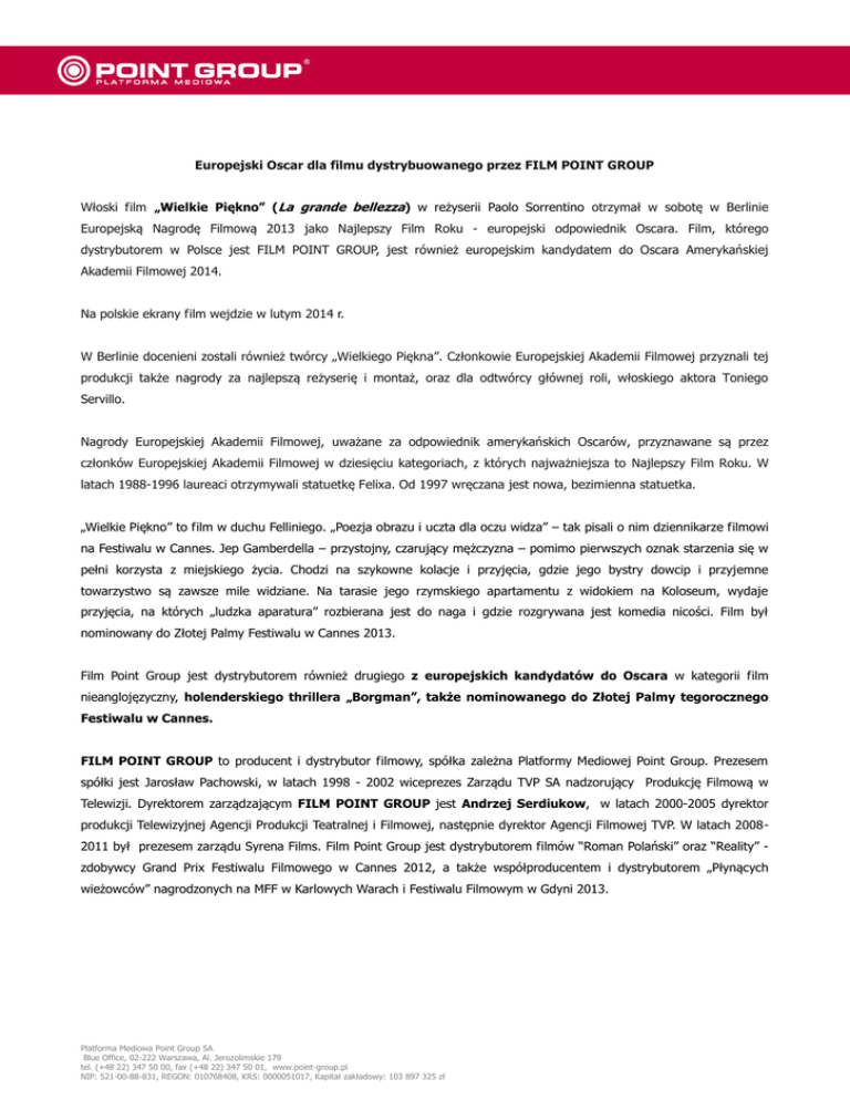 Europejski Oscar dla filmu dystrybuowanego przez FILM POINT GROUP Włoski film „Wielkie Piękno” (La grande bellezza) w reżyserii Paolo Sorrentino otrzymał w sobotę w Berlinie Europejską Nagrodę Filmową 2013 jako Najlepszy Film Roku - europejski odpowiednik Oscara. Film, którego dystrybutorem w Polsce jest FILM POINT GROUP, jest również europejskim kandydatem do Oscara Amerykańskiej Akademii Filmowej 2014. Na polskie ekrany film wejdzie w lutym 2014 r. W Berlinie docenieni zostali również twórcy „Wielkiego Piękna”. Członkowie Europejskiej Akademii Filmowej przyznali tej produkcji także nagrody za najlepszą reżyserię i montaż, oraz dla odtwórcy głównej roli, włoskiego aktora Toniego Servillo. Nagrody Europejskiej Akademii Filmowej, uważane za odpowiednik amerykańskich Oscarów, przyznawane są przez członków Europejskiej Akademii Filmowej w dziesięciu kategoriach, z których najważniejsza to Najlepszy Film Roku. W latach 1988-1996 laureaci otrzymywali statuetkę Felixa. Od 1997 wręczana jest nowa, bezimienna statuetka. „Wielkie Piękno” to film w duchu Felliniego. „Poezja obrazu i uczta dla oczu widza” – tak pisali o nim dziennikarze filmowi na Festiwalu w Cannes. Jep Gamberdella – przystojny, czarujący mężczyzna – pomimo pierwszych oznak starzenia się w pełni korzysta z miejskiego życia. Chodzi na szykowne kolacje i przyjęcia, gdzie jego bystry dowcip i przyjemne towarzystwo są zawsze mile widziane. Na tarasie jego rzymskiego apartamentu z widokiem na Koloseum, wydaje przyjęcia, na których „ludzka aparatura” rozbierana jest do naga i gdzie rozgrywana jest komedia nicości. Film był nominowany do Złotej Palmy Festiwalu w Cannes 2013. Film Point Group jest dystrybutorem również drugiego z europejskich kandydatów do Oscara w kategorii film nieanglojęzyczny, holenderskiego thrillera „Borgman”, także nominowanego do Złotej Palmy tegorocznego Festiwalu w Cannes. FILM POINT GROUP to producent i dystrybutor filmowy, spółka zależna Platformy Mediowej Point Group. Prezesem spółki jest Jarosław Pachowski, w latach 1998 - 2002 wiceprezes Zarządu TVP SA nadzorujący Produkcję Filmową w Telewizji. Dyrektorem zarządzającym FILM POINT GROUP jest Andrzej Serdiukow, w latach 2000-2005 dyrektor produkcji Telewizyjnej Agencji Produkcji Teatralnej i Filmowej, następnie dyrektor Agencji Filmowej TVP. W latach 20082011 był prezesem zarządu Syrena Films. Film Point Group jest dystrybutorem filmów “Roman Polański” oraz “Reality” zdobywcy Grand Prix Festiwalu Filmowego w Cannes 2012, a także współproducentem i dystrybutorem „Płynących wieżowców” nagrodzonych na MFF w Karlowych Warach i Festiwalu Filmowym w Gdyni 2013. Platforma Mediowa Point Group SA Blue Office, 02-222 Warszawa, Al. Jerozolimskie 179 tel. (+48 22) 347 50 00, fax (+48 22) 347 50 01, www.point-group.pl NIP: 521-00-88-831, REGON: 010768408, KRS: 0000051017, Kapitał zakładowy: 103 897 325 zł