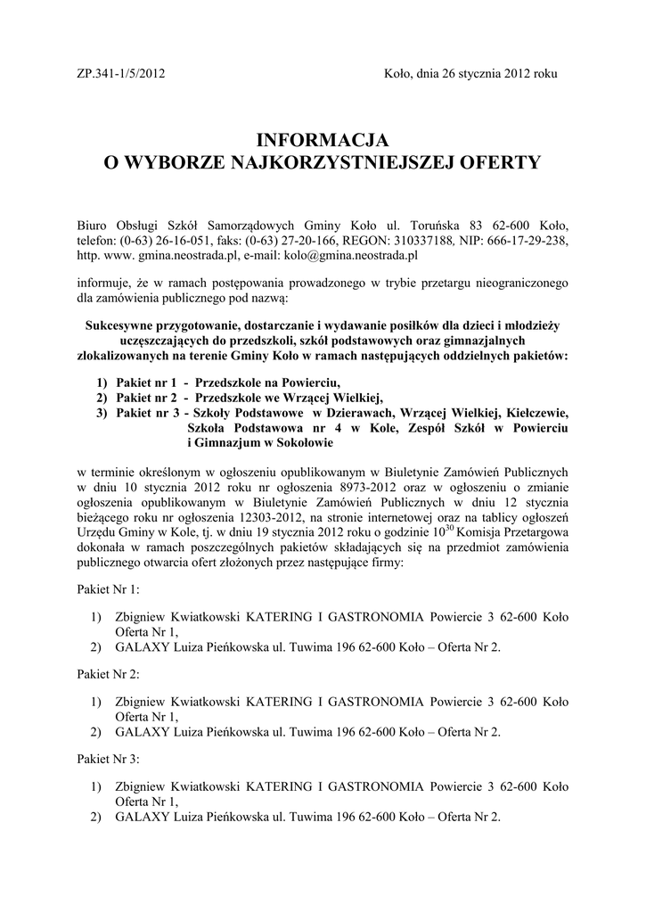 ZP.341-1/5/2012 Koło, dnia 26 stycznia 2012 roku INFORMACJA O WYBORZE NAJKORZYSTNIEJSZEJ OFERTY Biuro Obsługi Szkół Samorządowych Gminy Koło ul. Toruńska 83 62-600 Koło, telefon: (0-63) 26-16-051, faks: (0-63) 27-20-166, REGON: 310337188, NIP: 666-17-29-238, http. www. gmina.neostrada.pl, e-mail: [email protected] informuje, że w ramach postępowania prowadzonego w trybie przetargu nieograniczonego dla zamówienia publicznego pod nazwą: Sukcesywne przygotowanie, dostarczanie i wydawanie posiłków dla dzieci i młodzieży uczęszczających do przedszkoli, szkół podstawowych oraz gimnazjalnych zlokalizowanych na terenie Gminy Koło w ramach następujących oddzielnych pakietów: 1) Pakiet nr 1 - Przedszkole na Powierciu, 2) Pakiet nr 2 - Przedszkole we Wrzącej Wielkiej, 3) Pakiet nr 3 - Szkoły Podstawowe w Dzierawach, Wrzącej Wielkiej, Kiełczewie, Szkoła Podstawowa nr 4 w Kole, Zespół Szkół w Powierciu i Gimnazjum w Sokołowie w terminie określonym w ogłoszeniu opublikowanym w Biuletynie Zamówień Publicznych w dniu 10 stycznia 2012 roku nr ogłoszenia 8973-2012 oraz w ogłoszeniu o zmianie ogłoszenia opublikowanym w Biuletynie Zamówień Publicznych w dniu 12 stycznia bieżącego roku nr ogłoszenia 12303-2012, na stronie internetowej oraz na tablicy ogłoszeń Urzędu Gminy w Kole, tj. w dniu 19 stycznia 2012 roku o godzinie 1030 Komisja Przetargowa dokonała w ramach poszczególnych pakietów składających się na przedmiot zamówienia publicznego otwarcia ofert złożonych przez następujące firmy: Pakiet Nr 1: 1) 2) Zbigniew Kwiatkowski KATERING I GASTRONOMIA Powiercie 3 62-600 Koło Oferta Nr 1, GALAXY Luiza Pieńkowska ul. Tuwima 196 62-600 Koło – Oferta Nr 2. Pakiet Nr 2: 1) 2) Zbigniew Kwiatkowski KATERING I GASTRONOMIA Powiercie 3 62-600 Koło Oferta Nr 1, GALAXY Luiza Pieńkowska ul. Tuwima 196 62-600 Koło – Oferta Nr 2. Pakiet Nr 3: 1) 2) Zbigniew Kwiatkowski KATERING I GASTRONOMIA Powiercie 3 62-600 Koło Oferta Nr 1, GALAXY Luiza Pieńkowska ul. Tuwima 196 62-600 Koło – Oferta Nr 2. W toku oceny i wyboru najkorzystniejszej oferty w ramach oddzielnych pakietów skradających się na przedmiot zamówienia publicznego na podstawie przyjętych kryteriów tj. najniższej zryczałtowanej ceny ogółem za wykonanie usług cateringowych oraz doświadczenia zawodowego Wykonawców, Komisja Przetargowa przyznała poszczególnym ofertom następującą liczbę punktów: Pakiet Nr 1: 1) Oferta Nr 1: a) b) c) cena doświadczenie ogółem - 80,00 pkt 20,00 pkt, 100,00 pkt. - 76,67 pkt, 4,99 pkt, 81,66 pkt. - 80,00 pkt 20,00 pkt, 100,00 pkt. - 79,97 pkt, 4,99 pkt, 84,96 pkt. - 73,49 pkt 20,00 pkt, 93,49 pkt. - 80,00 pkt, 4,99 pkt, 84,99 pkt. 2) Oferta Nr 2: a) b) c) cena doświadczenie ogółem Pakiet Nr 2: 1) Oferta Nr 1: a) b) c) cena doświadczenie ogółem 2) Oferta Nr 2: a) b) c) cena doświadczenie ogółem Pakiet Nr 3: 1) Oferta Nr 1: a) b) c) cena doświadczenie ogółem 2) Oferta Nr 2: a) b) c) cena doświadczenie ogółem W związku z powyższym informujemy, że za najkorzystniejsze w ramach poszczególnych pakietów objętych przedmiot zamówienia w rozumieniu art. 2 pkt 5 ustawy Prawo zamówień publicznych zostały uznane oferty złożone przez następujące firmy: Pakiet Nr 1: Zbigniew Kwiatkowski KATERING I GASTRONOMIA Powiercie 3 62-600 Koło o wartości 45.859,93 zł brutto. Pakiet Nr 2: Zbigniew Kwiatkowski KATERING I GASTRONOMIA Powiercie 3 62-600 Koło o wartości 38.160,23 zł brutto. Pakiet Nr 3: Zbigniew Kwiatkowski KATERING I GASTRONOMIA Powiercie 3 62-600 Koło o wartości 55.247,85 zł brutto. Jednocześnie zawiadamiamy, że stosowne umowy w ramach poszczególnych pakietów objętych przedmiotem zamówienia publicznego, zgodnie z art. 94 ust. 2 pkt 3 lit. a) ustawy Prawo zamówień publicznych zostaną podpisane w dniu 31 stycznia bieżącego roku.