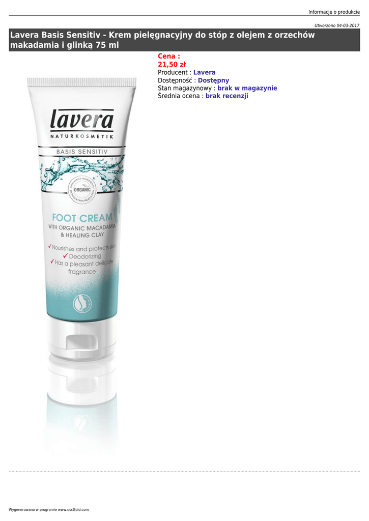 Informacje o produkcie Utworzono 04-03-2017 Lavera Basis Sensitiv - Krem pielęgnacyjny do stóp z olejem z orzechów makadamia i glinką 75 ml Cena : 21,50 zł Producent : Lavera Dostępność : Dostępny Stan magazynowy : brak w magazynie Średnia ocena : brak recenzji Wygenerowano w programie www.oscGold.com Krem do stóp, który wygładza, zmiękcza oraz chroni przed nadmiernym poceniem i nieprzyjemnym zapachem. Zawarte w nim ekologiczne masło shea oraz oleje: z orzechów makadamia, sojowy oraz słonecznikowy nawilżają i zmiękczają suchą, popękaną skórę. Wosk pszczeli i lanolina chronią przed utratą wilgoci. Naturalna glinka pochłania pot oraz działa detoksykująco. Wyciąg z liści brzozy działa przeciwzapalnie i przeciwbakteryjnie. Wyciąg z mirtu działa odkażająco i odświeżająco. INCI: Water (Aqua), Glycine Soja (Soybean) Oil*, Cellulose, Alcohol*, Glycerin, Myristyl Alcohol, Macadamia Ternifolia Seed Oil*, Glyceryl Stearate Citrate, Cetearyl Alcohol, Beeswax (Cera Alba)*, Lanolin, Hectorite, Squalane, Loess, Xanthan Gum, Lanolin Alcohol, Hydrogenated Palm Glycerides, Calendula Officinalis Flower Extract*, Betula Alba Leaf Extract*, Tocopherol, Myrtus Communis Extract*, Lecithin, Helianthus Annuus (Sunflower) Seed Oil, Butyrospermum Parkii (Shea Butter)*, Hydrogenated Lecithin, Brassica Campestris (Rapeseed) Sterols, Lysolecithin, Ascorbyl Palmitate, Fragrance (Parfum)**, Limonene**, Linalool**, Geraniol**, Benzyl Salicylate**, Citral**, Citronellol**, Farnesol** * Składniki z kontrolowanych upraw organicznych ** naturalne olejki eteryczne