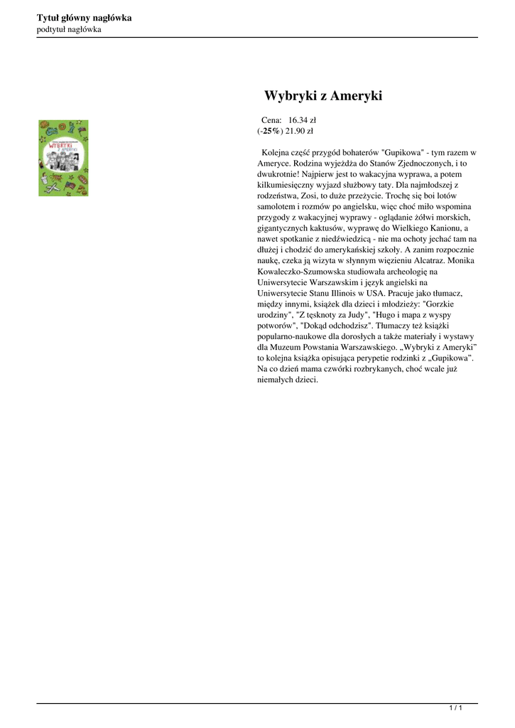 Tytuł główny nagłówka podtytuł nagłówka Wybryki z Ameryki Cena: 16.34 zł (-25%) 21.90 zł Kolejna część przygód bohaterów "Gupikowa" - tym razem w Ameryce. Rodzina wyjeżdża do Stanów Zjednoczonych, i to dwukrotnie! Najpierw jest to wakacyjna wyprawa, a potem kilkumiesięczny wyjazd służbowy taty. Dla najmłodszej z rodzeństwa, Zosi, to duże przeżycie. Trochę się boi lotów samolotem i rozmów po angielsku, więc choć miło wspomina przygody z wakacyjnej wyprawy - oglądanie żółwi morskich, gigantycznych kaktusów, wyprawę do Wielkiego Kanionu, a nawet spotkanie z niedźwiedzicą - nie ma ochoty jechać tam na dłużej i chodzić do amerykańskiej szkoły. A zanim rozpocznie naukę, czeka ją wizyta w słynnym więzieniu Alcatraz. Monika Kowaleczko-Szumowska studiowała archeologię na Uniwersytecie Warszawskim i język angielski na Uniwersytecie Stanu Illinois w USA. Pracuje jako tłumacz, między innymi, książek dla dzieci i młodzieży: "Gorzkie urodziny", "Z tęsknoty za Judy", "Hugo i mapa z wyspy potworów", "Dokąd odchodzisz". Tłumaczy też książki popularno-naukowe dla dorosłych a także materiały i wystawy dla Muzeum Powstania Warszawskiego. „Wybryki z Ameryki” to kolejna książka opisująca perypetie rodzinki z „Gupikowa”. Na co dzień mama czwórki rozbrykanych, choć wcale już niemałych dzieci. 1/1 Powered by TCPDF (www.tcpdf.org)
