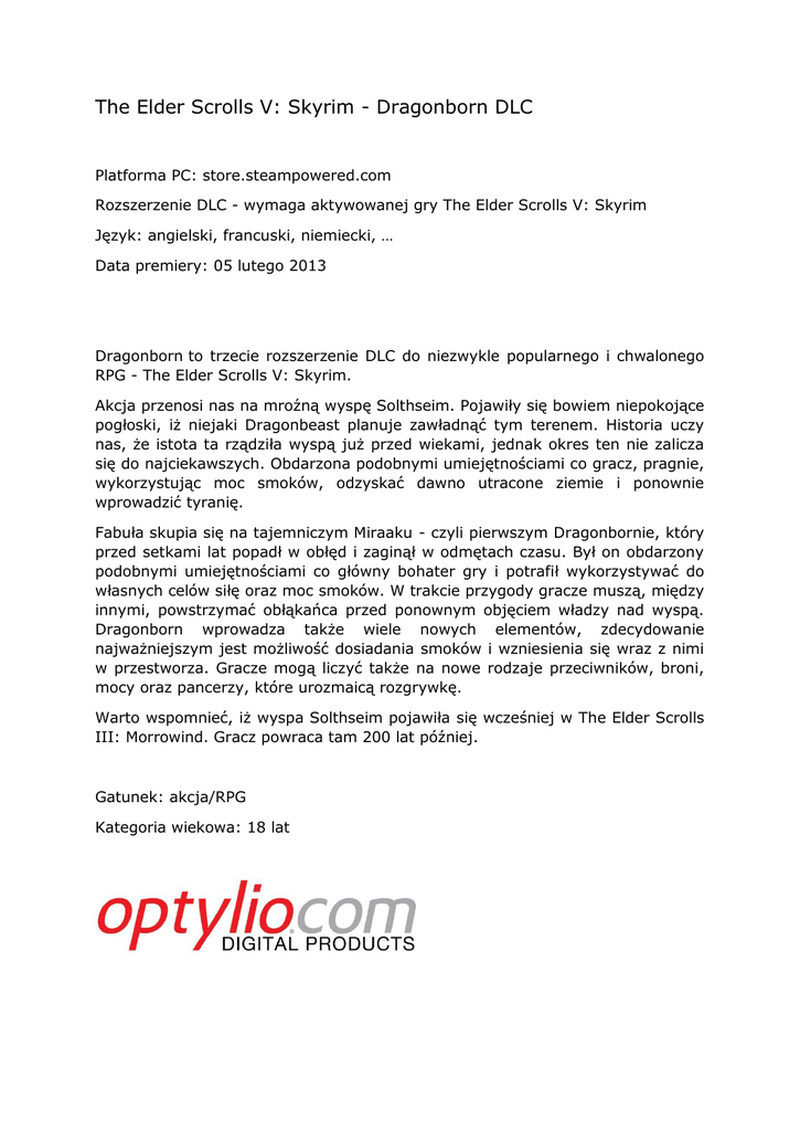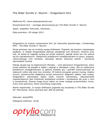 The Elder Scrolls V: Skyrim - Dragonborn DLC Platforma PC: store.steampowered.com Rozszerzenie DLC - wymaga aktywowanej gry The Elder Scrolls V: Skyrim Język: angielski, francuski, niemiecki, … Data premiery: 05 lutego 2013 Dragonborn to trzecie rozszerzenie DLC do niezwykle popularnego i chwalonego RPG - The Elder Scrolls V: Skyrim. Akcja przenosi nas na mroźną wyspę Solthseim. Pojawiły się bowiem niepokojące pogłoski, iż niejaki Dragonbeast planuje zawładnąć tym terenem. Historia uczy nas, że istota ta rządziła wyspą już przed wiekami, jednak okres ten nie zalicza się do najciekawszych. Obdarzona podobnymi umiejętnościami co gracz, pragnie, wykorzystując moc smoków, odzyskać dawno utracone ziemie i ponownie wprowadzić tyranię. Fabuła skupia się na tajemniczym Miraaku - czyli pierwszym Dragonbornie, który przed setkami lat popadł w obłęd i zaginął w odmętach czasu. Był on obdarzony podobnymi umiejętnościami co główny bohater gry i potrafił wykorzystywać do własnych celów siłę oraz moc smoków. W trakcie przygody gracze muszą, między innymi, powstrzymać obłąkańca przed ponownym objęciem władzy nad wyspą. Dragonborn wprowadza także wiele nowych elementów, zdecydowanie najważniejszym jest możliwość dosiadania smoków i wzniesienia się wraz z nimi w przestworza. Gracze mogą liczyć także na nowe rodzaje przeciwników, broni, mocy oraz pancerzy, które urozmaicą rozgrywkę. Warto wspomnieć, iż wyspa Solthseim pojawiła się wcześniej w The Elder Scrolls III: Morrowind. Gracz powraca tam 200 lat później. Gatunek: akcja/RPG Kategoria wiekowa: 18 lat