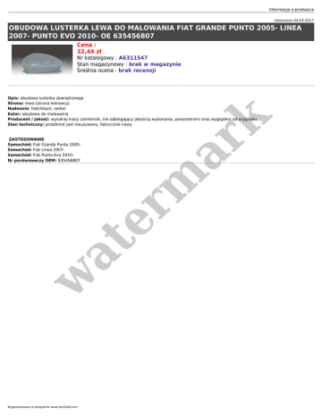 Informacje o produkcie Utworzono 04-03-2017 OBUDOWA LUSTERKA LEWA DO MALOWANIA FIAT GRANDE PUNTO 2005- LINEA 2007- PUNTO EVO 2010- OE 635456807 Cena : 32,44 zł Nr katalogowy : A6311547 Stan magazynowy : brak w magazynie Średnia ocena : brak recenzji w at ZASTOSOWANIE Samochód: Fiat Grande Punto 2005Samochód: Fiat Linea 2007Samochód: Fiat Punto Evo 2010Nr porównawczy OEM: 635456807 er m ar k Opis: obudowa lusterka zewnętrznego Strona: lewa (strona kierowcy) Nadwozie: hatchback, sedan Kolor: obudowa do malowania Producent / jakość: wysokiej klasy zamiennik, nie odbiegający jakością wykonania, parametrami oraz wyglądem od oryginału Stan techniczny: przedmiot jest nieużywany, fabrycznie nowy Wygenerowano w programie www.oscGold.com