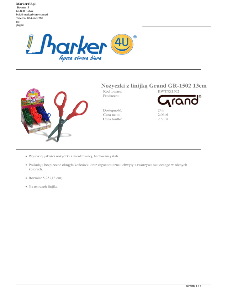 Marker4U.pl Boczna 5 62-800 Kalisz [email protected] Telefon: 884-760-760 gg: skype: Nożyczki z linijką Grand GR-1502 13cm Kod towaru: Producent: KWTNZ1502 Dostępność: Cena netto: Cena brutto: 24h 2.06 zł 2.53 zł Wysokiej jakości nożyczki z nierdzewnej, hartowanej stali. Posiadają bezpieczne okrągłe końcówki oraz ergonomiczne uchwyty z tworzywa sztucznego w różnych kolorach. Rozmiar 5,25 (13 cm). Na ostrzach linijka. strona 1 / 1 Powered by TCPDF (www.tcpdf.org)