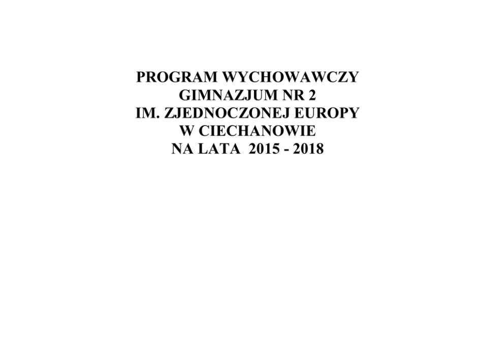 PROGRAM WYCHOWAWCZY GIMNAZJUM NR 2 IM. ZJEDNOCZONEJ EUROPY W CIECHANOWIE NA LATA 2015 - 2018 1 SPIS TREŚCI: 1. WSTĘP 2. PODSTAWA PRAWNA PROGRAMU WYCHOWAWCZEGO 3. MODEL ABSOLWENTA GIMNAZJUM NR 2 IM. ZJEDNOCZONEJ EUROPY 4. FORMY REALIZACJI WIZJI 5. GŁÓWNE CELE I ZADANIA PROGRAMU 6. UWAGI O REALIZACJI PROGRAMU 7. DOSKONALENIE UMIEJĘTNOŚCI WYCHOWAWCZYCH 8. EWALUACJA 2 WSTĘP Rodzice posiadają pierwotne i największe prawa wychowawcze w stosunku do swoich dzieci. Szkoła wspiera rodzinę w dziedzinie wychowania. Nauczyciele wspomagają rozwój osobowy ucznia we wszystkich wymiarach: intelektualnym, psychicznym, społecznym, zdrowotnym, estetycznym, moralnym, duchowym. Uczniowie mają możliwości dociekania do prawdy, szkoła ułatwi im osiągnięcie świadomości życiowej użyteczności poszczególnych zajęć. W szkole kładzie się nacisk na budzenie wrażliwości moralnej, na wspomaganie uczniów w ich dążeniu do samodzielności osądów, rozwijanie wrażliwości na dobro. Szkoła dąży do kształtowania w uczniach szacunku dla dobra wspólnego, rodziny, społeczności lokalnej, państwowej, a także do rozwijania patriotyzmu jako wartości o podstawowym znaczeniu. Młodzież otrzymuje w szkole pomoc w rozpoznawaniu wartości moralnych, w dokonywaniu wyborów i hierarchizacji tych wartości. Szkoła pomaga w poszukiwaniu odpowiedzi o sens życia, o przyszłość, wskazując na rzetelną pracę i uczciwość jako wartości prowadzące do realizacji przyjętych celów. Nauczyciele i pracownicy szkoły oraz uczniowie tworzą w sobie postawę dialogu, a w szkole powstaje klimat dialogu. Kryteria i sposób oceniania zachowania uczniów zawarty jest w Statucie Szkoły. Niniejszy program ujęty jest w formie rejestru różnych działań wychowawczych, które wynikają z treści nauczania i są związane z problemami środowisk, z których wywodzą się uczniowie naszego gimnazjum. Szczegółowe cele pracy wychowawczej tego programu zostały ujęte w hasła. 3 Z treścią Szkolnego Programu Wychowawczego zapoznają rodziców wychowawcy poszczególnych klas. W każdym roku szkolnym wybrany będzie temat przewodni i zostanie stworzony plan pracy na dany rok szkolny. Programy roczne stanowić będą załączniki do niniejszego dokumentu. 2.Program opracowano w oparciu o: 1. Powszechna Deklaracja Praw Człowieka 2. Konstytucję RP z dn. 17.10.1997 3. Ustawę o systemie oświaty z dn. 7.09.1991 4. Kartę Nauczyciela ze zmianami z dn. 26.01.1982 5. Konwencję o prawach dziecka 6. Statut Gimnazjum nr 2 w Ciechanowie 7. Obserwacje, sondaż, konsultacje z rodzicami. 3. MODEL ABSOLWENTA GIMNAZJUM NR 2 IM. ZJEDNOCZONEJ EUROPY WYNIKAJĄCY Z PODSTAWY PROGRAMOWEJ ORAZ REALIZACJI ZADAŃ DYDAKTYCZNOWYCHOWAWCZYCH SZKOŁY. UCZEŃ KOŃCZĄCY GIMNAZJUM; Zna kulturę, obyczaje i historię własnej miejscowości, regionu i kraju, Ma wiadomości o otaczającym świecie i zjawiskach w nim zachodzących, 4 Posiada wiedzę o zagrożeniach wynikających ze współczesnej cywilizacji, Umiejętnie korzysta ze środków przekazu, broni się przed destrukcyjnymi oddziaływaniami, Potrafi korzystać z różnych źródeł informacji, Umie stosować poznane wiadomości w życiu, Dzieli się swoją wiedzą i potrafi współpracować w zespole, Posiada umiejętności komunikowania i zachowania w różnych sytuacjach, Umiejętnie rozwiązuje konflikty, Aktywnie uczestniczy w życiu społeczno-kulturalnym, Samodzielnie ocenia zachowania swoje oraz cudze, a także przewiduje ich konsekwencje, Ma poczucie własnej wartości, Jest kulturalny, wrażliwy i tolerancyjny, Jest uczciwy w stosunku do siebie i innych, Umiejętnie pracuje nad własnym rozwojem, Wyraża własne zdanie i słucha zdania innych. 5 4. Formy realizacji wizji poprzez udział w dobrze zorganizowanych i ciekawie prowadzonych zajęciach lekcyjnych oraz zajęciach kół przedmiotowych i zainteresowań, uczeń będzie rozwijać wszelkie zainteresowania: przedmiotowe, badawcze, sportowe, turystyczne, informatyczne, językowe, dziennikarskie, teatralno-recytatorskie, muzyczno-wokalne, taneczne, plastyczne, ekologiczne, poprzez pracę w Samorządzie Uczniowskim i udział w nowocześnie prowadzonych zajęciach WOS-u, będzie rozwijać działalność społeczną, samorządową, zainteresowania administracyjno-prawne a także będzie miał możliwość współdecydowania o pracy szkoły, poprzez uczestnictwo w wycieczkach krajoznawczo-turystycznych, dobrze pozna swój region, jego historię, tradycje, kulturę i język; pozna najciekawsze miejsca swojego kraju, nauczy się wędrować, obcować z przyrodą, zdobędzie odznaki turystyczne, poprzez organizację i udział w imprezach, uroczystościach szkolnych, konkursach i zawodach nauczy się wytrwałości, dokładności, obowiązkowości, odpowiedzialności, inicjatywy, uwierzy w siebie i pozna swoją wartość, uczestnicząc w warsztatach nt.: przeciwdziałania przemocy, integracyjnych, antystresowych, komunikowania, autokreacji, asertywności oraz wyboru zawodu i drogi życiowej, pozna sposoby radzenia sobie z trudnościami, dzięki ciekawym metodom pracy nauczycieli z młodzieżą, takimi jak: - gry, zabawy, konkursy, quizy, - scenki rodzajowe, - tworzenie własnych scenariuszy, 6 - prezentacje, - dyskusje, „burze mózgów”, - twórczość artystyczna i techniczna, - projekty, - warsztaty i treningi, - symulacje sytuacji problemowych, - wycieczki tematyczne, krajoznawczo-turystyczne i zielone szkoły, a także stosowaniu zróżnicowanych form pracy takich jak: - praca z całą klasą, - praca w grupach problemowych, - praca w zespołach międzyklasowych, - praca indywidualna. Lp. Cele 1 Określenie potrzeb ucznia i form pomocy. 2 Uświadomienie sobie swoich mocnych i słabych stron, umiejętność współistnienia w grupie. Zadania do realizacji Ewaluacja Rozpoznanie środowiska rodzinnego uczniów i ich potrzeb. Współpraca z pedagogiem i psychologiem szkolnym. Indywidualne rozmowy z uczniami i rodzicami. Dok