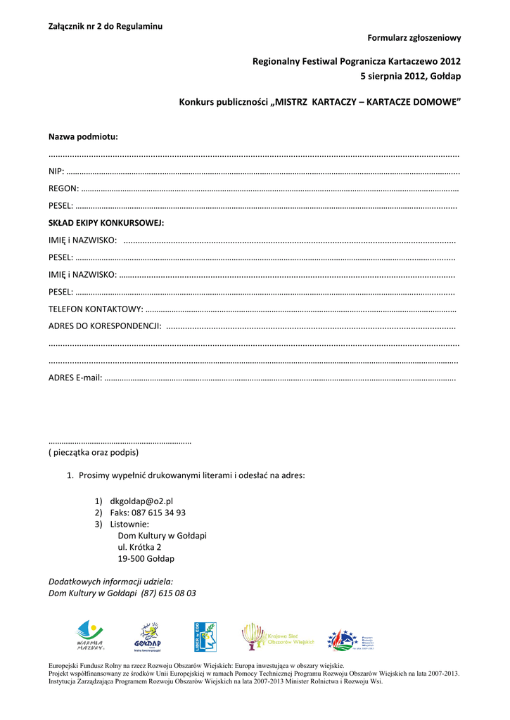 Załącznik nr 2 do Regulaminu Formularz zgłoszeniowy Regionalny Festiwal Pogranicza Kartaczewo 2012 5 sierpnia 2012, Gołdap Konkurs publiczności „MISTRZ KARTACZY – KARTACZE DOMOWE” Nazwa podmiotu: ............................................................................................................................................................................. NIP: ……………………………………..……………………………………………………………………………………………………………….…….... REGON: ………………………………….…………………………………………………………………………………………………………………..… PESEL: …………………………………………………………………………………………………………………………………………..……........... SKŁAD EKIPY KONKURSOWEJ: IMIĘ i NAZWISKO: ............................................................................................................................................ PESEL: …………………………………………………………………………………………..……………………………………………..……........... IMIĘ i NAZWISKO: ……........................................................................................................................................ PESEL: …………………………………………………………………………………………………………………………………………..…….......... TELEFON KONTAKTOWY: …………………………….…………………………………………………………...……………………………….… ADRES DO KORESPONDENCJI: .......................................................................................................................... ............................................................................................................................................................................. .............................................................………………………………………………………………………………………………………….. ADRES E-mail: …………………………………………………………………………………………………………..…………………………………. ………………………………………………………… ( pieczątka oraz podpis) 1. Prosimy wypełnid drukowanymi literami i odesład na adres: 1) [email protected] 2) Faks: 087 615 34 93 3) Listownie: Dom Kultury w Gołdapi ul. Krótka 2 19-500 Gołdap Dodatkowych informacji udziela: Dom Kultury w Gołdapi (87) 615 08 03 Europejski Fundusz Rolny na rzecz Rozwoju Obszarów Wiejskich: Europa inwestująca w obszary wiejskie. Projekt współfinansowany ze środków Unii Europejskiej w ramach Pomocy Technicznej Programu Rozwoju Obszarów Wiejskich na lata 2007-2013. Instytucja Zarządzająca Programem Rozwoju Obszarów Wiejskich na lata 2007-2013 Minister Rolnictwa i Rozwoju Wsi. Konkurs publiczności „MISTRZ KARTACZY – KARTACZE DOMOWE” ………………………………………………………………………………………………………………………………………………………….…………… (NAZWA POTRAWY) PRZEPIS NA POTRAWĘ: ………………………………………………………………………....………………………………………………………………………………..………… ……………………………………………………………………………………………………………………………………………………………………… ……………………………….………………………………………………………………………….………………………………………………………… …………………..………………………………………………………………………………………………………………………………………………… ………………………………………………………………………………………………………………………………..…………………………………… ……………………………………………………………………………………………………………….….………………………………………………… …………………………………………………………………………………………………..………………………………………………………………… ……………………………………………………………………………………………………………………………………………………………………… ……………………………………………………………………………………………………………………………………………………………………… ……………………………………………………………………………………………………………………………………………………………………… ……………………………………………………………………………………………………………………………………………………………………… ……………………………………………………………………………………………………………………………………………………………………… Wyrażam zgodę na: 1) przetwarzanie moich danych osobowych udostępnionych przeze mnie na potrzeby konkursu publiczności „Mistrz kartaczy – kartacze domowe” na cele związane z realizacją ww. konkursu oraz na potrzeby ewentualnych wypła