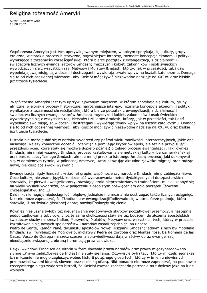 Strona misyjno- ewangelizacyjna, o. Z. Grad, SVD - misjonarz z Madagaskaru Religijna tożsamość Ameryki Autor: Zdzisław Grad 10.08.2007. Współczesna Ameryka jest tym uprzywilejowanym miejscem, w którym spotykają się kultury, grupy etniczne, wielorakie procesy historyczne, najróżniejsze interesy, rozmaite koncepcje ekonomii i polityki, wynikające z tożsamości chrześcijańskiej, która bierze początek z ewangelizacji, z działalności i świadectwa licznych ewangelizatorów — mężczyzn i kobiet, zakonników i osób świeckich wywodzących się z wszystkich ras, Metysów i Mulatów — którzy, jak w przeszłości, tak i dziś wypełniają swą misję, są widoczni i dostrzegani i wywierają trwały wpływ na kształt katolicyzmu. Domaga się to od nich codziennej wierności, aby Kościół mógł żywić niezawodne nadzieje na XXI w. oraz bliskie już trzecie tysiąclecie. Współczesna Ameryka jest tym uprzywilejowanym miejscem, w którym spotykają się kultury, grupy etniczne, wielorakie procesy historyczne, najróżniejsze interesy, rozmaite koncepcje ekonomii i polityki, wynikające z tożsamości chrześcijańskiej, która bierze początek z ewangelizacji, z działalności i świadectwa licznych ewangelizatorów — mężczyzn i kobiet, zakonników i osób świeckich wywodzących się z wszystkich ras, Metysów i Mulatów — którzy, jak w przeszłości, tak i dziś wypełniają swą misję, są widoczni i dostrzegani i wywierają trwały wpływ na kształt katolicyzmu. Domaga się to od nich codziennej wierności, aby Kościół mógł żywić niezawodne nadzieje na XXI w. oraz bliskie już trzecie tysiąclecie. Historia nie może gubić się w natłoku wydarzeń czy pośród wielu możliwości interpretacyjnych, jakie one nasuwają. Należy koniecznie docenić i ocenić (nie pomijając kryteriów epoki, ale też nie przypisując przeszłości ocen, które stały się możliwe dopiero później) przebieg procesu ewangelizacji, jak również — nie mniej ważnego — procesu kształtowania się metyskiej kultury iberoamerykańskiej oraz bardzo specyficznego — ale nie mniej przez to istotnego — procesu, jaki dokonywał się, w odmiennym rytmie, w północnej Ameryce, uwarunkowując aktualne zjawisko migracji oraz rodząc nowe, nie cierpiące zwłoki wyzwania. Ewangelizacja nigdy — w żadnej grupie, wspólnocie czy narodzie — nie przebiegała łatwo. Obce kultury, nie znane języki, konieczność wypracowania metod dydaktycznych i duszpasterskich sprawiały, że pierwsi ewangelizatorzy, stawiając czoło nieprzewidzianym trudnościom, musieli zdobyć się na wielki wysiłek wyobraźni, co w połączeniu z osobistym poświęceniem dało początek «nowemu chrześcijaństwu Indii». Dziś nikt nie neguje niedociągnięć i błędów, jednakże nie można nie dostrzegać także licznych osiągnięć. Nikt nie może zaprzeczyć, że «spotkanie w ewangelizacji» odbywało się w atmosferze podboju, która sprawiła, iż na światło głoszonej dobrej nowiny» nałożyły się cienie. Również niesłuszne byłoby też nieuznawanie negatywnych skutków początkowej przemocy, a następnie podporządkowania tubylców, choć te same okoliczności stały się też bodźcem do złożenia apostolskich świadectw służby na rzecz Indian, Murzynów, Mulatów, Metysów oraz wszystkich tych, którzy w procesie kształtowania się nowych społeczeństw i narodów zostali zepchnięci na ubocze. Pedro de Gante, Ramón Pané, dwunastu apostołów Nowej Hiszpanii — jednym z nich był Motolinía — św. Turybiusz de Mogrovejo, inicjatywy Pedra de Córdoba oraz Montesinosa, Bartłomieja de las Casas, Vasco de Quiroga na rzecz szerzenia sprawiedliwości dają właściwy obraz ewangelizacji nieodłącznie związanej z obroną i promocją praw człowieka. Dzięki wkładowi Francisco de Vitoria w formułowanie prawa narodów oraz prawa międzynarodowego słynne «Prawa Indii» (Leyes de Indias) nie stały się farsą. Oczywiście byli i tacy, którzy milczeli; jednakże ich milczenie nie mogło zagłuszyć wobec historii potężnego głosu tych, którzy w imieniu niewinnych przemawiali swoimi ideami, słowem oraz osobistą ofiarą. Nikt ponadto nie może zaprzeczyć, na podstawie rzeczywistego biegu wydarzeń historii, że Kościół zawsze zachęcał do patrzenia na tubylców jako na ludzi wolnych. http://www.grad.svd-mad.org Kreator PDF Utworzono 4 March, 2017, 04:00 Strona misyjno- ewangelizacyjna, o. Z. Grad, SVD - misjonarz z Madagaskaru Wszystkie te postaci to nie tylko kamienie milowe w dziejach ludzkości i ewangelizacji, ale również twórcy metod inkulturacji Ewangelii w obyczajowości oraz owocnego dialogu z istniejącą wcześniej sztuką, zwyczajami i kulturą, które dziś przyczyniły się do powstania ważnych i cennych form pobożności ludowej. Warto zwrócić uwagę na sukcesy odniesione na polu formacji miejscowych katechetów; w obecnych czasach wskazuje to na potrzebę przygotowania świeckich, jak również opracowania metod pracy wspólnotowej, które nie tracą ważności i mocy; nie należy też zapominać o planowaniu form dydaktycznych (katechizmów), które dały podstawę opcjom pedagogicznym o niezaprzeczalnej wartości. Tworzenie od 1511 r. rozmaitych diecezji — poczynając od Santo Domingo i Concepción de la Vega — przyczyniło się do powstania niewielkich gmin, w których umacniała się obecność Kościoła i rodziła «wspólnota», mająca ożywić ewangelizację oraz sprzyjać powstawaniu podmiotów kulturowych odmiennych od europejskich, posiadających własną tożsamość, dzięki którym stał się możliwy — zarówno w Ameryce Łacińskiej, jak i na Antylach czy na innych wyspach, a także w Ameryce Północnej — dialog między kulturami, oparty na wspólnej wierze. Konieczne jest — gdy mowa o Ameryce Łacińskiej — uświadomienie sobie specyfiki procesu ewangelizacji w Brazylii, który nasuwa pytania odmienne od tych, ja