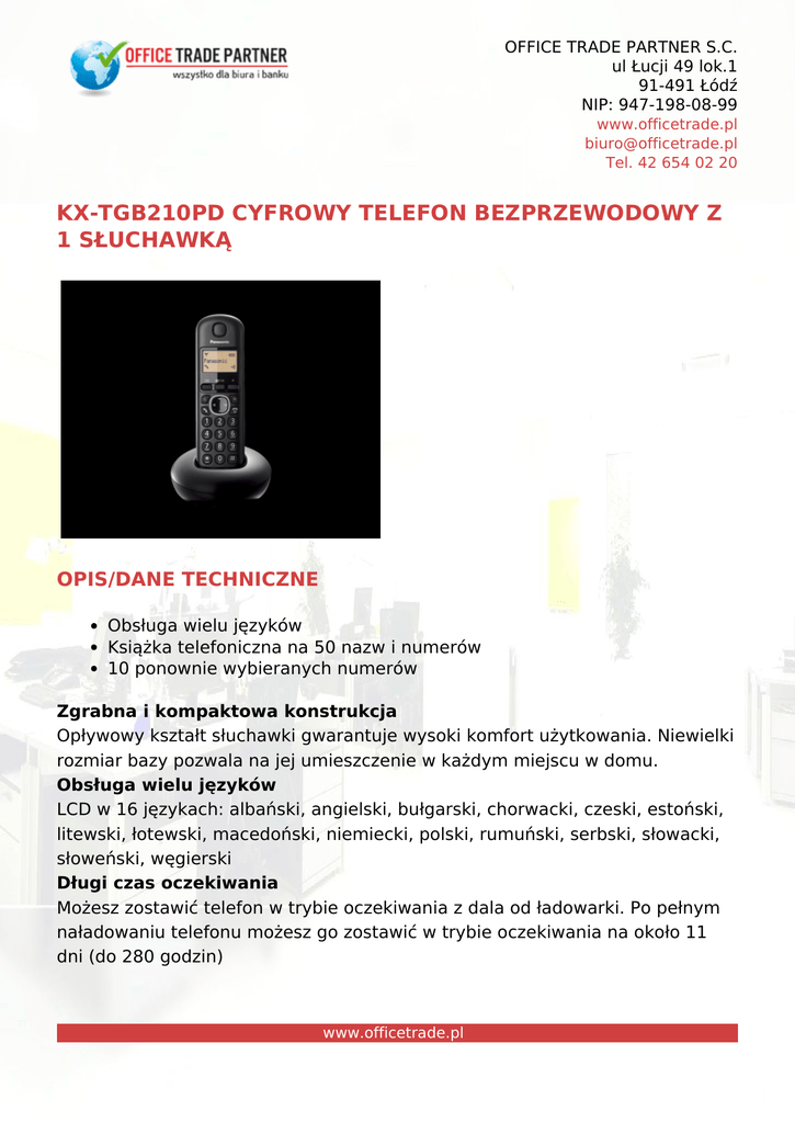 OFFICE TRADE PARTNER S.C. ul Łucji 49 lok.1 91-491 Łódź NIP: 947-198-08-99 www.officetrade.pl [email protected] Tel. 42 654 02 20 KX-TGB210PD CYFROWY TELEFON BEZPRZEWODOWY Z 1 SŁUCHAWKĄ OPIS/DANE TECHNICZNE Obsługa wielu języków Książka telefoniczna na 50 nazw i numerów 10 ponownie wybieranych numerów Zgrabna i kompaktowa konstrukcja Opływowy kształt słuchawki gwarantuje wysoki komfort użytkowania. Niewielki rozmiar bazy pozwala na jej umieszczenie w każdym miejscu w domu. Obsługa wielu języków LCD w 16 językach: albański, angielski, bułgarski, chorwacki, czeski, estoński, litewski, łotewski, macedoński, niemiecki, polski, rumuński, serbski, słowacki, słoweński, węgierski Długi czas oczekiwania Możesz zostawić telefon w trybie oczekiwania z dala od ładowarki. Po pełnym naładowaniu telefonu możesz go zostawić w trybie oczekiwania na około 11 dni (do 280 godzin) www.officetrade.pl Powered by TCPDF (www.tcpdf.org)