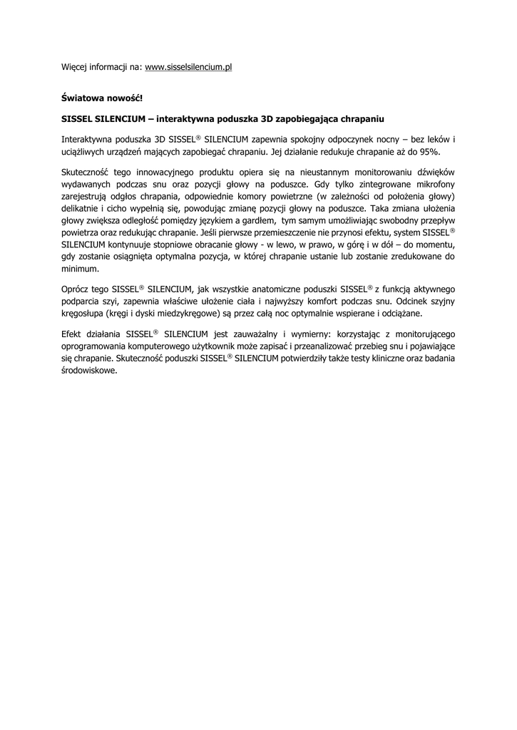 Więcej informacji na: www.sisselsilencium.pl Światowa nowość! SISSEL SILENCIUM – interaktywna poduszka 3D zapobiegająca chrapaniu Interaktywna poduszka 3D SISSEL® SILENCIUM zapewnia spokojny odpoczynek nocny – bez leków i uciążliwych urządzeń mających zapobiegać chrapaniu. Jej działanie redukuje chrapanie aż do 95%. Skuteczność tego innowacyjnego produktu opiera się na nieustannym monitorowaniu dźwięków wydawanych podczas snu oraz pozycji głowy na poduszce. Gdy tylko zintegrowane mikrofony zarejestrują odgłos chrapania, odpowiednie komory powietrzne (w zależności od położenia głowy) delikatnie i cicho wypełnią się, powodując zmianę pozycji głowy na poduszce. Taka zmiana ułożenia głowy zwiększa odległość pomiędzy językiem a gardłem, tym samym umożliwiając swobodny przepływ powietrza oraz redukując chrapanie. Jeśli pierwsze przemieszczenie nie przynosi efektu, system SISSEL ® SILENCIUM kontynuuje stopniowe obracanie głowy - w lewo, w prawo, w górę i w dół – do momentu, gdy zostanie osiągnięta optymalna pozycja, w której chrapanie ustanie lub zostanie zredukowane do minimum. Oprócz tego SISSEL® SILENCIUM, jak wszystkie anatomiczne poduszki SISSEL® z funkcją aktywnego podparcia szyi, zapewnia właściwe ułożenie ciała i najwyższy komfort podczas snu. Odcinek szyjny kręgosłupa (kręgi i dyski miedzykręgowe) są przez całą noc optymalnie wspierane i odciążane. Efekt działania SISSEL® SILENCIUM jest zauważalny i wymierny: korzystając z monitorującego oprogramowania komputerowego użytkownik może zapisać i przeanalizować przebieg snu i pojawiające się chrapanie. Skuteczność poduszki SISSEL® SILENCIUM potwierdziły także testy kliniczne oraz badania środowiskowe.