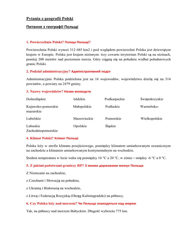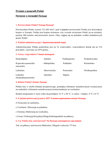 Pytania z geografii Polski Питання з географії Польщі 1. Powierzchnia Polski? Площа Польщі? Powierzchnia Polski wynosi 312 685 km2 i pod względem powierzchni Polska jest dziewiątym krajem w Europie. Polska jest krajem nizinnym: trzy czwarte terytorium Polski są na nizinach, poniżej 200 metrów nad poziomem morza. Góry ciągną się na południu wzdłuż południowych granic Polski. 2. Podział administracyjny? Адміністративний поділ Administracyjnie Polska podzielona jest na 16 wojewodów, województwa dzielą się na 314 powiatów, a powiaty na 2479 gminy. 3. Nazwy województw? Назви воєводств Dolnośląskie Łódzkie Podkarpackie Świętokrzyskie Kujawsko-pomorskie mazurskie Małopolskie Podlaskie Warmińsko- Lubelskie Mazowieckie Pomorskie Wielkopolskie Lubuskie Zachodniopomorskie Opolskie Śląskie 4. Klimat Polski? Клімат Польщі Polska leży w strefie klimatu przejściowego, pomiędzy klimatem umiarkowanym oceanicznym na zachodzie a klimatem umiarkowanym kontynentalnym na wschodzie. Średnia temperatura w lecie waha się pomiędzy 16 °C a 20 °C, w zimie – między -6 °C a 0 °C. 5. Z jakimi państwami graniczy RP? З якими державами межує Польща Z Niemcami na zachodzie, z Czechami i Słowacją na południu, z Ukrainą i Białorusią na wschodzie, z Litwą i Federacją Rosyjską (Okręg Kaliningradzki) na północy. 6. Czy Polska leży nad morzem? Чи Польща знаходиться над морем Tak, na północy nad morzem Bałtyckim. Długość wybrzeża 775 km. Główne handlowe polskie porty: Gdańsk, Gdynia, Szczecin nad Zalewem Szczecińskim i Świnoujście. 7. Polskie miasta położone nad Bałtykiem? Польські міста розташовані над Балтійським морем Trójmiasto - Gdańsk, Gdynia, Sopot. W środkowej części miasto Kołobrzeg. W zachodniej Świnoujście. 8. Parki Narodowe w Polsce? Народні парки Польщі 23 razem: najbardziej znane: Białowieski Park Narodowy: Białowieski Park Narodowy jest najstarszym parkiem narodowym w Polsce. Został utworzony w 1932 r. W 1977r. UNESCO włączyło Białowieski Park Narodowy w poczet światowych rezerwatów biosfery, a dwa lata później uznano go za pierwszy i jedyny w Polsce przyrodniczy Obiekt Dziedzictwa Światowego. Tatrzański Park Narodowy: Tatrzański Park Narodowy został powołany w 1954 roku, w celu ochrony zasobów przyrodniczych Tatr Polskich. Park obejmuje prawie cale Tatry polskie i sąsiaduje z Parkiem Narodowym na słowackiej stronie. Pieniński Park Narodowy: Założony w 1932 roku, jeszcze przed II wojną światową jest bardzo lubianym i często odwiedzanym Parkiem Narodowym. Bieszczadzki Park Narodowy: Bieszczadzki Park Narodowy, utworzony w 1973r., jest ostoją dzikiej przyrody jedynej polskiej części Karpat Wschodnich. 9. Najważniejsze rzeki w Polsce? Головні річки Польщі? Od wschodu na zachód: Bug - rzeka na granicy wschodniej (na terenie Polski 587 km); Narew - wpadająca do Bugu; Wisła - najważniejsza, najdłuższa polska rzeka (1047 km); Warta (808 km); Odra (na terenie Polski 742 km). Na swoim odcinku centralnym rzeka graniczna z Niemcami. Odra wypływa z Czech. 10. Najważniejsze jeziora w Polsce? Головні озера Польщі Śniardwy (na Pojezierzu Mazurskim) największe w Polsce jezioro (114 km2); Mamry (104 km2); Hańcza (najgłębsze, 108 m głębokości), w samym północno-wschodnim skrawku Polski; Morskie Oko w Tatrach, przykład jeziora wysokogórskiego. 11. Przez jakie miasta przepływa rzeka Wisła? Через які міста протікає річка Вісла? Wisła wypływa z Beskidów Sląskich. Przepływa przez Kraków, Sandomierz, Warszawa, Toruń. 12. Góry w Polsce? Гори в Польщі? Karpaty: to pasmo gór w środkowej Europie. Karpaty ciągną się od polskiego Śląska poprzez Ukrainę aż do Rumunii. Polska część Karpat to Beskidy: Śląski, Beskidy Zachodnie, Beskid Niski, Beskidy Wschodnie. W pasmie Karpat są Tatry, Pieniny i Bieszczady. Bieszczady nalezą do Karpat Wschodnich i odróżniają się Beskidów Zachodnich. Tatry – najwyższe góry w pasmie Karpat. Na granicy ze Słowacja, najwyższy polski szczyt Tatr Rysy 2499 metrów nad poziomem morza. Jedyne w Polsce góry o charakterze alpejskim. Niestety w Polsce pasmo Tatr ciągnie się zaledwie około 30 kilometrów. Sudety: na Dolnym Śląsku, na granicy z Czechami. Góry Stołowe, góra Śnieżka. Góry Świętokrzyskie: jedno z najstarszych pasm górskich. Najwyższy szczyt Łysica 612 metrów nad poziomem morza. 13. Najważniejsze miasta Polski? Найголовніші міста Польщі? Warszawa - (stolica) 1,7 milionów mieszkańców. Największe lotnisko w Polsce imienia Fryderyka Chopina. Największy Uniwersytet, Politechnika. Siedziba Sejmu, Rządu RP, Prezydenta RP i Sadu Najwyższego. Stare Miasto zniszczone w czasie Powstania Warszawskiego zostało odbudowane wraz z Zamkiem Królewskim. Łódź - wielkie miasto przemysłowe, znane do niedawna z przemysłu włókienniczego. Kraków - była stolica Polski, Uniwersytet Jagielloński, miasto Papieża Jana Pawła II. Kraków, nie zniszczony w czasie II wojny, z historycznym Rynkiem, zamkiem na Wawelu, w samym centrum miasta, jest ulubionym celem wycieczek. Wrocław - wielkie miasto na Ziemiach Odzyskanych po II wojnie Światowej. Katowice - stolica polskiego Sląska. Przemysłowe centrum hutniczo – górnicze (kopalnie węgla kamiennego). Gdańsk – główne miasto na polskim wybrzeżu Bałtyku. Lotnisko imienia Lecha Wałęsy. Poznań - stolica Wielkopolski. Pod zaborami należał do Prus. 14. Najważniejsze budowle średniowieczne середньовічні споруди в містах Польщі w miastach Polski? Найважливіші Wawel (Zamek Królewski) w Krakowie, był siedzibą Królów przez wieki. Sukiennice na Ry