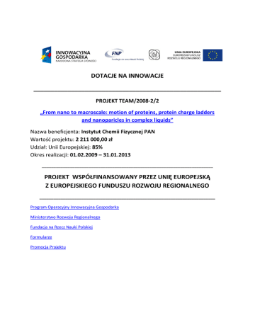 DOTACJE NA INNOWACJE _______________________________________________________ PROJEKT TEAM/2008-2/2 „From nano to macroscale: motion of proteins, protein charge ladders and nanoparicles in complex liquids” Nazwa beneficjenta: Instytut Chemii Fizycznej PAN Wartość projektu: 2 211 000,00 zł Udział: Unii Europejskiej: 85% Okres realizacji: 01.02.2009 – 31.01.2013 _________________________________________________________________________ PROJEKT WSPÓŁFINANSOWANY PRZEZ UNIĘ EUROPEJSKĄ Z EUROPEJSKIEGO FUNDUSZU ROZWOJU REGIONALNEGO ___________________________________________________________________________ Program Operacyjny Innowacyjna Gospodarka Ministerstwo Rozwoju Regionalnego Fundacja na Rzecz Nauki Polskiej Formularze Promocja Projektu
