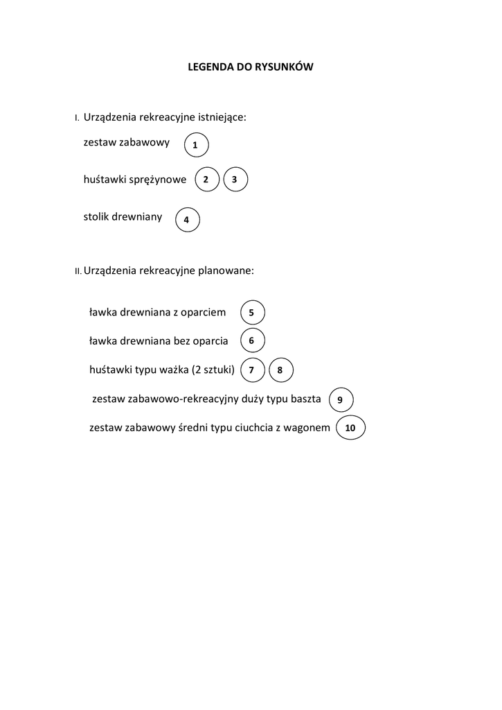 LEGENDA DO RYSUNKÓW I. Urządzenia rekreacyjne istniejące: zestaw zabawowy 1 huśtawki sprężynowe stolik drewniany II. Urządzenia 2 3 4 rekreacyjne planowane: ławka drewniana z oparciem 5 ławka drewniana bez oparcia 6 huśtawki typu ważka (2 sztuki) 7 8 zestaw zabawowo-rekreacyjny duży typu baszta zestaw zabawowy średni typu ciuchcia z wagonem 9 10 00 0