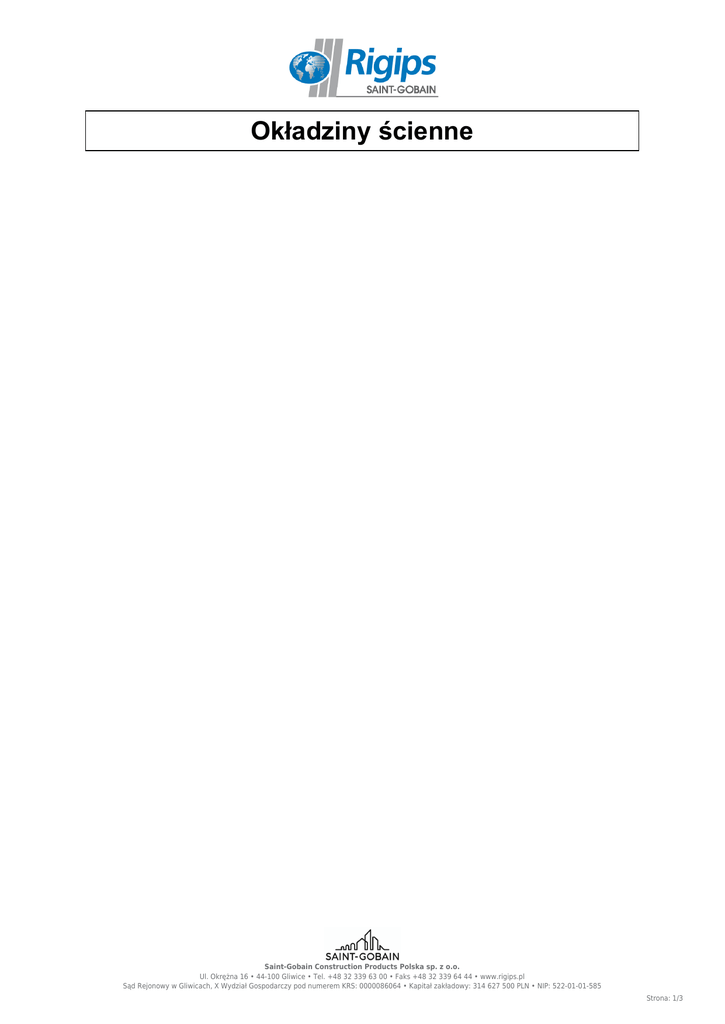 Okładziny ścienne Saint-Gobain Construction Products Polska sp. z o.o. Ul. Okrężna 16 • 44-100 Gliwice • Tel. +48 32 339 63 00 • Faks +48 32 339 64 44 • www.rigips.pl Sąd Rejonowy w Gliwicach, X Wydział Gospodarczy pod numerem KRS: 0000086064 • Kapitał zakładowy: 314 627 500 PLN • NIP: 522-01-01-585 Strona: 1/3 Okładziny ścienne z płyt gipsowo-kartonowych Płyty gipsowo-kartonowe są niezastąpionym materiałem przy pracach wykończeniowych w budownictwie. Przy ich zastosowaniu wykonuje się m. in. ściany działowe, okładziny ścienne, zabudowy poddasza, sufity podwieszane. Płyty g-k RIGIPS mogą posłużyć m. in. jako materiał do wykonania okładzin ściennych. Ich zalety to: • wyeliminowanie procesów "mokrych", co w praktyce pozwala na prowadzenie prac w dowolnym momencie realizacji inwestycji, • prostota i szybkość montażu wykończone pomieszczenia można niemal natychmiast użytkować, • niewielki ciężar zabudowy, • optymalna wilgotność powietrza w użytkowanym pomieszczeniu (gips jest tzw. naturalnym regulatorem wilgotności powietrza), • możliwość znacznego zwiększenia izolacyjności termicznej całej przegrody oraz prostego umieszczenia wszelkich instalacji wewnętrznych, • stosunkowo mała grubość zabudowy, • wysoki poziomem estetyki, • bezpieczeństwo użytkowania Okładziny ścienne – rodzaje: Okładziny ścienne wykonane w systemach suchej zabudowy wnętrz ze względu na zasadnicze różnice technologiczne możemy podzielić na trzy zasadnicze podgrupy: • okładziny ścienne z płyt gipsowo-kartonowych mocowane na klej gipsowy, nazywane suchym tynkiem, • okładziny ścienne z płyt gipsowo-kartonowych mocowane do ścian za pomocą konstrukcji nośnej w postaci profili metalowych, • okładziny ścienne wolnostojące mocowane do specjalnej konstrukcji zupełnie nie związanej z podłożem zasadniczym, tzw. przedścianki. Saint-Gobain Construction Products Polska sp. z o.o. Ul. Okrężna 16 • 44-100 Gliwice • Tel. +48 32 339 63 00 • Faks +48 32 339 64 44 • www.rigips.pl Sąd Rejonowy w Gliwicach, X Wydział Gospodarczy pod numerem KRS: 0000086064 • Kapitał zakładowy: 314 627 500 PLN • NIP: 522-01-01-585 Strona: 2/3 Rigips istnieje na polskim rynku od 1994 roku. Firma jest dostawcą najwyższej jakości systemów i rozwiązań do budowy komfortowych, przyjaznych i bezpiecznych wnętrz. Rigips oferuje klientom ściany działowe, poddasza, okładziny ścienne oraz sufity podwieszane. Rozwiązania Rigips zapewniają najwyższą jakość wykończenia powierzchni mieszkalnych i biurowych, wysoki komfort akustyczny, bezpieczeństwo przeciwpożarowe, bezpieczny dla zdrowia i ekologiczny materiał – płyty Rigips produkowane są z naturalnego kamienia. Rigips posiada nowoczesną fabrykę produkcji płyt gipsowo – kartonowych w Szarbkowie. Rigips, jako jedyna marka na rynku, oferuje płytę PRO z nadrukowaną miarką na krawędziach, która umożliwia szybki i precyzyjny montaż. Firma wprowadziła również na rynek innowacyjne profile ULTRASTIL®, które dzięki specjalnym ryflowaniom są o ponad 50% sztywniejsze i bardziej wytrzymałe, niż zwykłe standardowe profile. Kontakt dla mediów: Katarzyna Kołodziejska Starszy specjalista marketingu Biuro Rigips w Warszawie ul. Cybernetyki 9 02-677 Warszawa e-mail: [email protected] Tel. kom.: +48 668 311 526 Saint-Gobain Construction Products Polska sp. z o.o. Ul. Okrężna 16 • 44-100 Gliwice • Tel. +48 32 339 63 00 • Faks +48 32 339 64 44 • www.rigips.pl Sąd Rejonowy w Gliwicach, X Wydział Gospodarczy pod numerem KRS: 0000086064 • Kapitał zakładowy: 314 627 500 PLN • NIP: 522-01-01-585 Strona: 3/3