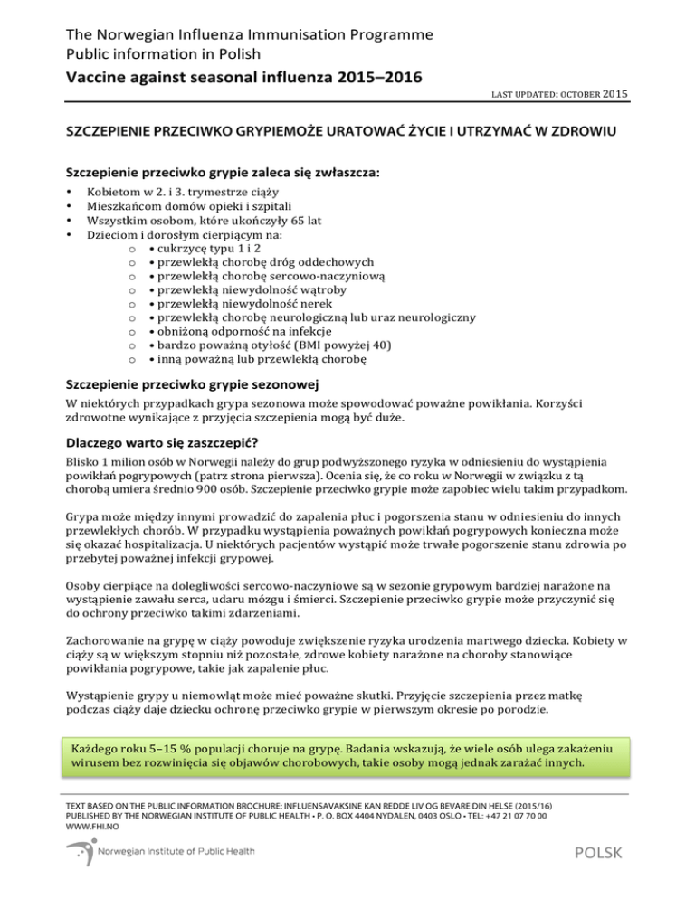 The Norwegian Influenza Immunisation Programme Public information in Polish Vaccine against seasonal influenza 2015–2016 LAST UPDATED: OCTOBER 2015 SZCZEPIENIE PRZECIWKO GRYPIEMOŻE URATOWAĆ ŻYCIE I UTRZYMAĆ W ZDROWIU Szczepienie przeciwko grypie zaleca się zwłaszcza: • • • • Kobietom w 2. i 3. trymestrze ciąży Mieszkańcom domów opieki i szpitali Wszystkim osobom, które ukończyły 65 lat Dzieciom i dorosłym cierpiącym na: o • cukrzycę typu 1 i 2 o • przewlekłą chorobę dróg oddechowych o • przewlekłą chorobę sercowo-‐naczyniową o • przewlekłą niewydolność wątroby o • przewlekłą niewydolność nerek o • przewlekłą chorobę neurologiczną lub uraz neurologiczny o • obniżoną odporność na infekcje o • bardzo poważną otyłość (BMI powyżej 40) o • inną poważną lub przewlekłą chorobę Szczepienie przeciwko grypie sezonowej W niektórych przypadkach grypa sezonowa może spowodować poważne powikłania. Korzyści zdrowotne wynikające z przyjęcia szczepienia mogą być duże. Dlaczego warto się zaszczepić? Blisko 1 milion osób w Norwegii należy do grup podwyższonego ryzyka w odniesieniu do wystąpienia powikłań pogrypowych (patrz strona pierwsza). Ocenia się, że co roku w Norwegii w związku z tą chorobą umiera średnio 900 osób. Szczepienie przeciwko grypie może zapobiec wielu takim przypadkom. Grypa może między innymi prowadzić do zapalenia płuc i pogorszenia stanu w odniesieniu do innych przewlekłych chorób. W przypadku wystąpienia poważnych powikłań pogrypowych konieczna może się okazać hospitalizacja. U niektórych pacjentów wystąpić może trwałe pogorszenie stanu zdrowia po przebytej poważnej infekcji grypowej. Osoby cierpiące na dolegliwości sercowo-‐naczyniowe są w sezonie grypowym bardziej narażone na wystąpienie zawału serca, udaru mózgu i śmierci. Szczepienie przeciwko grypie może przyczynić się do ochrony przeciwko takimi zdarzeniami. Zachorowanie na grypę w ciąży powoduje zwiększenie ryzyka urodzenia martwego dziecka. Kobiety w ciąży są w większym stopniu niż pozostałe, zdrowe kobiety narażone na choroby stanowiące powikłania pogrypowe, takie jak zapalenie płuc. Wystąpienie grypy u niemowląt może mieć poważne skutki. Przyjęcie szczepienia przez matkę podczas ciąży daje dziecku ochronę przeciwko grypie w pierwszym okresie po porodzie. Każdego roku 5–15 % populacji choruje na grypę. Badania wskazują, że wiele osób ulega zakażeniu wirusem bez rozwinięcia się objawów chorobowych, takie osoby mogą jednak zarażać innych. TEXT BASED ON THE PUBLIC INFORMATION BROCHURE: INFLUENSAVAKSINE KAN REDDE LIV OG BEVARE DIN HELSE (2015/16) PUBLISHED BY THE NORWEGIAN INSTITUTE OF PUBLIC HEALTH • P. O. BOX 4404 NYDALEN, 0403 OSLO • TEL: +47 21 07 70 00 WWW.FHI.NO POLSK The Norwegian Influenza Immunisation Programme 2 VACCIN AGAINST SEASONAL INFLUENZA • POLISH ________________________________________________________________________________________________________________________________________________ Przed czym chroni szczepienie? Podczas sezonu grypowego krążyć mogą 2-‐3 typy wirusa grypy. Szczepienie przeciwko grypie sezonowej chroni przeciwko 3 typom wirusa. Szczepienie przeciwko grypie nie chroni przeciwko innym wirusom i bakteriom, które mogą wywoływać objawy podobne do objawów grypy. Do najczęstszych objawów grypy zaliczyć można gorączkę, suchy kaszel, cieknący katar, osłabienie, bóle głowy i mięśni występujące przez 3-‐10 dni. Dlaczego każdego roku powinno się przyjmować szczepienie? Osoby z grup ryzyka powinny co roku przyjmować szczepienie przeciwko grypie sezonowej. Jest to konieczne, ponieważ wirus grypy ulega ciągłym zmianom, a szczepienie co roku dopasowywane jest do wspomnianych zmian. Ponadto efekt szczepienia z czasem słabnie. Czy szczepienie wywołuje działania niepożądane? Szczepienie przeciwko grypie sezonowej stosowane jest od wielu lat. Podobnie jak w przypadku innych szczepień, w miejscu ukłucia wystąpić może bolesność, zaczerwienienie i opuchlizna, ponadto pojawić się może gorączka, lekko obniżone samopoczucie i bóle mięśniowe. Reakcje alergiczne, a także pozostałe poważne działania niepożądane występują niezwykle rzadko. Szczepionka przeciwko grypie sezonowej nie zawiera tych samych substancji pomocniczych, co szczepionka przeciwko grypie pandemicznej (Pandemrix). Szczepienie przeciwko grypie nie może wywołać infekcji grypowej. Gdzie mogę wykonać szczepienie przeciwko grypie? W celu wykonania szczepienia należy skontaktować się ze swoim lekarzem lub też skorzystać z dni szczepień, o ile gmina, w której Państwo mieszkają je organizuje. Które szczepienia przyjąłem/przyjęłam? Szczepienie przeciwko grypie może zostać zarejestrowane w Norweskim Narodowym Rejestrze Szczepień (SYSVAK). Informacje na ten temat dostępne są na stronie internetowej: www.helsenorge.no/minevaksiner Inne pytania? Szczegółowe informacje na temat grypy i szczepienia przeciwko grypie znaleźć można na stronie Norweskiego Instytutu Zdrowia Publicznego [Folkehelseinstituttet]: www.fhi.no/influensa Na wspomnianej stronie znaleźć można między innymi odpowiedzi na najczęściej zadawane pytania dotyczące szczepienia przeciwko grypie. Kwestie te można także wyjaśnić u swojego lekarza. Szczepienie przeciwko grypie: • Powoduje zmniejszenie liczby przypadków hospitalizacji • Chroni przed powikłaniami i trwałym pogorszeniem stanu zdrowia • Ratuje życie POLSK