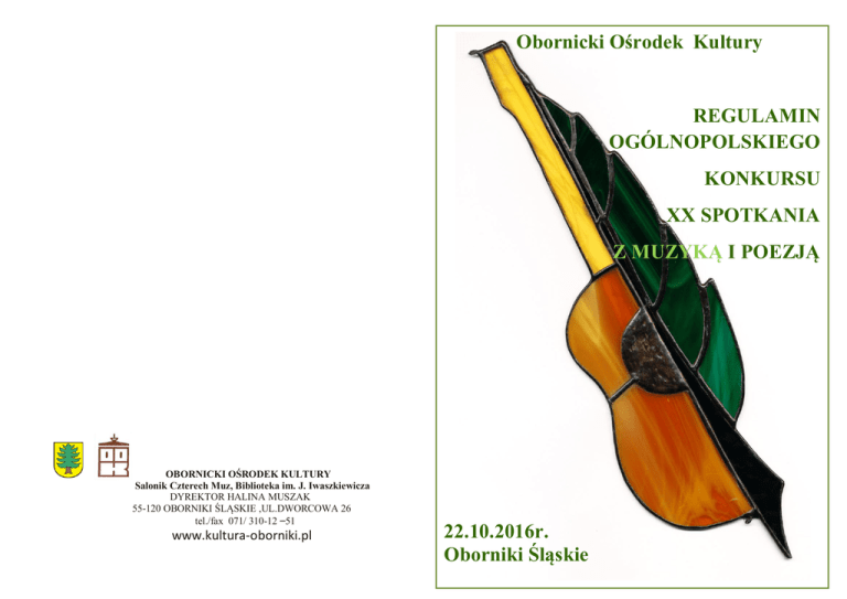 Obornicki Ośrodek Kultury REGULAMIN OGÓLNOPOLSKIEGO KONKURSU XX SPOTKANIA Z MUZYKĄ I POEZJĄ OBORNICKI OŚRODEK KULTURY Salonik Czterech Muz, Biblioteka im. J. Iwaszkiewicza DYREKTOR HALINA MUSZAK 55-120 OBORNIKI ŚLĄSKIE ,UL.DWORCOWA 26 tel./fax 071/ 310-12 –51 www.kultura-oborniki.pl 22.10.2016r. Oborniki Śląskie OGÓLNOPOLSKI KONKURS XX SPOTKANIA Z MUZYKĄ I POEZJĄ 22 .10.2016r. Oborniki Śląskie Organizator: * powołuje Jury Spotkań i zapewnia nagrody * zabezpiecza profesjonalny sprzęt nagłaśniający * próby przewidziane są w godz.9.00-10.30 REGULAMIN Organizator: Obornicki Ośrodek Kultury w Obornikach Śląskich /woj. dolnośląskie/ Cel imprezy: prezentacja dorobku twórczego w dziedzinie poezji i muzyki, integracja młodzieży W Spotkaniach może brać udział młodzież od 15 do 30 lat. Kategorie: 1. Recytacja (poezja) – 2 utwory do 8 min. ( w tej kategorii mogą wziąć udział laureaci konkursów recytatorskich) 2. Poezja śpiewana- 2 utwory do 8 min. /soliści , zespoły/ 3. Piosenka estradowa- 2 utwory do 8 min. /soliści , zespoły/ *Wykonawca może wziąć udział tylko w jednej kategorii muzycznej. * nie bierze odpowiedzialności za dopełnienie przez wykonawców formalności związanych z wymogami prawa autorskiego Warunkiem uczestnictwa w konkursie jest dokonanie opłaty wpisowej w wysokości 20 zł od osoby (w dniu Spotkań). Karty zgłoszeń z programem (autorzy, tytuły utworów) należy wypełnić czytelnie i przesłać do dnia 8 .10. 2016 na adres: OBORNICKI OŚRODEK KULTURY ul. Dworcowa 26 55-120 Oborniki Śląskie lub e-mailem: [email protected] Biuro organizacyjne będzie czynne od godz.9.00 Wszelkie dodatkowe informacje można uzyskać pod nr tel/fax 071/ 310-12-51 lub e-mail: [email protected] *Repertuar należy przygotować wyłącznie w języku polskim. UWAGA! W DNIU SPOTKAŃ NIE MA MOŻLIWOŚCI ZMIANY REPERTUARU. *Ocenie podlega 1 utwór wskazany w karcie przez uczestnika. *Należy mieć przygotowany drugi utwór, gdyż jury może poprosić o jego prezentację. *Laureaci pierwszych miejsc nie mogą ponownie wybrać kategorii, w której uzyskali nagrodę. Kryteria oceny: * oryginalność prezentacji * wartości artystyczne * dobór repertuaru Istnieje możliwość wynajęcia noclegów w Ośrodku Sportu i Rekreacji , nr tel.71 310 11 04 e-mail: [email protected] Program XX Spotkań z Muzyką i Poezją będzie zamieszczony na stronie internetowej Obornickiego Ośrodka Kultury : www.kultura-oborniki.pl Organizatorzy zastrzegają sobie prawo do zmian w programie. Serdecznie zapraszamy !