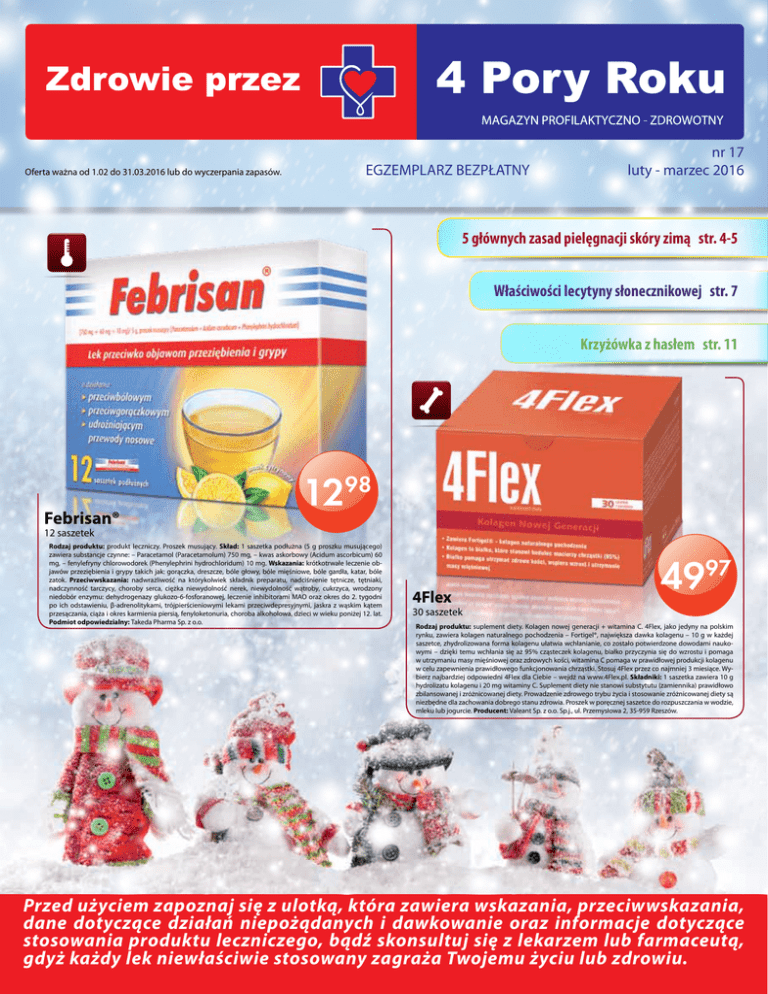 Oferta ważna od 1.02 do 31.03.2016 lub do wyczerpania zapasów. EGZEMPLARZ BEZPŁATNY nr 17 luty - marzec 2016 5 głównych zasad pielęgnacji skóry zimą str. 4-5 Właściwości lecytyny słonecznikowej str. 7 Krzyżówka z hasłem str. 11 Febrisan® 1298 12 saszetek Rodzaj produktu: produkt leczniczy. Proszek musujący. Skład: 1 saszetka podłużna (5 g proszku musującego) zawiera substancje czynne: – Paracetamol (Paracetamolum) 750 mg, – kwas askorbowy (Acidum ascorbicum) 60 mg, – fenylefryny chlorowodorek (Phenylephrini hydrochloridum) 10 mg. Wskazania: krótkotrwałe leczenie objawów przeziębienia i grypy takich jak: gorączka, dreszcze, bóle głowy, bóle mięśniowe, bóle gardła, katar, bóle zatok. Przeciwwskazania: nadwrażliwość na którykolwiek składnik preparatu, nadciśnienie tętnicze, tętniaki, nadczynność tarczycy, choroby serca, ciężka niewydolność nerek, niewydolność wątroby, cukrzyca, wrodzony niedobór enzymu: dehydrogenazy glukozo-6-fosforanowej, leczenie inhibitorami MAO oraz okres do 2. tygodni po ich odstawieniu, β-adrenolitykami, trójpierścieniowymi lekami przeciwdepresyjnymi, jaskra z wąskim kątem przesączania, ciąża i okres karmienia piersią, fenyloketonuria, choroba alkoholowa, dzieci w wieku poniżej 12. lat. Podmiot odpowiedzialny: Takeda Pharma Sp. z o.o. 4Flex 4997 30 saszetek Rodzaj produktu: suplement diety. Kolagen nowej generacji + witamina C. 4Flex, jako jedyny na polskim rynku, zawiera kolagen naturalnego pochodzenia – Fortigel®, największa dawka kolagenu – 10 g w każdej saszetce, zhydrolizowana forma kolagenu ułatwia wchłanianie, co zostało potwierdzone dowodami naukowymi – dzięki temu wchłania się aż 95% cząsteczek kolagenu, białko przyczynia się do wzrostu i pomaga w utrzymaniu masy mięśniowej oraz zdrowych kości, witamina C pomaga w prawidłowej produkcji kolagenu w celu zapewnienia prawidłowego funkcjonowania chrząstki. Stosuj 4Flex przez co najmniej 3 miesiące. Wybierz najbardziej odpowiedni 4Flex dla Ciebie – wejdź na www.4Flex.pl. Składniki: 1 saszetka zawiera 10 g hydrolizatu kolagenu i 20 mg witaminy C. Suplement diety nie stanowi substytutu (zamiennika) prawidłowo zbilansowanej i zróżnicowanej diety. Prowadzenie zdrowego trybu życia i stosowanie zróżnicowanej diety są niezbędne dla zachowania dobrego stanu zdrowia. Proszek w poręcznej saszetce do rozpuszczania w wodzie, mleku lub jogurcie. Producent: Valeant Sp. z o.o. Sp.j., ul. Przemysłowa 2, 35-959 Rzeszów. Przed użyciem zapoznaj się z ulotką, która zawiera wskazania, przeciwwskazania, dane dotyczące działań niepożądanych i dawkowanie oraz informacje dotyczące stosowania produktu leczniczego, bądź skonsultuj się z lekarzem lub farmaceutą, gdyż każdy lek niewłaściwie stosowany zagraża Twojemu życiu lub zdrowiu. str. 2 2249 9 69 Aspirin® C 20 tabletek musujących Rodzaj produktu: produkt leczniczy. Aspirin® C (Acidum acetylsalicylicum + Acidum ascorbicum), 400 mg + 240 mg, tabletki musujące. Wskazania: objawowe leczenie dolegliwości bólowych o małym i (lub) umiarkowanym nasileniu (np: bóle głowy, bóle zębów, bóle mięśniowe). Objawowe leczenie dolegliwości bólowych i gorączki w przebiegu przeziębienia i grypy. Przeciwwskazania: nadwrażliwość na substancję czynną - kwas acetylosalicylowy, inne salicylany lub jakikolwiek inny składnik preparatu, skaza krwotoczna, czynna choroba wrzodowa żołądka lub dwunastnicy, napady astmy oskrzelowej w wywiadzie, wywołane podaniem salicylanów lub substancji o podobnym działaniu, szczególnie niesteroidowych leków przeciwzapalnych, jednoczesne stosowanie metotreksatu w dawkach 15 mg na tydzień lub większych, ciężka niewydolność serca, ciężka niewydolność wątroby lub ciężka niewydolność nerek, ostatni trymestr ciąży, dzieci w wieku do 12. lat w przebiegu infekcji wirusowych. Podmiot odpowiedzialny: Bayer Sp. z o.o., Al. Jerozolimskie 158, 02-326 Warszawa, tel. (22) 5723500, fax (22) 5723850, www.bayer.com.pl V2/02/12/2008/KKM Coldrex® MaxGrip 10 saszetek Rodzaj produktu: produkt leczniczy. Coldrex MaxGrip o smaku cytrynowym, (1000 mg + 10 mg + 40 mg)/saszetkę, proszek do sporządzania roztworu doustnego. Skład: 1 saszetka zawiera 1000 mg Paracetamolum (paracetamolu), 10 mg Phenylephrini hydrochloridum (chlorowodorku fenylefryny), 40 mg Acidum ascorbicum (kwasu askorbowego). Wskazania do stosowania: krótkotrwałe, objawowe leczenie grypy lub przeziębienia, przebiegających z gorączką, dreszczami, bólem głowy, bólem gardła, nieżytem nosa (katarem). Przeciwwskazania: stwierdzona nadwrażliwość na paracetamol, fenylefrynę, kwas askorbowy lub substancje pomocnicze wchodzące w skład produktu. Niewydolność wątroby lub ciężka niewydolność nerek, choroba alkoholowa. Przyjmowanie zydowudyny, stosowanie inhibitorów monoaminooksydazy (MAO) i okres 2. tygodni po ich ostatnim zastosowaniu. Podmiot odpowiedzialny: GlaxoSmithKline Consumer Healthcare Sp. z o.o. 44 69 1497 Entitis™ 30 pastylek do ssania, smak miętowy/truskawkowy 4995 Entitis™ Baby 30 saszetek z proszkiem, smak bananowy/neutralny Rodzaj produktu: suplement diety. Przełom w profilaktyce nawracających infekcji ucha, nosa i gardła. Dla dzieci powyżej 3. roku życia i dorosłych, dla niemowląt powyżej 6. miesiąca życia i dzieci do 3. roku życia (saszetki). ENTitis to preparat do postępowania dietetycznego: w profilaktyce nawracających infekcji ucha, nosa, gardła (ENT), w trakcie infekcji wirusowej nosa i/lub gardła, po przebytej anginie. ENTitis zawiera opatentowany składnik Bactoblis® (Streptococcus salivarius K12). Streptococcus salivarius K12 produkuje lantybiotyki hamujące wzrost drobnoustrojów patogennych odpowiedzialnych za infekcje ucha, nosa i gardła.* Podmiot odpowiedzialny: Sequoia Sp. z o.o. *www.ENTitis.pl Strepsils® Intensive 16 tabletek do ssania Rodzaj produktu: produkt leczniczy. Wskazania do stosowania: kr