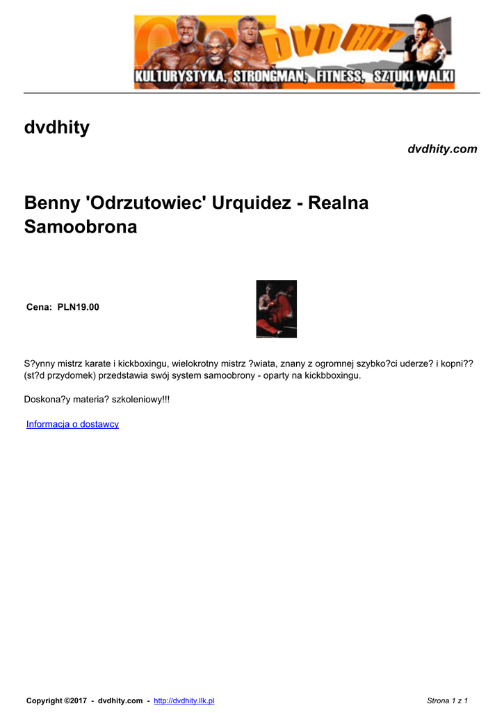 dvdhity dvdhity.com Benny 'Odrzutowiec' Urquidez - Realna Samoobrona Cena: PLN19.00 S?ynny mistrz karate i kickboxingu, wielokrotny mistrz ?wiata, znany z ogromnej szybko?ci uderze? i kopni?? (st?d przydomek) przedstawia swój system samoobrony - oparty na kickbboxingu. Doskona?y materia? szkoleniowy!!! Informacja o dostawcy Copyright ©2017 - dvdhity.com - http://dvdhity.llk.pl Strona 1 z 1