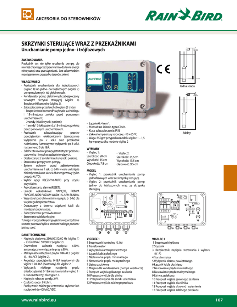 AKCESORIA DO STEROWNIKÓW SKRZYNKI STERUJĄCE WRAZ Z PRZEKAŹNIKAMI Uruchamianie pomp jedno- i trójfazowych REМOTE ZASTOSOWANIA Przekaźnik ten nie tylko uruchamia pompę, ale również chroni ją przed przerwami w dostawie energii elektrycznej, oraz przeciążeniami. Jest odpowiednim rozwiązaniem w przypadku terenów zieleni. WŁAŚCIWOŚCI • Przekaźnik uruchamiania dla jednofazowych (vigilec 1) lub jedno- do trójfazowych (vigilec 2) pomp naziemnych lub głębinowych. • Kondensator pomp głębinowych zabezpieczony wewnątrz skrzynki sterującej (vigilec 1). Bezpieczniki kontrolne (vigilec 2). • Zabezpieczenie przed suchobiegiem (3 tryby): - bezpośrednio bez sond*: wykrycie suchobiegu i 15-minutowa zwłoka przed ponownym uruchomieniem; - 2 sondy (niski i wysoki poziom); - 1 sonda* (niski poziom) z 15-minutową zwłoką przed ponownym uruchomieniem. • Przekaźnik zabezpieczający przeciw przeciążeniom elektronicznym (samoczynne wyłączenie po 7 sek.) oraz przekaźnik nadmiarowy (samoczynne wyłączenie po 3 sek.), nastawne od 0 do 18A. • Zdalne sterowanie pompą (start/stop) z poziomu sterownika i innych urządzeń sterujących. • Dostarczany z 2 sondami (niski/wysoki poziom). • Sterowanie przepływem pompy. • System ochrony przed zablokowaniem: uruchamianie na 1 sek. co 24 h w celu uniknięcia blokady wirnika na skutek dłuższej przerwy (tylko pozycja AUTO). • Wybór opcji RĘCZNY-0-AUTO przy użyciu przycisków. • Przycisk restartu alarmu (RESET). • Lampki wskaźnikowe: NAPIĘCIE, POMPA PRACUJE, NISKI POZIOM WODY i ALARM SILNIKA. • Wszystkie kontrolki o niskim napięciu (< 24V) dla większego bezpieczeństwa. • Dostarczany z dwoma wiązkami kabli dla montażu kondensatora. • Zabezpieczenie przeciwburzowe. • Sterowanie wielofunkcyjne. *Uwaga: w przypadku pompy głębinowej, urządzenie to może pracować tylko z sondami niskiego poziomu lub bez sond. WYMIARY • Vigilec 1: Szerokość: 20 cm Wysokość: 15 cm Głębokość: 7,8 cm DANE TECHNICZNE • Napięcie sieciowe: 230VAC 50/60 Hz (vigilec 1) – 230/400VAC 50/60 Hz (vigilec 2). • Dozwolone wahania napięcia: ±20%, automatyczne wyłączanie przy ±30%. • Maksymalne natężenie prądu: 18A AC3 (vigilec 1), 16A AC3 (vigilec 2). • Regulator przeciążenia: 0-18A (nastawny) dla vigilec 1 i 0-16A (nastawny) dla vigilec 2. • Wyłącznik niskiego natężenia prądu (niedociążenia): 0-18A (nastawny) dla vigilec 1 i 0-16A (nastawny) dla vigilec 2. • Napięcie robocze sondy: 24V. • Czułość sondy: 9 Kohm. • Podłączenie zdalnego sterowania: stykowe lub napięcie 6 do 400VAC/VDC. VIGELEC 1 1 Bezpiecznik kontrolny (0,1A) 2 Transformator 3 Wyłącznik alarmu powietrznego 4 Łącznik kabla płaskiego 5 Nastawianie prądu minimalnego 6 Nastawianie prądu maksymalnego 7 Listwa zaciskowa 8 Miejsce dla kondensatora (pompa wiertnicza) 9 Przepust wejścia głównego zasilania 10 Przepust wyjścia dla silnika 11 Przepust wejścia dla sond i uziemienia 12 Przepust wejścia zdalnego przekazu www.rainbird.eu Jedna sonda REМOTE • Łączówki: 4 mm2. • Montaż: na ścianie, typu Clevis. • Klasa zabezpieczenia: IP56 • Zakres temperatury roboczej: -10 +55 ºC • Waga: 850g w przypadku modelu vigilec 1 – 1,5 kg w przypadku modelu vigilec 2 Zdalny • Vigilec 2: Szerokość: 25,5cm Wysokość: 19,5 cm Głębokość: 9,5 cm MODEL • Vigilec 1: przekaźnik uruchamiania pomp jednofazowych wraz ze skrzynką sterującą • Vigilec 2: przekaźnik uruchamiania pomp jedno- do trójfazowych wraz ze skrzynką sterującą VIGELEC 2 1 Bezpieczniki główne 2 Stycznik 3 Bezpiecznik napięcia sterowania i wyboru (0,1A) 4 Transformator 5 Wyłącznik alarmu powietrznego 6 Łącznik kabla płaskiego 7 Nastawianie prądu minimalnego 8 Nastawianie prądu maksymalnego 9 Listwa zaciskowa 10 Przepust wejścia głównego zasilania 11 Przepust wyjścia dla silnika 12 Przepust wejścia dla sond i uziemienia 13 Przepust wejścia zdalnego przekazu 107