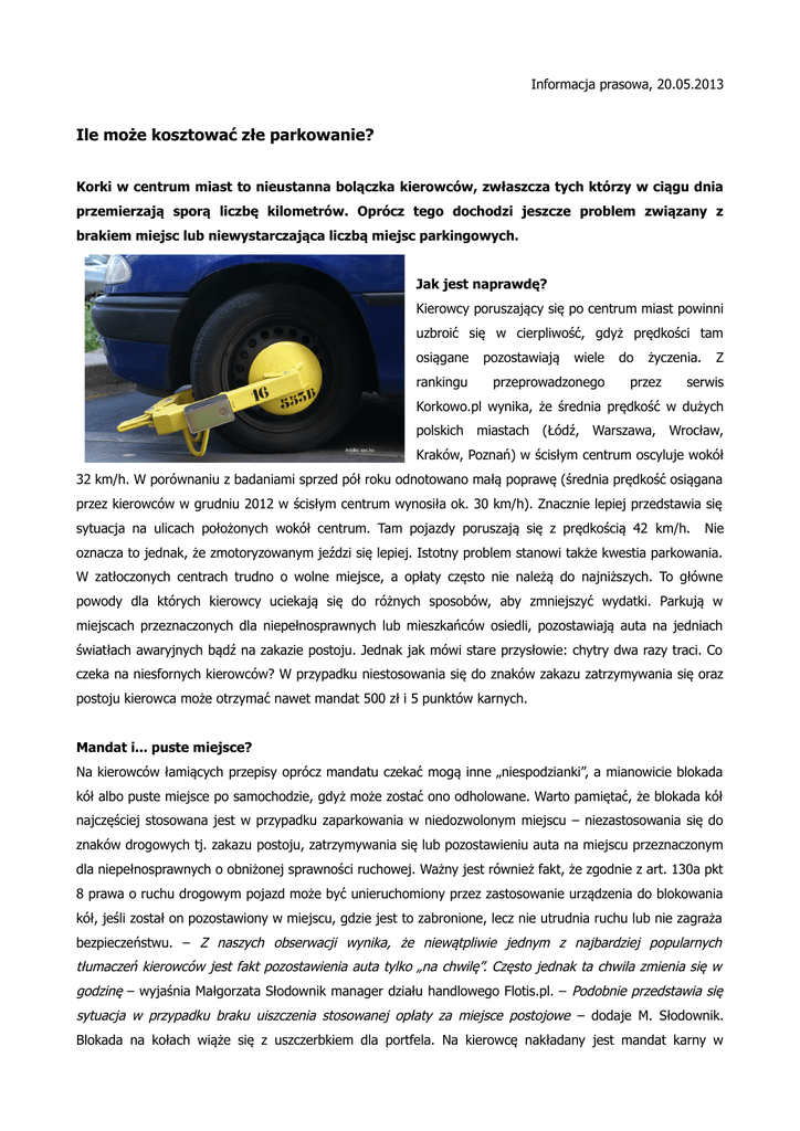 Informacja prasowa, 20.05.2013 Ile może kosztować złe parkowanie? Korki w centrum miast to nieustanna bolączka kierowców, zwłaszcza tych którzy w ciągu dnia przemierzają sporą liczbę kilometrów. Oprócz tego dochodzi jeszcze problem związany z brakiem miejsc lub niewystarczająca liczbą miejsc parkingowych. Jak jest naprawdę? Kierowcy poruszający się po centrum miast powinni uzbroić się w cierpliwość, gdyż prędkości tam osiągane rankingu pozostawiają wiele przeprowadzonego do życzenia. przez Z serwis Korkowo.pl wynika, że średnia prędkość w dużych polskich miastach (Łódź, Warszawa, Wrocław, Kraków, Poznań) w ścisłym centrum oscyluje wokół 32 km/h. W porównaniu z badaniami sprzed pół roku odnotowano małą poprawę (średnia prędkość osiągana przez kierowców w grudniu 2012 w ścisłym centrum wynosiła ok. 30 km/h). Znacznie lepiej przedstawia się sytuacja na ulicach położonych wokół centrum. Tam pojazdy poruszają się z prędkością 42 km/h. Nie oznacza to jednak, że zmotoryzowanym jeździ się lepiej. Istotny problem stanowi także kwestia parkowania. W zatłoczonych centrach trudno o wolne miejsce, a opłaty często nie należą do najniższych. To główne powody dla których kierowcy uciekają się do różnych sposobów, aby zmniejszyć wydatki. Parkują w miejscach przeznaczonych dla niepełnosprawnych lub mieszkańców osiedli, pozostawiają auta na jedniach światłach awaryjnych bądź na zakazie postoju. Jednak jak mówi stare przysłowie: chytry dwa razy traci. Co czeka na niesfornych kierowców? W przypadku niestosowania się do znaków zakazu zatrzymywania się oraz postoju kierowca może otrzymać nawet mandat 500 zł i 5 punktów karnych. Mandat i... puste miejsce? Na kierowców łamiących przepisy oprócz mandatu czekać mogą inne „niespodzianki”, a mianowicie blokada kół albo puste miejsce po samochodzie, gdyż może zostać ono odholowane. Warto pamiętać, że blokada kół najczęściej stosowana jest w przypadku zaparkowania w niedozwolonym miejscu – niezastosowania się do znaków drogowych tj. zakazu postoju, zatrzymywania się lub pozostawieniu auta na miejscu przeznaczonym dla niepełnosprawnych o obniżonej sprawności ruchowej. Ważny jest również fakt, że zgodnie z art. 130a pkt 8 prawa o ruchu drogowym pojazd może być unieruchomiony przez zastosowanie urządzenia do blokowania kół, jeśli został on pozostawiony w miejscu, gdzie jest to zabronione, lecz nie utrudnia ruchu lub nie zagraża bezpieczeństwu. – Z naszych obserwacji wynika, że niewątpliwie jednym z najbardziej popularnych tłumaczeń kierowców jest fakt pozostawienia auta tylko „na chwilę”. Często jednak ta chwila zmienia się w godzinę – wyjaśnia Małgorzata Słodownik manager działu handlowego Flotis.pl. – Podobnie przedstawia się sytuacja w przypadku braku uiszczenia stosowanej opłaty za miejsce postojowe – dodaje M. Słodownik. Blokada na kołach wiąże się z uszczerbkiem dla portfela. Na kierowcę nakładany jest mandat karny w wysokości od 100 do 500 zł. Warto dodać, iż można odmówić jego przyjęcia i mimo tego żądać usunięcia blokady. W przypadku odmowy przyjęcia mandatu nastąpi skierowanie sprawy do sądu. Komu odholują samochód? Na najbardziej niesfornych kierowców pozostawiających auta w niedozwolonych miejscach czeka... puste miejsce, czyli odholowanie. Najczęściej ma to miejsce w przypadku, gdy samochód został pozostawiony w miejscu zabronionym i jednocześnie utrudnia ruch pojazdów, pieszych lub zagraża bezpieczeństwu. To samo może spotkać osoby, które zaparkowały bezprawnie na kopercie dla inwalidów lub w miejscu obowiązywania znaku wskazującego, że zaparkowany pojazd zostanie usunięty na koszt właściciela. I tym razem nie obędzie się bez uszczerbku dla portfela, gdyż oprócz opłaty za odholowanie auta należy także pokryć koszt postoju na parkingu strzeżonym. Samochód można odebrać dopiero z dowodem wpłaty. Koszt odholowania auta to maksymalnie 478 zł za pojazd o dopuszczalnej masie całkowitej do 3,5t. Natomiast każda doba postoju na parkingu strzeżonym to maksymalnie 37 zł. Źródło: Flotis.pl ---------------------------Dystrybucja materiałów: Katarzyna Florkowska [email protected] kom./+48/ 730 -311-112