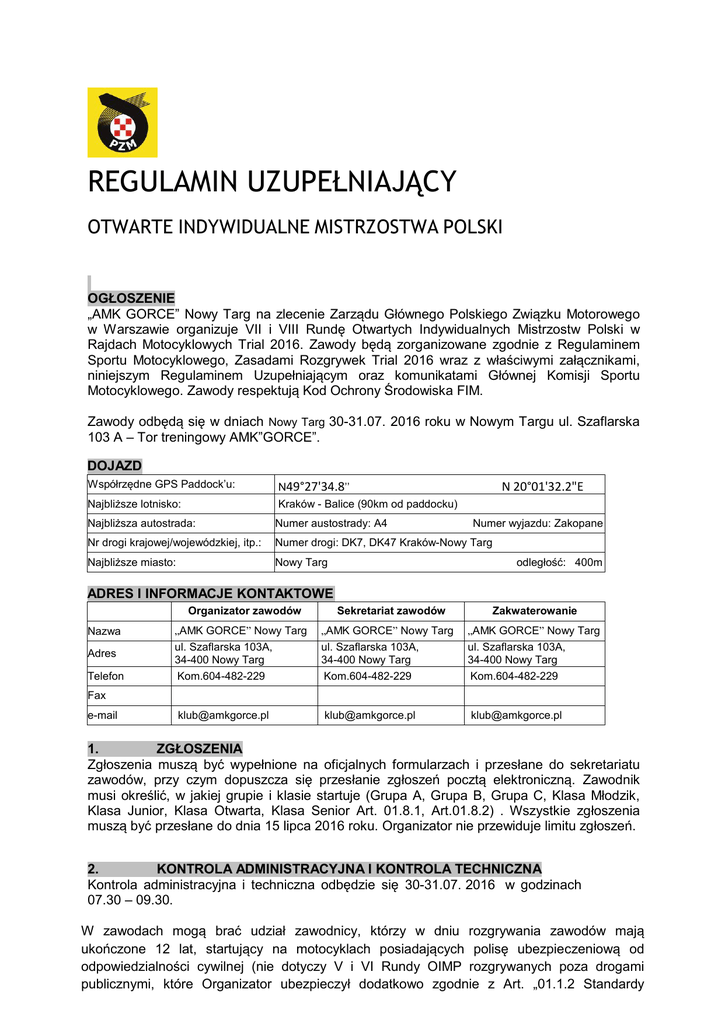 REGULAMIN UZUPEŁNIAJĄCY OTWARTE INDYWIDUALNE MISTRZOSTWA POLSKI OGŁOSZENIE „AMK GORCE” Nowy Targ na zlecenie Zarządu Głównego Polskiego Związku Motorowego w Warszawie organizuje VII i VIII Rundę Otwartych Indywidualnych Mistrzostw Polski w Rajdach Motocyklowych Trial 2016. Zawody będą zorganizowane zgodnie z Regulaminem Sportu Motocyklowego, Zasadami Rozgrywek Trial 2016 wraz z właściwymi załącznikami, niniejszym Regulaminem Uzupełniającym oraz komunikatami Głównej Komisji Sportu Motocyklowego. Zawody respektują Kod Ochrony Środowiska FIM. Zawody odbędą się w dniach Nowy Targ 30-31.07. 2016 roku w Nowym Targu ul. Szaflarska 103 A – Tor treningowy AMK”GORCE”. DOJAZD Współrzędne GPS Paddock’u: N49°27'34.8’’ Najbliższe lotnisko: 20°01'32.2" Kraków - Balice (90km od paddocku) Najbliższa autostrada: Numer austostrady: A4 Nr drogi krajowej/wojewódzkiej, itp.: Numer drogi: DK7, DK47 Kraków-Nowy Targ Najbliższe miasto: Nowy Targ N 20°01'32.2"E Numer wyjazdu: Zakopane odległość: 400m ADRES I INFORMACJE KONTAKTOWE Organizator zawodów Sekretariat zawodów Zakwaterowanie Nazwa „AMK GORCE” Nowy Targ „AMK GORCE” Nowy Targ „AMK GORCE” Nowy Targ Adres ul. Szaflarska 103A, 34-400 Nowy Targ ul. Szaflarska 103A, 34-400 Nowy Targ ul. Szaflarska 103A, 34-400 Nowy Targ Telefon Kom.604-482-229 Kom.604-482-229 Kom.604-482-229 [email protected] [email protected] [email protected] Fax e-mail 1. ZGŁOSZENIA Zgłoszenia muszą być wypełnione na oficjalnych formularzach i przesłane do sekretariatu zawodów, przy czym dopuszcza się przesłanie zgłoszeń pocztą elektroniczną. Zawodnik musi określić, w jakiej grupie i klasie startuje (Grupa A, Grupa B, Grupa C, Klasa Młodzik, Klasa Junior, Klasa Otwarta, Klasa Senior Art. 01.8.1, Art.01.8.2) . Wszystkie zgłoszenia muszą być przesłane do dnia 15 lipca 2016 roku. Organizator nie przewiduje limitu zgłoszeń. 2. KONTROLA ADMINISTRACYJNA I KONTROLA TECHNICZNA Kontrola administracyjna i techniczna odbędzie się 30-31.07. 2016 w godzinach 07.30 – 09.30. W zawodach mogą brać udział zawodnicy, którzy w dniu rozgrywania zawodów mają ukończone 12 lat, startujący na motocyklach posiadających polisę ubezpieczeniową od odpowiedzialności cywilnej (nie dotyczy V i VI Rundy OIMP rozgrywanych poza drogami publicznymi, które Organizator ubezpieczył dodatkowo zgodnie z Art. „01.1.2 Standardy Organizacyjne” Zasad Rozgrywek Trial 2016) oraz spełniają wszystkie wymagania Regulaminu Technicznego Rajdów Trial. Przy kontroli dokumentów zawodnik musi przedłożyć ważną licencję zgodnie z Art. 01.8.3, oraz ubezpieczenie OC pojazdu (jeśli jest wymagana), na którym się porusza. Przy kontroli technicznej zawodnik musi okazać polisę OC motocykla (jeśli jest wymagana) oraz kask zgodny ze standardami Regulaminu Technicznego Rajdów Trial. Zawodnik ma zapewnioną możliwość pokonania całej trasy (z paddocku do wszystkich odcinków jazdy obserwowanej, a następnie z powrotem do paddocku) bez konieczności korzystania z dróg publicznych 3. NUMERY STARTOWE Organizator zapewnia numery startowe. 4. KOLEJNOŚĆ STARTU Przy kontroli administracyjnej każdy zawodnik rejestruje się i losuje kolejność startu, zgodnie z Art. 01.8.10. 5. TRASA Trasa składa się z 3 okrążeń. Długość jednego okrążenia trasy wynosi 3 km. 6. PADDOCK I BIURO ZAWODÓW Paddock dla zawodników zostanie otwarty w dniu 30.07. 2016 od godziny 07.30. Biuro zawodów zostanie otwarte w dniu 30.07. 2016 od godziny 07.30. 7. ZABEZPIECZENIE MEDYCZNE Podczas trwania zawodów organizator zabezpiecza karetkę szybkiej interwencji, pozwalającej na miejscu wypadku udzielić natychmiastowej pomocy w zakresie czynności oddechowych i sercowo-krążeniowych. Personel medyczny - co najmniej dwie osoby uprawnione do wykonywania medycznych czynności ratunkowych w tym: • Lekarz zawodów mogący udzielić pierwszej pomocy i przeprowadzić akcję reanimacyjną. • Ratownik lub pielęgniarka. • Kierowca karetki przeszkolony w udzielaniu pierwszej pomocy. 8. UBEZPIECZENIE • Zawody, osoby uczestniczące w organizacji zawodów oraz zawodnicy są ubezpieczeni przez organizatora od odpowiedzialności cywilnej OC. • Ubezpieczenie NNW zawodnicy oraz sędziowie i osoby funkcyjne posiadają w ramach opłaty za licencje, a osoby uczestniczące w organizacji zawodów nieposiadające licencji ubezpiecza organizator zawodów. • Asystent towarzyszący zawodnikowi musi posiadać ważną licencję lub posiadać polisę NNW. Asystenci bez licencji lub polisy NNW muszą wykupić ubezpieczenie od NNW na miejscu zawodów u organizatora. • Organizator nie przyjmuje na siebie odpowiedzialności za szkody powstałe w czasie zawodów w stosunku do zawodnika i jego sprzętu. • Organizator posiada ubezpieczenia od odpowiedzialności cywilnej organizatora, osób funkcyjnych oraz zawodników wobec osób trzecich oraz ich mienia o sumie gwarancyjnej o równowartości minimum 20.000 Euro. 9. NAGRODY I CEREMONIA WRĘCZANIA NAGRÓD Ceremonia Wręczania Nagród odbędzie się w miejscu startu w ciągu 15 minut od przyjazdu na metę ostatniego sklasyfikowanego zawodnika drugiego dnia zawodów. Nagrody zostaną przyznane zgodnie z Art. 01.15 Regulaminu Sportowego Rajdów Trial oraz Regulaminem Finansowym Rajdów Trial. 10. INFORMACJE DODATKOWE Zawodnicy mają obowiązek stosowania maty środowiskowej pod motocyklem w czasie, gdy wykonywane są przy nim czynności obsługowe takie jak np. tankowanie paliwa, smarowanie łańcucha, naprawy itp. Przestrzeganie tego obowiązku będzie kontrolowane przez Komisarza d/s Ochrony Środowiska oraz inne osoby urzędowe. Za brak maty środowiskowej zawodnik zostanie ukarany karą finansową zgodnie z Regulaminem Sportowym Rajdów Trial i Regulaminem Finansowym Rajdów Trial. Organizator informuje, że przed startem oraz w trakcie trwania zawodów prowadzone będą kontrole trzeźwości zawodników zgodnie z Regul