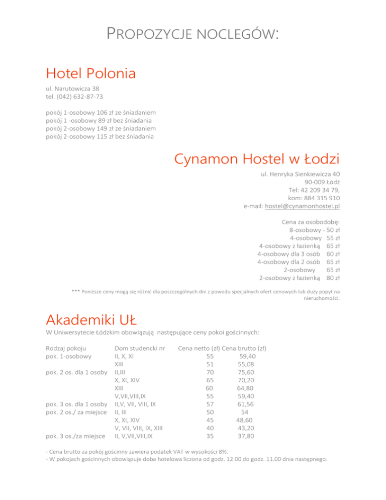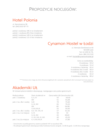 PROPOZYCJE NOCLEGÓW: Hotel Polonia ul. Narutowicza 38 tel. (042) 632-87-73 pokój 1-osobowy 106 zł ze śniadaniem pokój 1 -osobowy 89 zł bez śniadania pokój 2-osobowy 149 zł ze śniadaniem pokój 2-osobowy 115 zł bez śniadania Cynamon Hostel w Łodzi ul. Henryka Sienkiewicza 40 90-009 Łódź Tel: 42 209 34 79, kom: 884 315 910 e-mail: [email protected] Cena za osobodobę: 8-osobowy - 50 zł 4-osobowy 55 zł 4-osobowy z łazienką 65 zł 4-osobowy dla 3 osób 60 zł 4-osobowy dla 2 osób 65 zł 2-osobowy 65 zł 2-osobowy z łazienką 80 zł *** Poniższe ceny mogą się różnić dla poszczególnych dni z powodu specjalnych ofert cenowych lub duży popyt na nieruchomości. Akademiki UŁ W Uniwersytecie Łódzkim obowiązują następujące ceny pokoi gościnnych: Rodzaj pokoju pok. 1-osobowy pok. 2 os. dla 1 osoby pok. 3 os. dla 1 osoby pok. 2 os./ za miejsce pok. 3 os./za miejsce Dom studencki nr II, X, XI XIII II,III X, XI, XIV XIII V,VII,VIII,IX II,V, VII, VIII, IX II, III X, XI, XIV V, VII, VIII, IX, XIII II, V,VII,VIII,IX Cena netto (zł) Cena brutto (zł) 55 59,40 51 55,08 70 75,60 65 70,20 60 64,80 55 59,40 57 61,56 50 54 45 48,60 40 43,20 35 37,80 - Cena brutto za pokój gościnny zawiera podatek VAT w wysokości 8%. - W pokojach gościnnych obowiązuje doba hotelowa liczona od godz. 12.00 do godz. 11.00 dnia następnego.