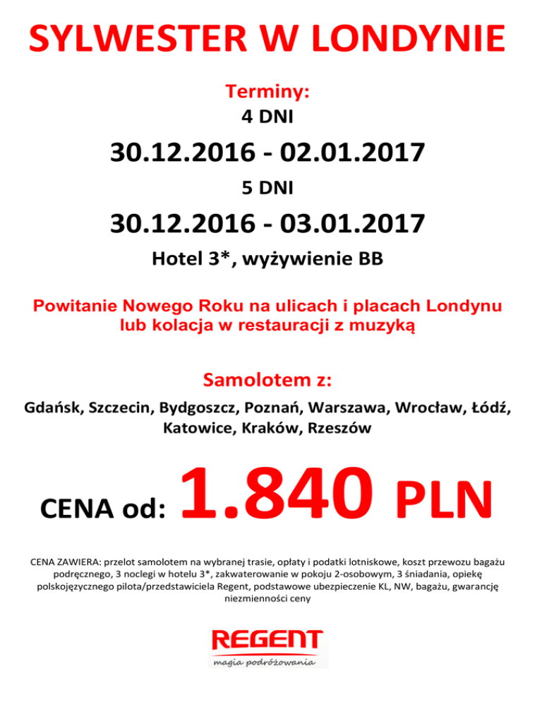 SYLWESTER W LONDYNIE Terminy: 4 DNI 30.12.2016 - 02.01.2017 5 DNI 30.12.2016 - 03.01.2017 Hotel 3*, wyżywienie BB Powitanie Nowego Roku na ulicach i placach Londynu lub kolacja w restauracji z muzyką Samolotem z: Gdańsk, Szczecin, Bydgoszcz, Poznań, Warszawa, Wrocław, Łódź, Katowice, Kraków, Rzeszów CENA od: 1.840 PLN CENA ZAWIERA: przelot samolotem na wybranej trasie, opłaty i podatki lotniskowe, koszt przewozu bagażu podręcznego, 3 noclegi w hotelu 3*, zakwaterowanie w pokoju 2-osobowym, 3 śniadania, opiekę polskojęzycznego pilota/przedstawiciela Regent, podstawowe ubezpieczenie KL, NW, bagażu, gwarancję niezmienności ceny