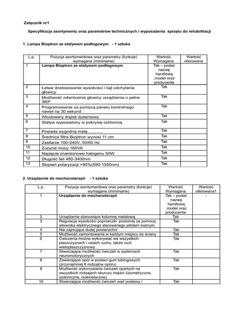 Załącznik nr1 Specyfikacja asortymentu oraz parametrów technicznych i wyposażenia sprzętu do rehabilitacji 1. Lampa Bioptron ze statywem podłogowym - 1 sztuka L.p. 1 2 Pozycja asortymentowa oraz parametry (funkcje) wymagane (minimalne) Lampa Bioptron ze statywem podłogowym 5 6 Łatwe dostosowanie wysokości i kąt odchylania głowicy Możliwość odwrócenia głowicy urządzenia o pełne 360º Programowanie za pomocą panelu kontrolnego nawet na 30 sekund Wbudowany drążek dystansowy Statyw wyposażony w pokrywę ochronną 7 8 9 10 11 12 13 Posiada wygodną matę…......... Średnica filtra Bioptron wynosi 11 cm Zasilanie 100-240V; 50/60 Hz Zużycie mocy 160VA Napięcie znamionowe halogenu 50W Długość fali 480-3400nm Stopień polaryzacji >95%(590-1550nm) 3 4 2. Urządzenie do mechanoterapii L.p. 1 2 3 4 5 6 7 8 9 10 Wartość Wymagana Tak – podać nazwę handlową ,model oraz producenta Tak Wartość oferowana Tak Tak Tak Tak Tak Tak Tak Tak Tak Tak Tak - 1 sztuka Pozycja asortymentowa oraz parametry (funkcje) wymagane (minimalne) Urządzenie do mechanoterapii Urządzenie stanowiące kolumnę metalową Regulacja wysokości poprzeczki poziomej za pomocą siłownika elektrycznego sterowanego pilotem nożnym. Nie zajmujące dużej powierzchni Możliwość zamontowania w każdym miejscu do ściany Ćwiczenia można wykonywać we wszystkich płaszczyznach i osiach ruchu, także ruch wielopłaszczyznowy Stwarzające możliwość ćwiczeń w systemach neuromotorycznych Zawierające opór w postaci gum tubingowych (przynajmniej 6 rodzajów oporu) Możliwość wykonywania ćwiczeń opartych na wszystkich rodzajach skurczu mięśni (izometryczne, izotoniczne, izokinetyczne) Stwarzające możliwość ćwiczeń wad postawy i Wartość Wymagana Tak – podać nazwę handlową ,model oraz producentaTak Tak Tak Tak Tak Tak Tak Tak Tak Wartość oferowana1 - skoliozę opartych na metodach ćwiczeń symetrycznych i asymetrycznych Wyposażony w akcesoria: drążki do kolumny, drążek rehabilitacyjny, bloczki, linki, podwieszki, pas do ćwiczeń, szelki stabilizujące, mankiety, czepiec, uchwyty, łącznik kolumny ….......... Tak 3. Ergometr eliptyczny (orbitrek)– 1 sztuka L.p. 1 Pozycja asortymentowa oraz parametry (funkcje) wymagane (minimalne) Ergometr eliptyczny (orbitrek) 2 System hamowania elektryczny Wartość Wymagana Tak – podać nazwę handlową, model oraz producenta Tak 3 Ciężar koła zamachowego 22kg Tak 4 Regulacja obciążenia Tak 5 Przyłącza sieciowe Tak 6 Łożyskowane przeguby Tak 7 Regulowane oparcie stóp Tak 8 Rolki transportowe Tak 10 Wymiary urządzenia (dł./szer./wys. w cm) 144/56/152 Tak 11 Max. obciążenie wagowe 150 kg Tak 12 Moc w Wat (25-400) Tak 13 Złącze PC- USB Tak 14 Komputer treningowy Tak 15 Czas/dystans/całkowita liczba kilometrów/prędkość/częstotliwość/zużycie energii Tak 16 Pomiar tętna (czujnik dłoni; klips na ucho) Tak 17 Cardio-Puls-Set Tak 18 Wartości średnie Tak 19 Pomiar tętna w fazie odpoczynku z oceną sprawności Tak 20 Wyświetlacz Tak 21 Łącze PC KETT .NET 22 23 Program treningowy sterowany tętnem -1szt Programy treningowe (łącznie) 8 szt. - USB Tak Tak Tak Wartość oferowana 4. Thera Band Piłka 120 cm - 5 sztuki L.p. 1 Pozycja asortymentowa oraz parametry (funkcje) wymagane (minimalne) Thera Band Piłka 120 cm 1 Wytrzymałość na odprężenia mechaniczne od 450 do 1200kg Wartość Wymagana Tak – podać nazwę handlową ,model oraz producentaTak Wartość oferowana - 5.Poduszka do ćwiczeń sensometrycznych z wypustkami - 10 sztuk I 1 1 Pozycja asortymentowa oraz parametry wymagane (minimalne) Poduszka do ćwiczeń sensometrycznych z wypustkami Średnica 33 cm Wartość Wymagana Tak – podać nazwę handlową ,model oraz producenta Tak Wartość oferowana Wartość Wymagana Tak – podać nazwę handlową ,model oraz producenta Tak Wartość oferowana 6. Piłka śr. 26 cm - 15 sztuk L.p. 1 Pozycja asortymentowa oraz parametry (funkcje) wymagane (minimalne) Piłka śr. 26 cm 2 Wysoka elastyczność 3 Wykonane z tworzywa PCV Tak 7. Stół do terapii ręki – 1 sztuka L.p. 1 2 3 Pozycja asortymentowa oraz parametry (funkcje) wymagane (minimalne) Stół do terapii ręki Moduł główny na podstawie jezdnej z 3 rozkładanymi blatami 4 tablice terapeutyczne: Tablica nr 1 metalowa płyta z gwintowanymi otworami różnych rozmiarów do wkręcania śrub imbusowych i krzyżakowych Tablica Nr 2 drewniane kołki różnych rozmiarów do umieszczania w otworach Tablica nr 8 Zestaw do funkcjonalnej rehabilitacji ręki. Wartość Wymagana Tak – podać nazwę handlową ,model oraz producenta Tak Tak Wartość oferowana Tablica Nr 9 kołki drewniane różnych rozmiarów do umieszczania w odpowiednich otworach oraz linki do przeplatania. 8.Aparat do elektroterapii,ultradźwięków,laseroterapii i magnetoterapii – 1 sztuka Lip. 1 Pozycja asortymentowa oraz parametry (funkcje) wymagane (minimalne) Aparat do elektroterapii,ultradźwięków,laseroterapii i magnetoterapii np.:” BTL -5818 SLM Combi” Wartość Wymagana Tak – podać nazwę handlową ,model oraz producenta Tak 2 Aparat COMBI ( 1-kanałowa elektroterapia z rozszerzoną gama prądów, ultradźwięki, laser i magnetoterapią) z kolorowym ekranem dotykowym o przekroju 5,7” 3 Programy użytkownika Tak 4 Encyklopedia terapeutyczna Tak 5 Kartoteka pacjentów Tak 6 System Modułowy™ - możliwość dalszej rozbudowy Tak 7 Wielojęzyczne menu Tak 8 Stolik Tak 9 Elektroterapia z pełną gamą prądów o niskich i średnich częstotliwościach oraz ich modyfikacje i z elektrodiagnostyką. +/- Prosta zmiana polaryzacji elektrod Tryb prądu stałego (CC) i stałego napięcia (CV) Programowalne sekwencje (zestawy) prądów Elektrodiagnostyka: krzywa I/t, reobaza i chronaksja, punkt motoryczny, współczynnik akomodacji Test jakości elektrod i kabli pacjenta System Modułowy™ - możliwość dalszej rozbudowy Współpraca z aparatem podciśnieniowym Ultradźwięki 