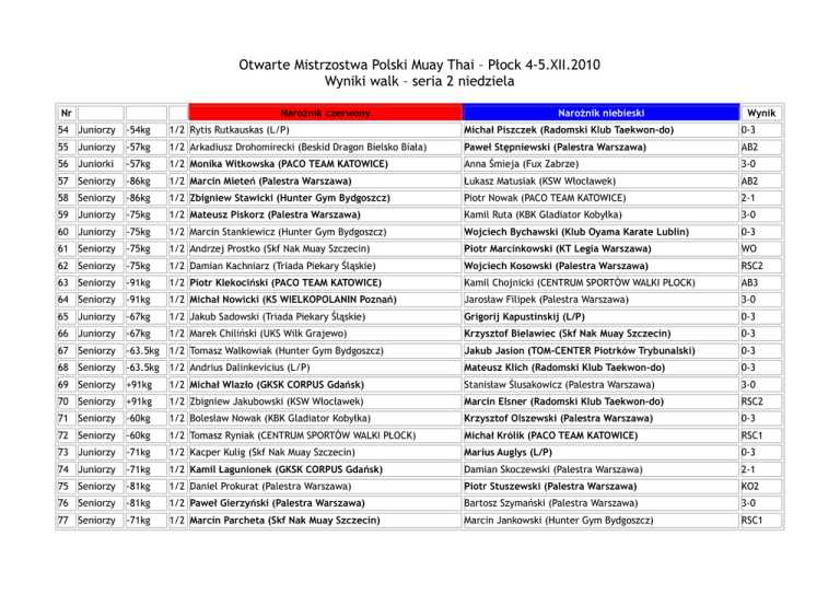 Otwarte Mistrzostwa Polski Muay Thai – Płock 4-5.XII.2010 Wyniki walk – seria 2 niedziela Nr Narożnik czerwony Narożnik niebieski Wynik 54 Juniorzy -54kg 1/2 Rytis Rutkauskas (L/P) Michał Piszczek (Radomski Klub Taekwon-do) 0-3 55 Juniorzy -57kg 1/2 Arkadiusz Drohomirecki (Beskid Dragon Bielsko Biała) Paweł Stępniewski (Palestra Warszawa) AB2 56 Juniorki -57kg 1/2 Monika Witkowska (PACO TEAM KATOWICE) Anna Śmieja (Fux Zabrze) 3-0 57 Seniorzy -86kg 1/2 Marcin Mieteń (Palestra Warszawa) Łukasz Matusiak (KSW Włocławek) AB2 58 Seniorzy -86kg 1/2 Zbigniew Stawicki (Hunter Gym Bydgoszcz) Piotr Nowak (PACO TEAM KATOWICE) 2-1 59 Juniorzy -75kg 1/2 Mateusz Piskorz (Palestra Warszawa) Kamil Ruta (KBK Gladiator Kobyłka) 3-0 60 Juniorzy -75kg 1/2 Marcin Stankiewicz (Hunter Gym Bydgoszcz) Wojciech Bychawski (Klub Oyama Karate Lublin) 0-3 61 Seniorzy -75kg 1/2 Andrzej Prostko (Skf Nak Muay Szczecin) Piotr Marcinkowski (KT Legia Warszawa) WO 62 Seniorzy -75kg 1/2 Damian Kachniarz (Triada Piekary Śląskie) Wojciech Kosowski (Palestra Warszawa) RSC2 63 Seniorzy -91kg 1/2 Piotr Klekociński (PACO TEAM KATOWICE) Kamil Chojnicki (CENTRUM SPORTÓW WALKI PŁOCK) AB3 64 Seniorzy -91kg 1/2 Michał Nowicki (KS WIELKOPOLANIN Poznań) Jarosław Filipek (Palestra Warszawa) 3-0 65 Juniorzy -67kg 1/2 Jakub Sadowski (Triada Piekary Śląskie) Grigorij Kapustinskij (L/P) 0-3 66 Juniorzy -67kg 1/2 Marek Chiliński (UKS Wilk Grajewo) Krzysztof Bielawiec (Skf Nak Muay Szczecin) 0-3 67 Seniorzy -63.5kg 1/2 Tomasz Walkowiak (Hunter Gym Bydgoszcz) Jakub Jasion (TOM-CENTER Piotrków Trybunalski) 0-3 68 Seniorzy -63.5kg 1/2 Andrius Dalinkevicius (L/P) Mateusz Klich (Radomski Klub Taekwon-do) 0-3 69 Seniorzy +91kg 1/2 Michał Wlazło (GKSK CORPUS Gdańsk) Stanisław Ślusakowicz (Palestra Warszawa) 3-0 70 Seniorzy +91kg 1/2 Zbigniew Jakubowski (KSW Włocławek) Marcin Elsner (Radomski Klub Taekwon-do) RSC2 71 Seniorzy -60kg 1/2 Bolesław Nowak (KBK Gladiator Kobyłka) Krzysztof Olszewski (Palestra Warszawa) 0-3 72 Seniorzy -60kg 1/2 Tomasz Ryniak (CENTRUM SPORTÓW WALKI PŁOCK) Michał Królik (PACO TEAM KATOWICE) RSC1 73 Juniorzy -71kg 1/2 Kacper Kulig (Skf Nak Muay Szczecin) Marius Auglys (L/P) 0-3 74 Juniorzy -71kg 1/2 Kamil Łagunionek (GKSK CORPUS Gdańsk) Damian Skoczewski (Palestra Warszawa) 2-1 75 Seniorzy -81kg 1/2 Daniel Prokurat (Palestra Warszawa) Piotr Stuszewski (Palestra Warszawa) KO2 76 Seniorzy -81kg 1/2 Paweł Gierzyński (Palestra Warszawa) Bartosz Szymański (Palestra Warszawa) 3-0 77 Seniorzy -71kg 1/2 Marcin Parcheta (Skf Nak Muay Szczecin) Marcin Jankowski (Hunter Gym Bydgoszcz) RSC1 Otwarte Mistrzostwa Polski Muay Thai – Płock 4-5.XII.2010 Wyniki walk – seria 2 niedziela Nr Narożnik czerwony 78 Seniorzy -71kg 79 Juniorzy 80 1/2 Damian Tyszkiewicz (SKF Boksing Zielona Góra) Narożnik niebieski Wynik Michał Węcławek (Palestra Warszawa) 0-3 -63.5kg 1/2 Hasan Khalilov (L/P) Daniel Miedziński (Puncher Wrocław) RSC2 Juniorzy -63.5kg 1/2 Adam Piastowski (Fux Zabrze) Artur Ivanov (L/P) 3-0 81 Seniorzy -67kg 1/2 Sebastian Borowski (CENTRUM SPORTÓW WALKI PŁOCK) Jędrzej Rajca (HALNY Nowy Sącz) 3-0 82 Seniorzy -67kg 1/2 Jarosław Daschke (GKS CHAMPION Gdańsk) Karol Jankowski (Hunter Gym Bydgoszcz) 3-0 83 Seniorki -51kg F Paulina Suska (Radomski Klub Taekwon-do) Paulina Łukomska (SKF Boksing Zielona Góra) 3-0 84 Seniorki -57kg F Anna Majczak (Klub Oyama Karate Lublin) Dorota Drużko (Puncher Wrocław) WO 85 Juniorzy -51kg F Piotr Kęcik (Hunter Gym Bydgoszcz) Jakub Sikorski (Palestra Warszawa) RSC1 86 Juniorzy -60kg F Michał Polak (Klub Sportowy Gwiazda Bydgoszcz) Mateusz Białas (Puncher Wrocław) 2-1 87 Juniorki -60kg F Kinga Owsik (CENTRUM SPORTÓW WALKI PŁOCK) Karolina Gleisner (SKF Boksing Zielona Góra) 3-0 88 Seniorzy -57kg F Łukasz Kubiak (Klub Sportowy ABSORTIO GYM Rybnik) Leszek Kulik (Radomski Klub Taekwon-do) 0-3 89 Juniorzy -81kg F Dariusz Tomala (HALNY Nowy Sącz) Mariusz Lipiński (Siedlecki Klub Sportowy Gladiator) RSC2 90 Seniorki -67kg F Marta Waliczek (Beskid Dragon Bielsko Biała) Kamila Bałanda (GKS CHAMPION Gdańsk) 1-2 91 Seniorki -54kg F Marta Chojnoska (CENTRUM SPORTÓW WALKI PŁOCK) Małgorzata Kiner (Puncher Wrocław) 1-2 92 Juniorzy +81kg F Michał Bławdziewicz (Palestra Warszawa) Damian Bonarowski (GKS CHAMPION Gdańsk) AB2 93 Juniorzy -54kg F Michał Piszczek (Radomski Klub Taekwon-do) Mateusz Stępień (Palestra Warszawa) 2-1 94 Juniorzy -57kg F Paweł Stępniewski (Palestra Warszawa) Paweł Woźny (KSSW Kraków) 3-0 95 Juniorki -57kg F Monika Witkowska (PACO TEAM KATOWICE) Sylwia Juśkiewicz (UKS SHII-KON Łódź) 0-3 96 Seniorzy -86kg F Marcin Mieteń (Palestra Warszawa) Zbigniew Stawicki (Hunter Gym Bydgoszcz) RSC1 97 Juniorzy -75kg F Mateusz Piskorz (Palestra Warszawa) Wojciech Bychawski (Klub Oyama Karate Lublin) AB1 98 Seniorzy -75kg F Piotr Marcinkowski (KT Legia Warszawa) Wojciech Kosowski (Palestra Warszawa) RSC2 99 Seniorzy -91kg F Piotr Klekociński (PACO TEAM KATOWICE) Michał Nowicki (KS WIELKOPOLANIN Poznań) RSC2 100 Juniorzy -67kg F Grigorij Kapustinskij (L/P) Krzysztof Bielawiec (Skf Nak Muay Szczecin) 1-2 101 Seniorzy -63.5kg F Jakub Jasion (TOM-CENTER Piotrków Trybunalski) Mateusz Klich (Radomski Klub Taekwon-do) 0-3 Otwarte Mistrzostwa Polski Muay Thai – Płock 4-5.XII.2010 Wyniki walk – seria 2 niedziela Nr Narożnik czerwony Narożnik niebieski Wynik 102 Seniorzy +91kg F Michał Wlazło (GKSK CORPUS Gdańsk) Marcin Elsner (Radomski Klub Taekwon-do) KO2 103 Seniorzy -60kg F Krzysztof Olszewski (Palestra Warszawa) Michał Królik (PACO TEAM KATOWICE) 1-2 104 Juniorzy -71kg F Marius Auglys (L/P) Kamil Łagunionek (GKSK CORPUS Gdańsk) 3-0 105 Seniorzy -81kg F Piotr Stuszewski (Palestra Warszawa) Paweł Gierzyński (Palestra Warszawa) 3-0 106 Seniorzy -71kg F Marcin Parcheta (Skf Nak Muay Szczecin) Michał Węcławek (Palestra Warszawa) WO 107 Juniorzy -63.5kg F Hasan Khalilov (L/P) Adam Piastowski (Fux Zabrze) RSC3 108 Se